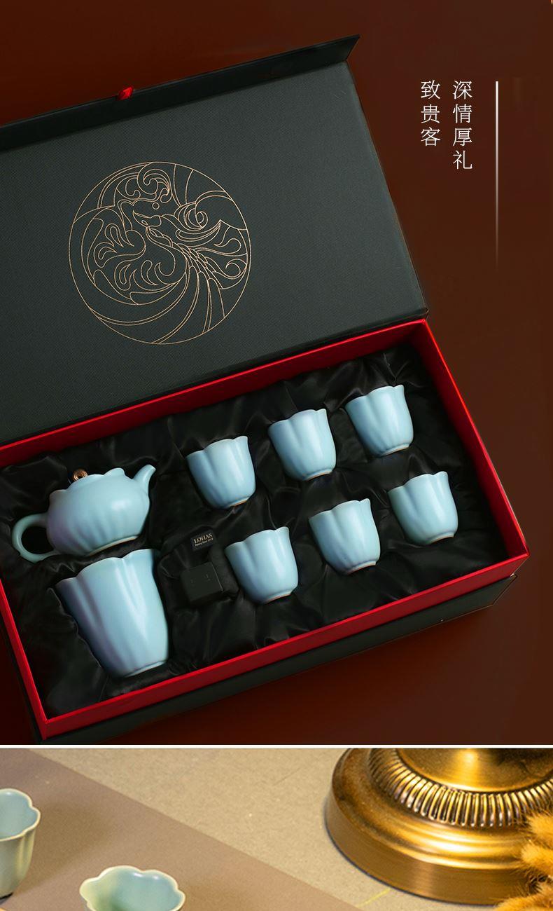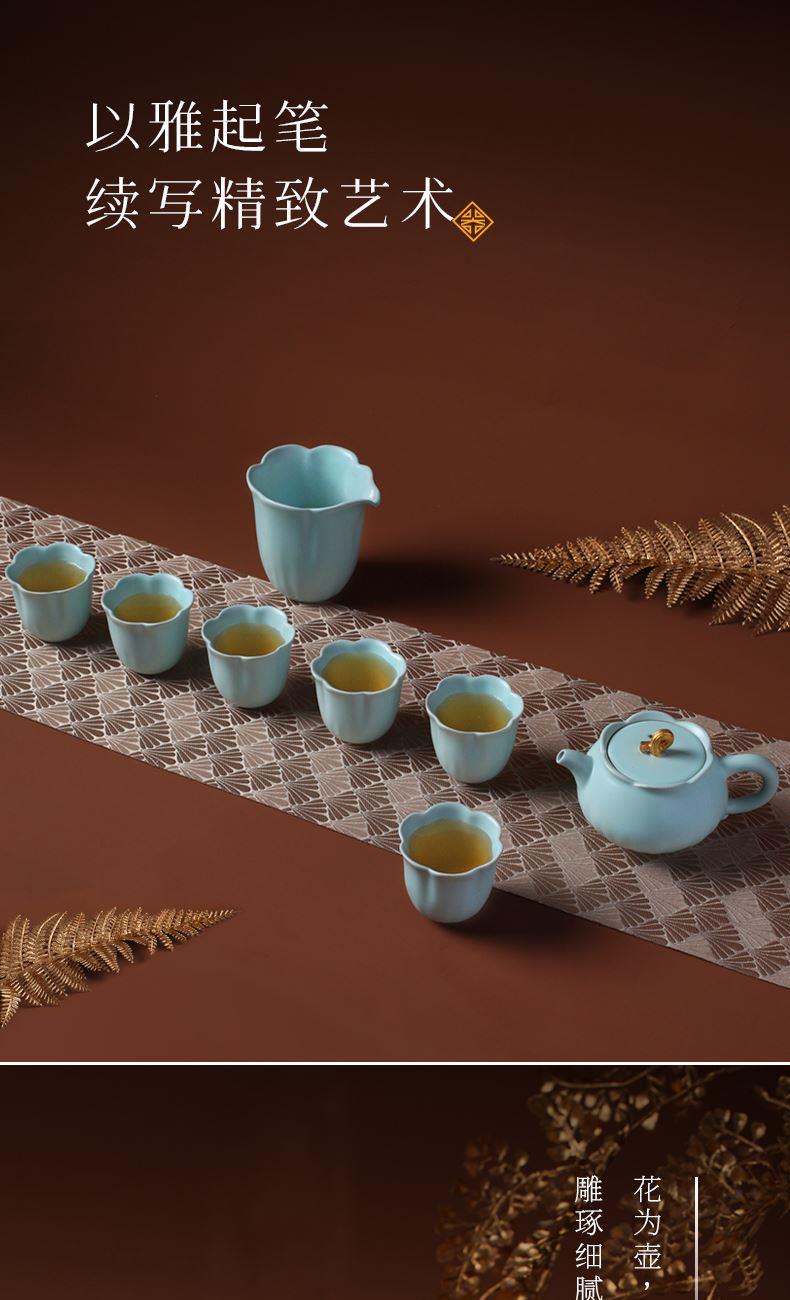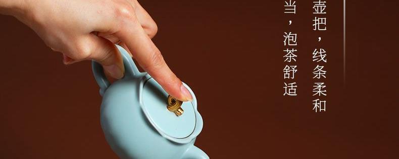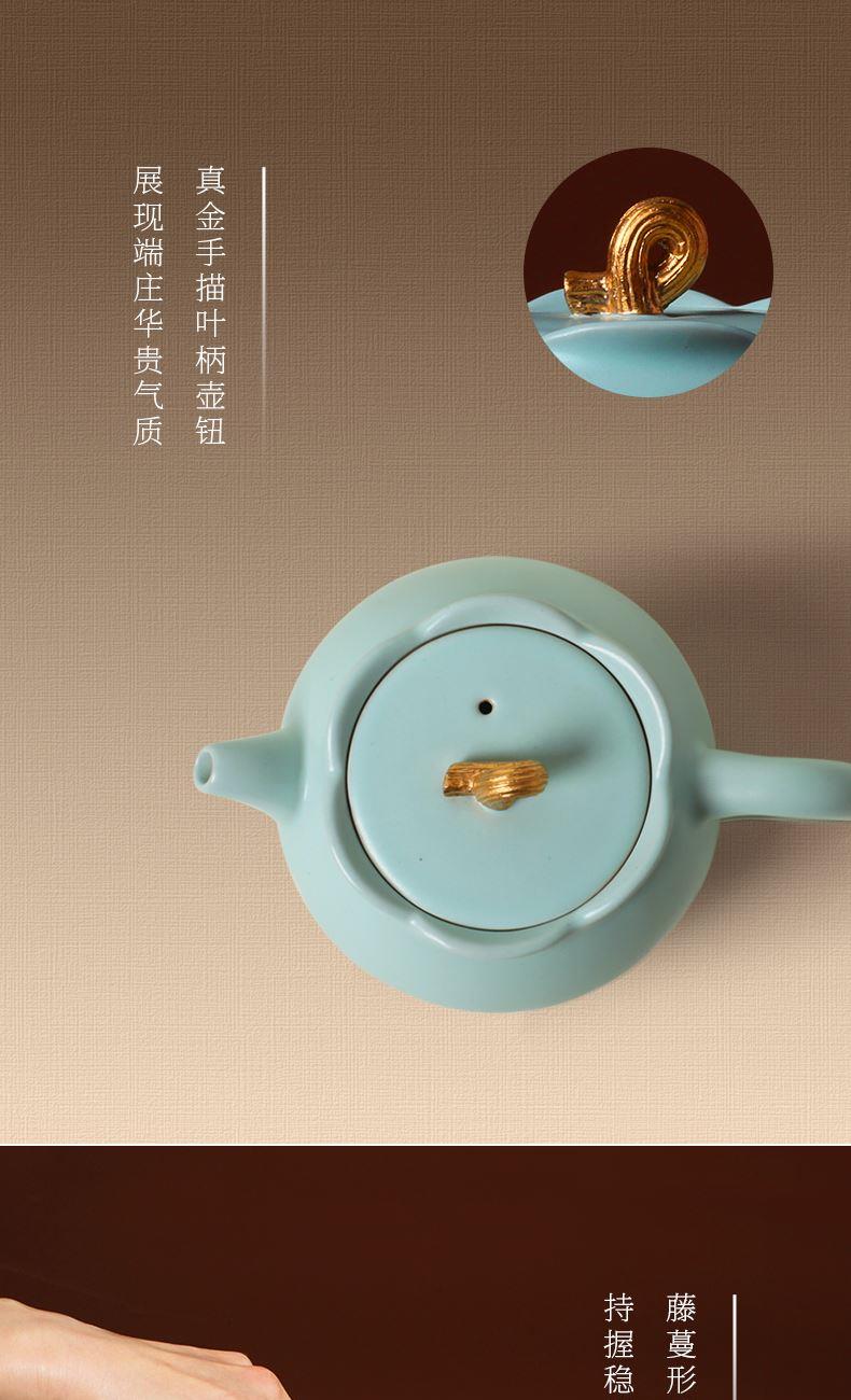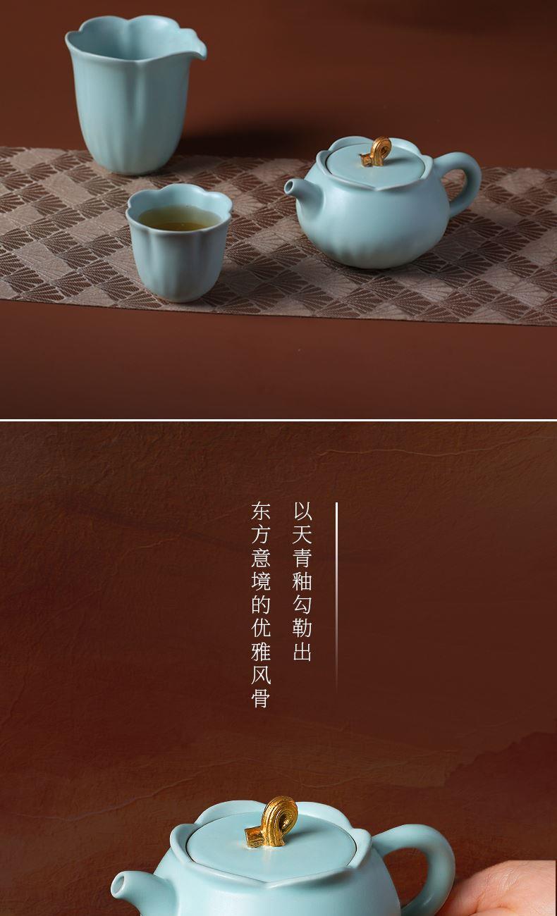 清荷雅境茶组,正是这一美学精神的凝练之作——它以荷为形,借天青釉勾勒出东方意境的优雅风骨,又以真金手描点缀,赋予其奢华内敛的气质。执壶品茗,茶香氤氲,是对复古雅奢美学的细细品味,更是对现代精致生活的执着追求。 规格:壶×1,海×1,杯×6,活水球×1 颜色:天青色 容量:壶170ml