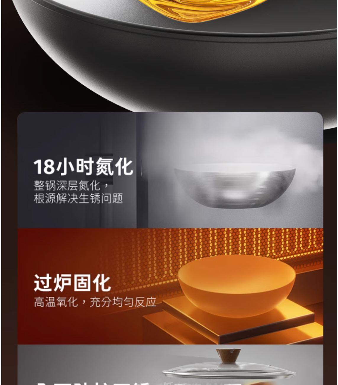 毛重:2.54 净重:2.15 体积:0.013 大小:320*320*125 锅身采用深层氮化工艺,氮化层厚度达到20um使锅表面形成氮化铁+氧化铁的保护层双倍防锈,更耐用 自研氮化技术精铁耐腐蚀 安全零氟安心炒,更健康。 精铁锅具无需复杂养护,日常使用就是在养锅。 厚底薄壁均匀传热,锅体受热,不易糊焦