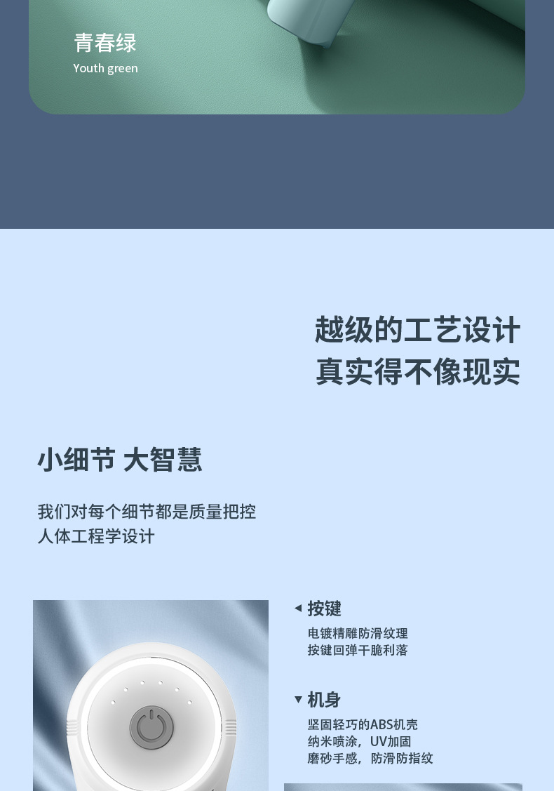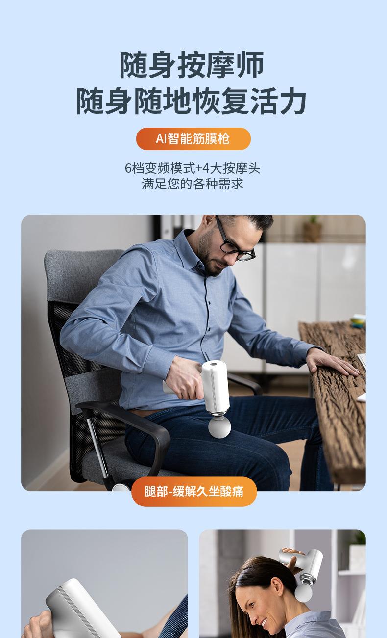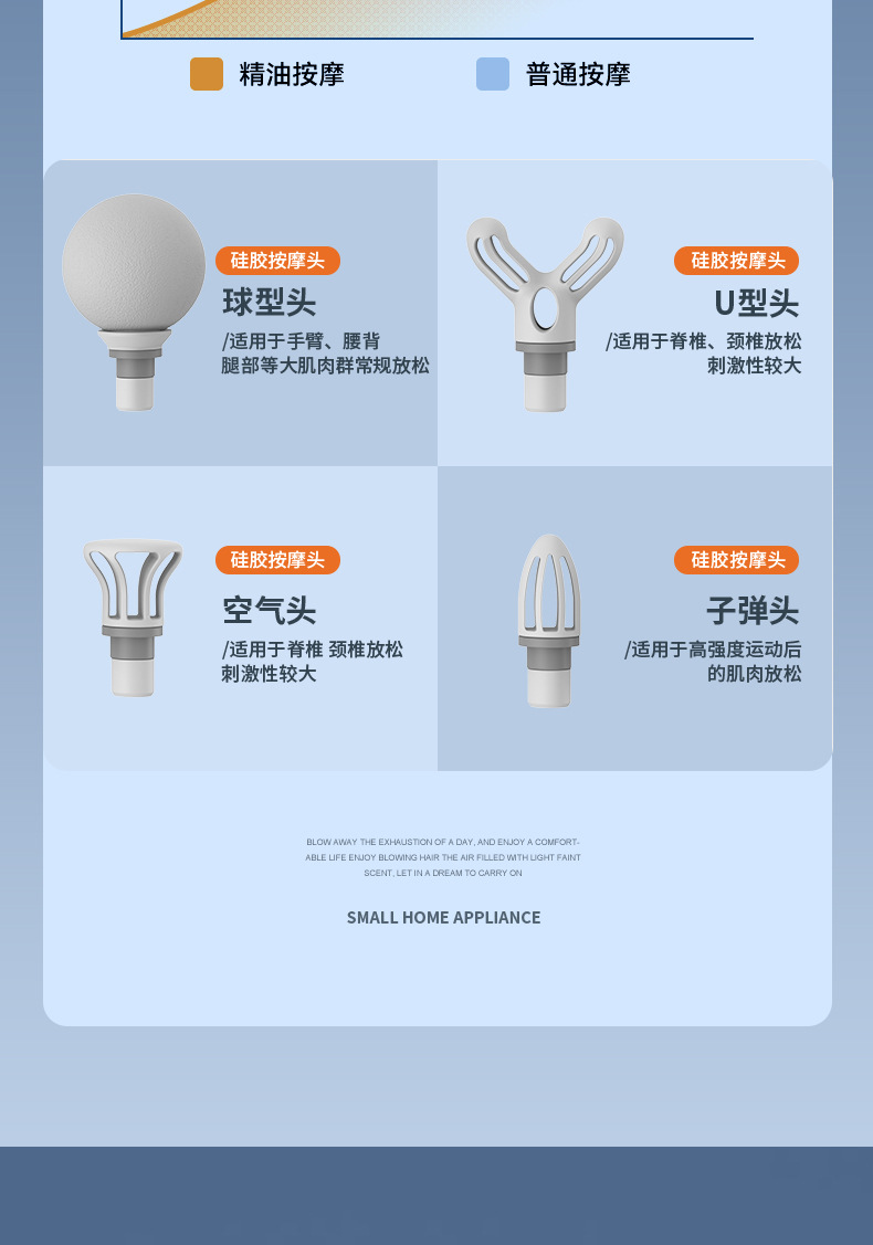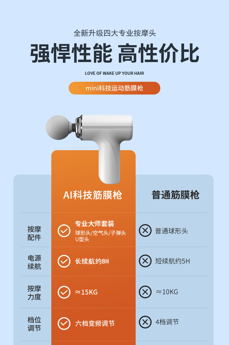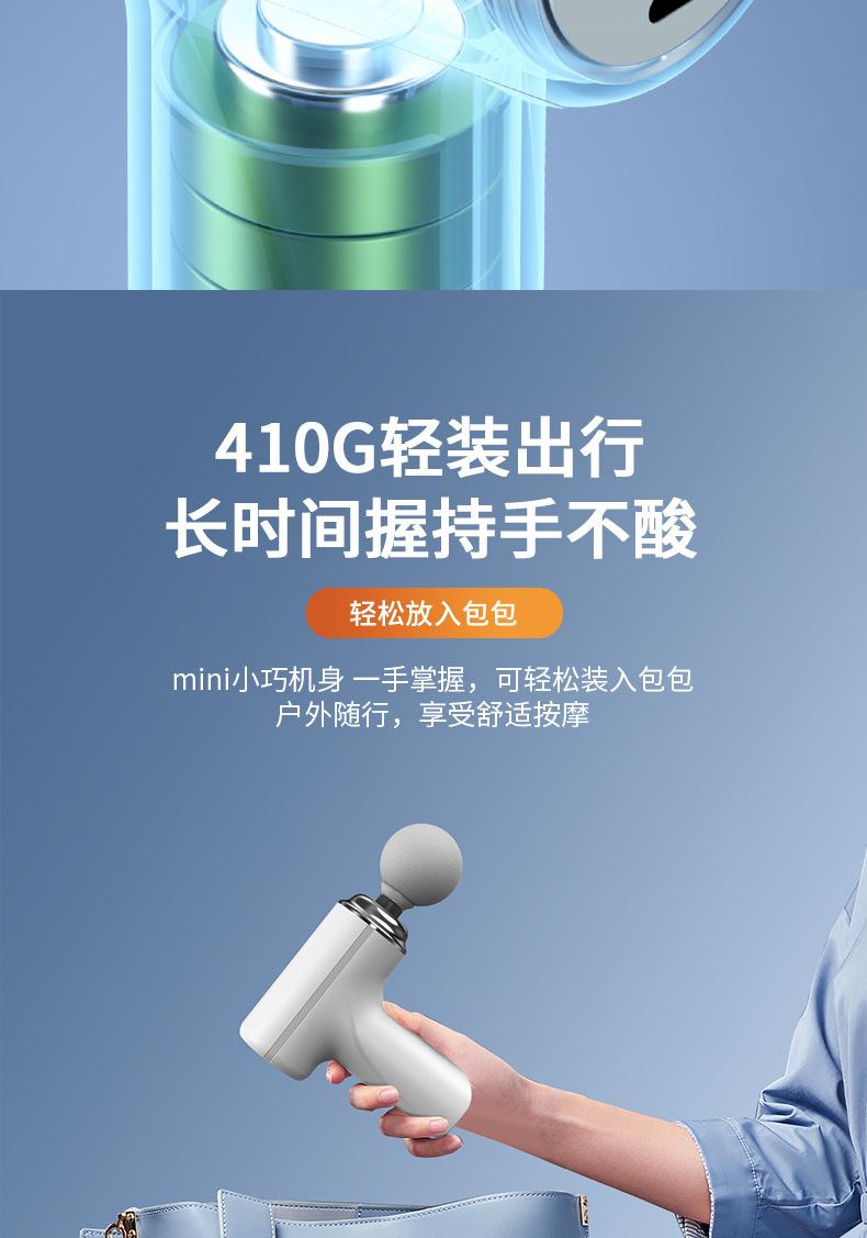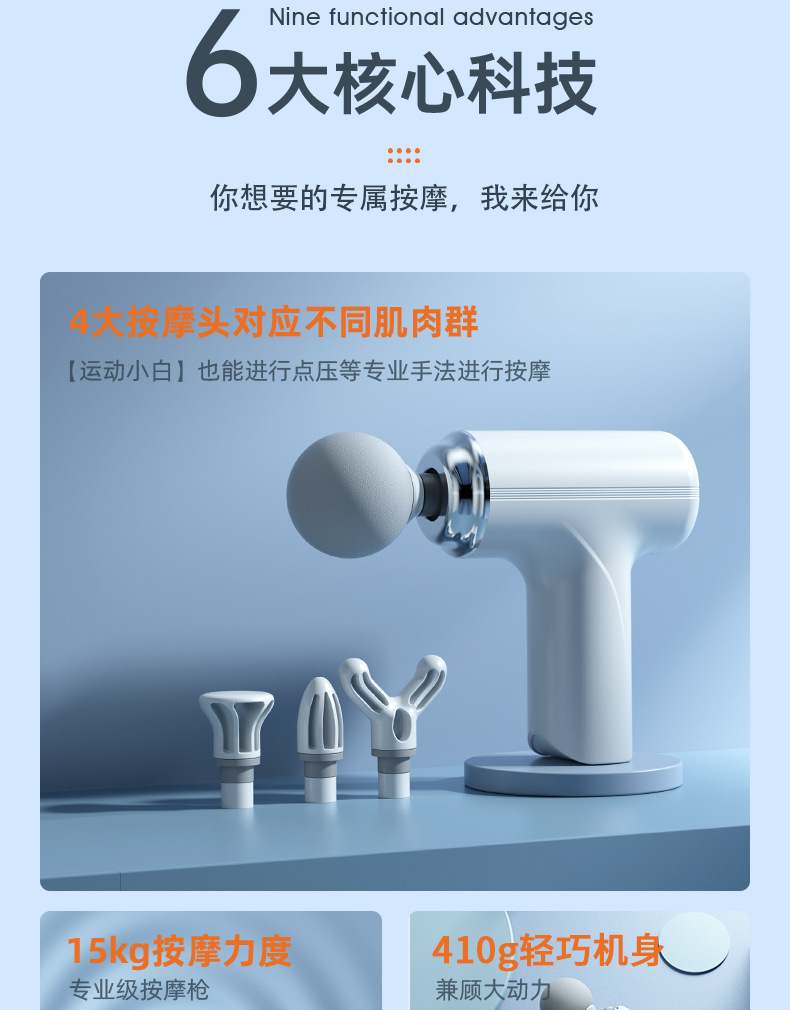 型号:WD-A10 材质:机身ABS 电压:5V 转速:1800-3000转 电池:1200mha 净重:0.46kg 升级版锂电池安全节能充电更快 精美氛围灯 一键掌控,6档科学频率真调整 进口智能芯片,静音电机 四种专业按摩头;小巧玲携带轻便