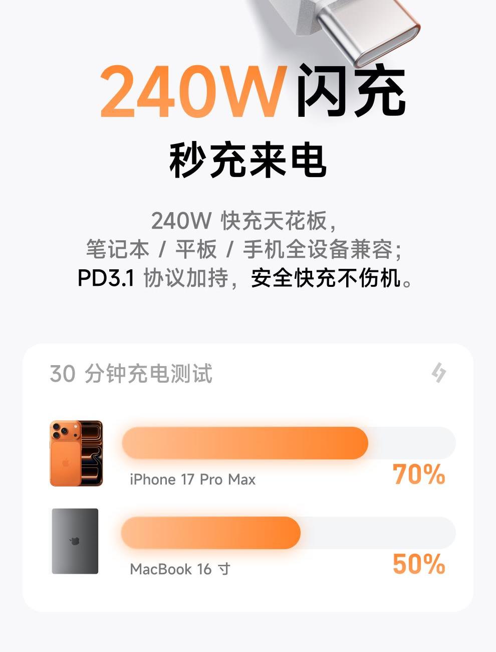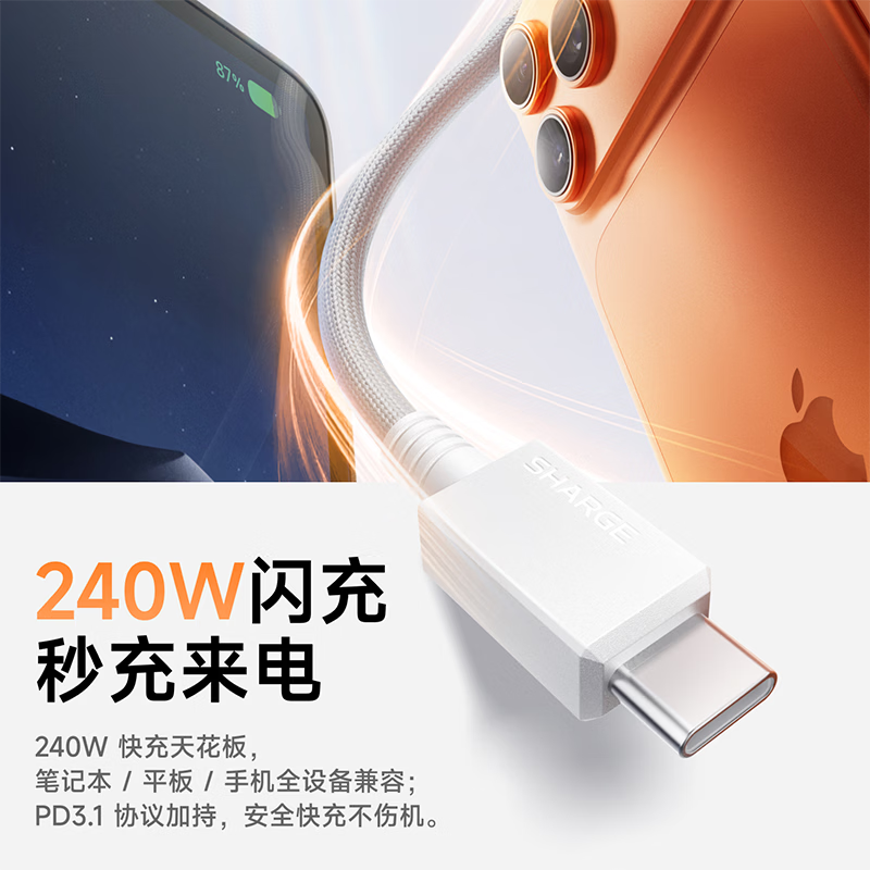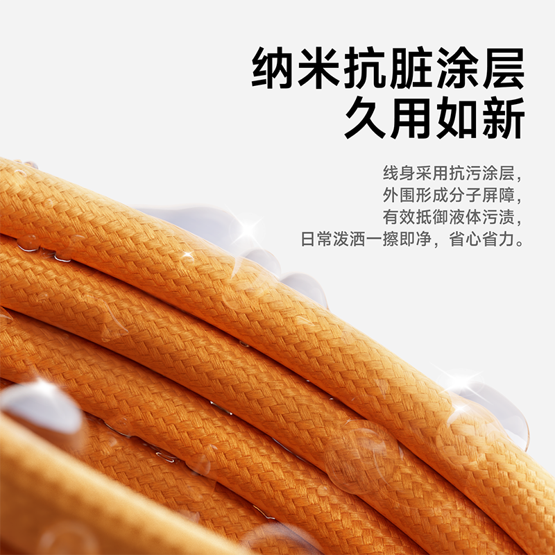 PD3.1协议,240W快充 纳米抗脏涂层编织线,坚韧耐用 E-Marker芯片,智控畅享安全快充 480Mbps传输数据,秒传不等待 手机、平板、笔记本,PD3.1安全快充不伤机 线身内置磁吸条,松手自动吸附收纳