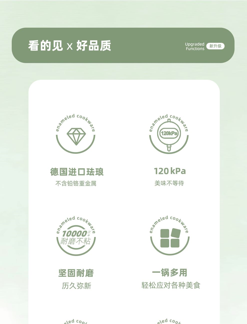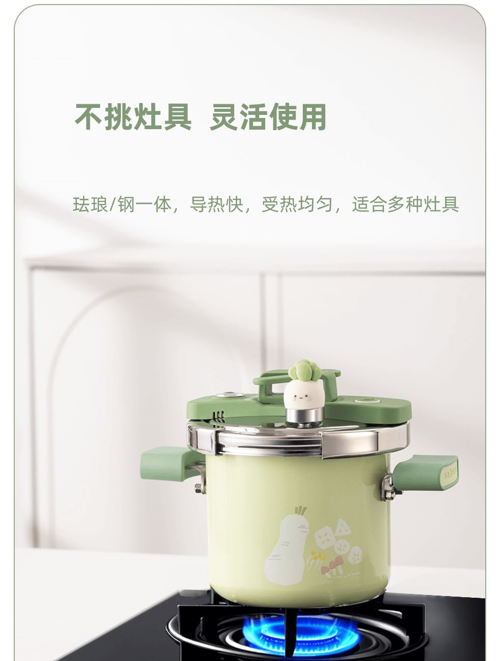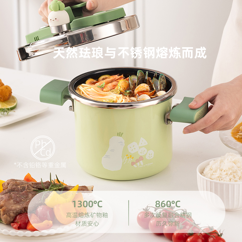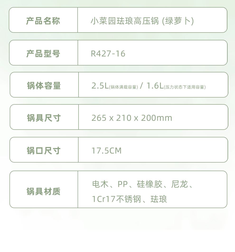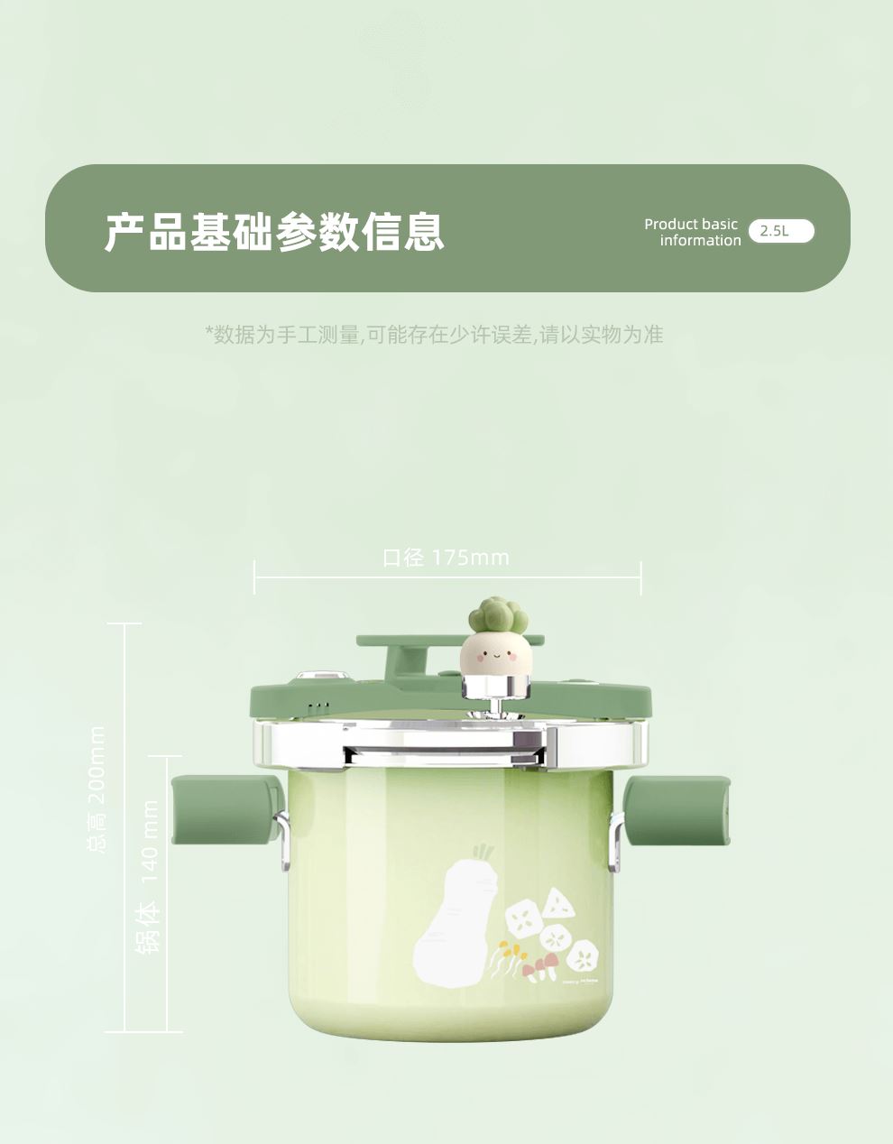产品容量:2.5L 产品材质:锅身:10Cr17不锈钢、珐琅、 锅盖:不锈钢+硅胶+尼龙+玻纤 把手:电木+硅胶+尼龙+玻纤+201 1、德国进口珐琅;精致小巧,容量不凡 2、高压快炖,肉嫩味美 3、120KPA的高压设计,使得炖肉时间大大缩短,不仅快,而且炖出的肉质鲜嫩多汁,口感软糯,仿佛将肉质的鲜美锁在锅中,让人一尝难忘。 4、旋转开并,安全便捷 5、独特的旋转开关设计,不仅增加了使用的安全性,避免了误操作导致的危险,而且操作起来简单方便,即便是厨房新手也能轻松上手。