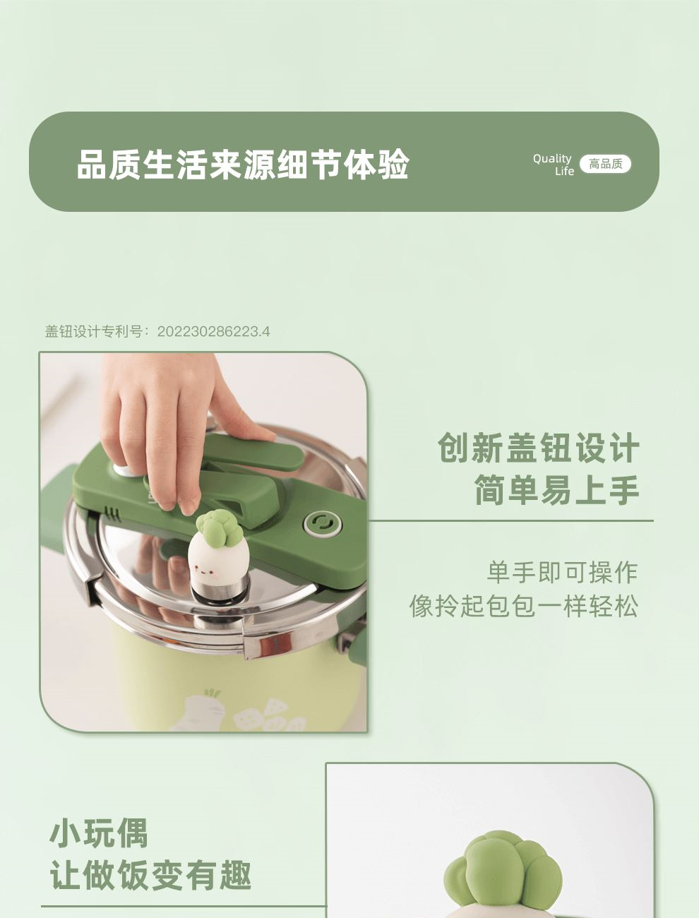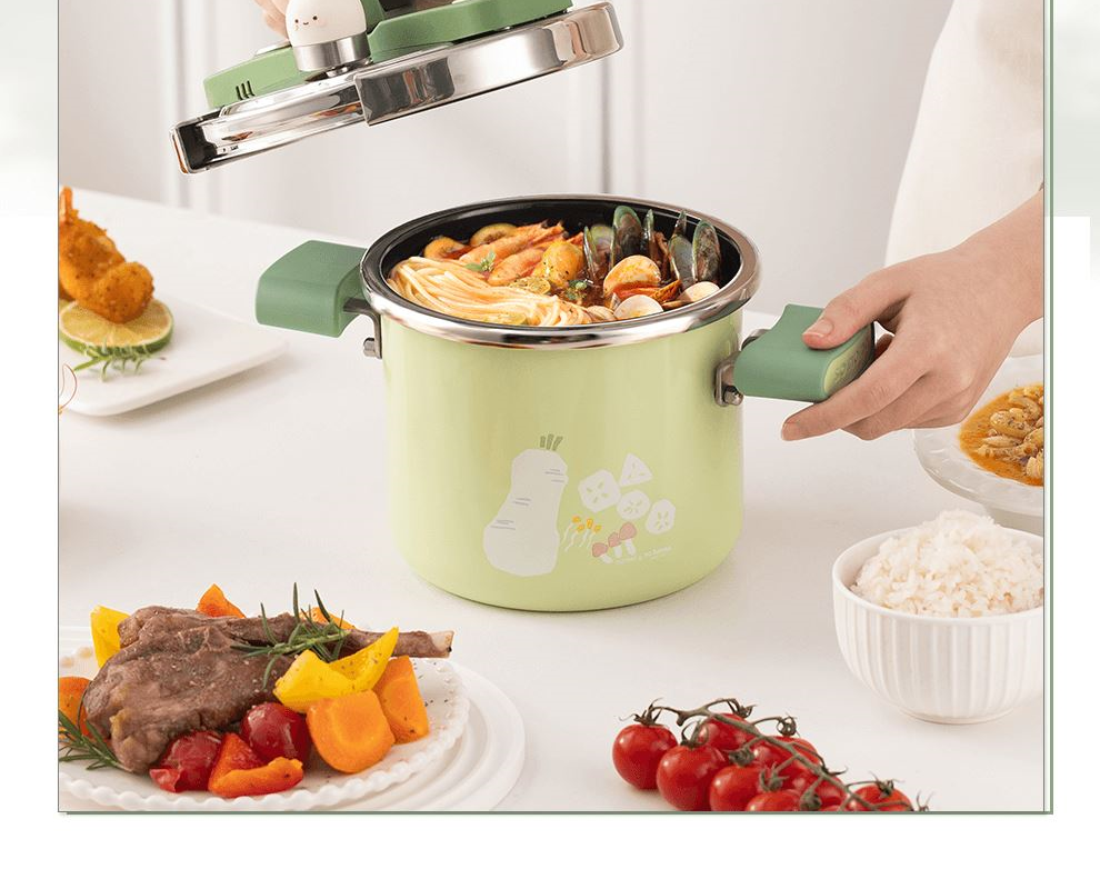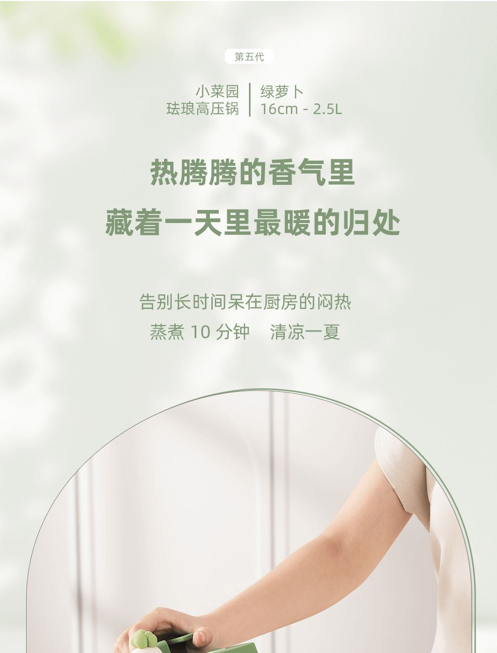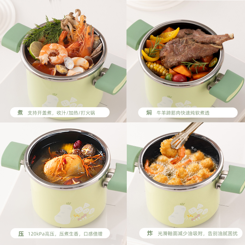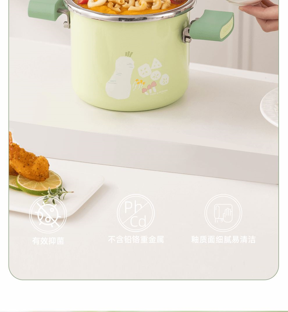产品容量:2.5L 产品材质:锅身:10Cr17不锈钢、珐琅、 锅盖:不锈钢+硅胶+尼龙+玻纤 把手:电木+硅胶+尼龙+玻纤+201 1、德国进口珐琅;精致小巧,容量不凡 2、高压快炖,肉嫩味美 3、120KPA的高压设计,使得炖肉时间大大缩短,不仅快,而且炖出的肉质鲜嫩多汁,口感软糯,仿佛将肉质的鲜美锁在锅中,让人一尝难忘。 4、旋转开并,安全便捷 5、独特的旋转开关设计,不仅增加了使用的安全性,避免了误操作导致的危险,而且操作起来简单方便,即便是厨房新手也能轻松上手。