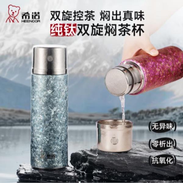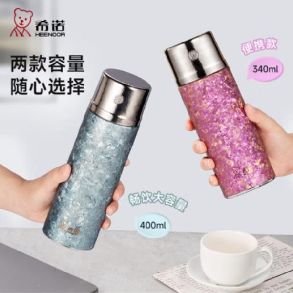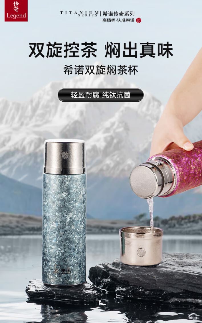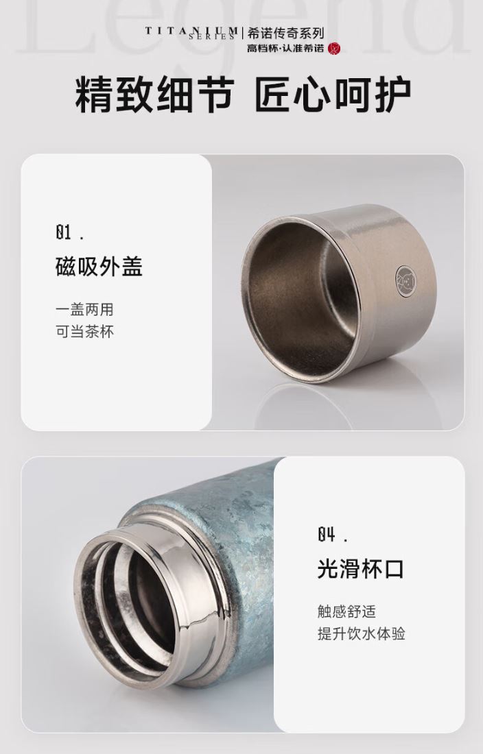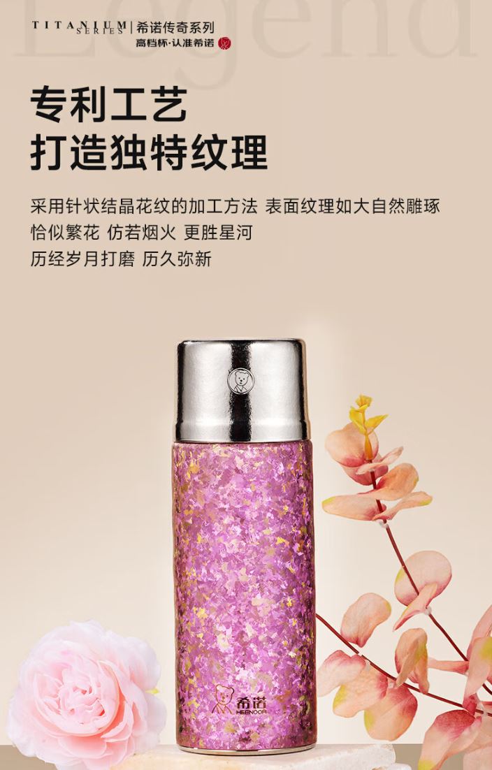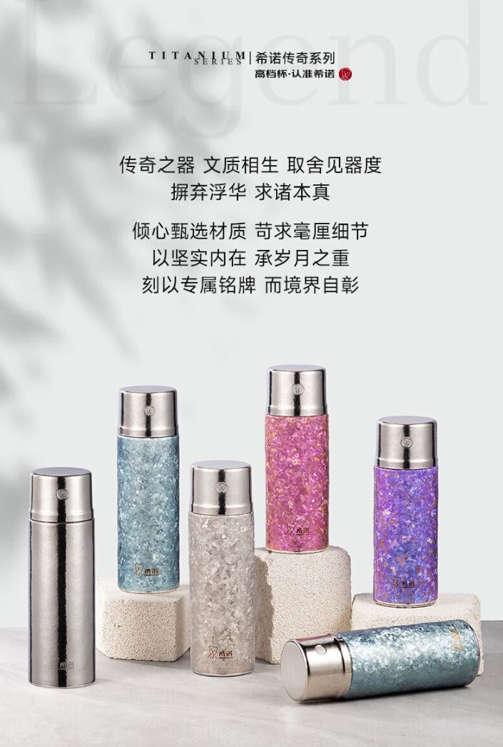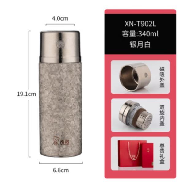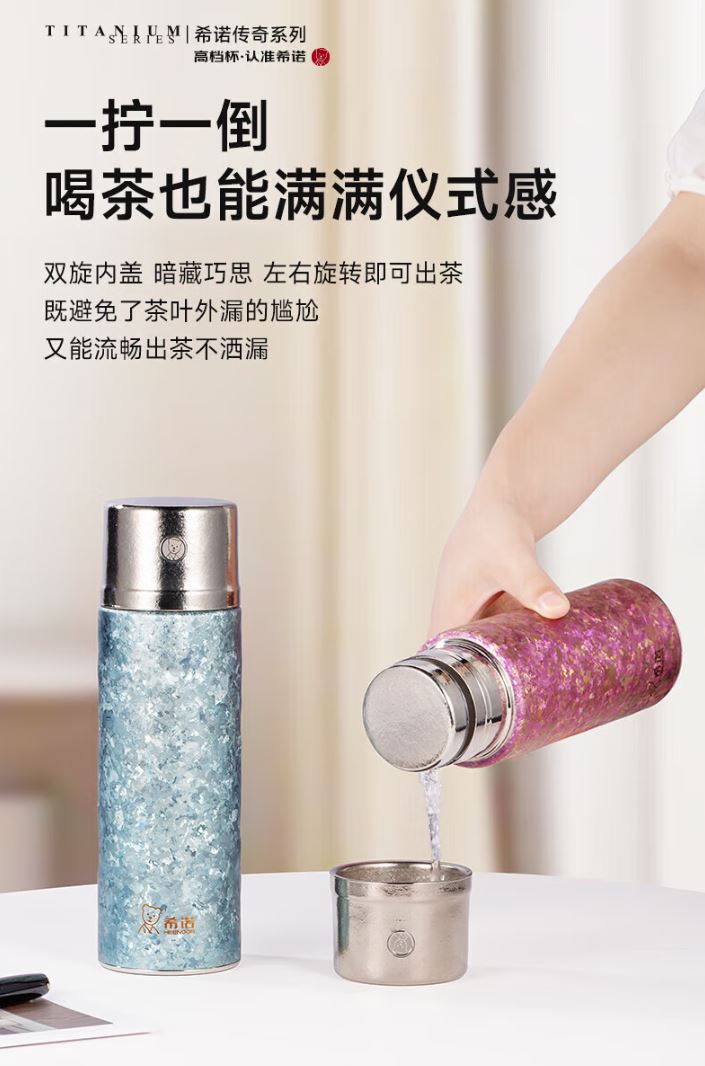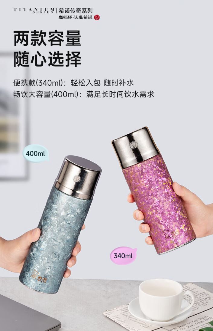 产品规格: 材质: 杯体-纯 钛/杯盖-食品级PP、纯钛TA1、食品级硅胶 规格(mm) XN-T903L:40(杯口直径)x66(直径)x214.1(高度) 颜色: 云海雾凇,银月白,远天蓝,玫洛粉,薰衣草紫 容量: XN-T903L:400ml 保温效能: XN-T903L:6小时≥50℃