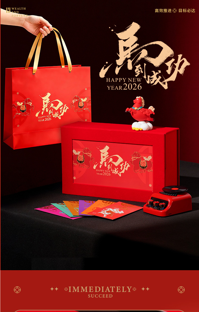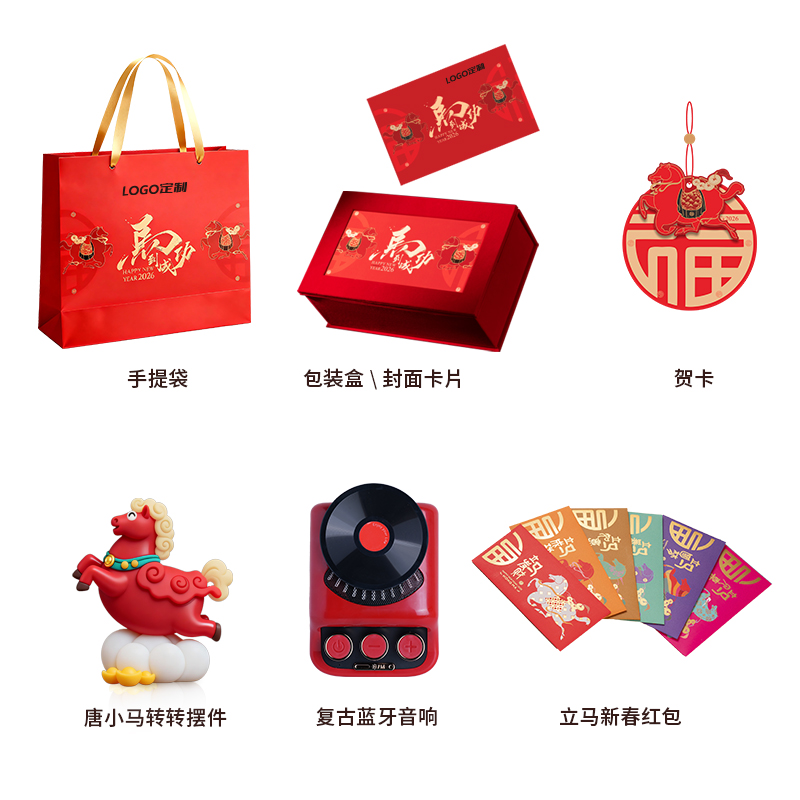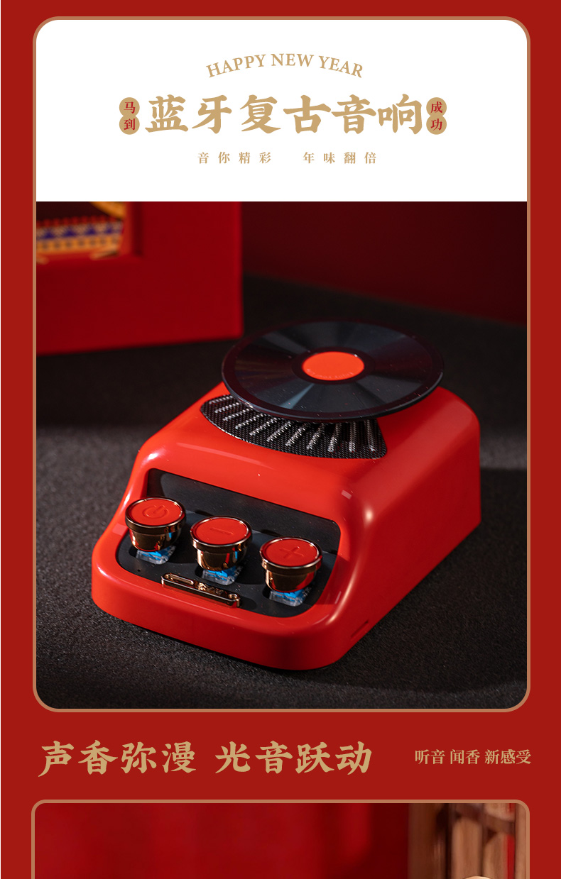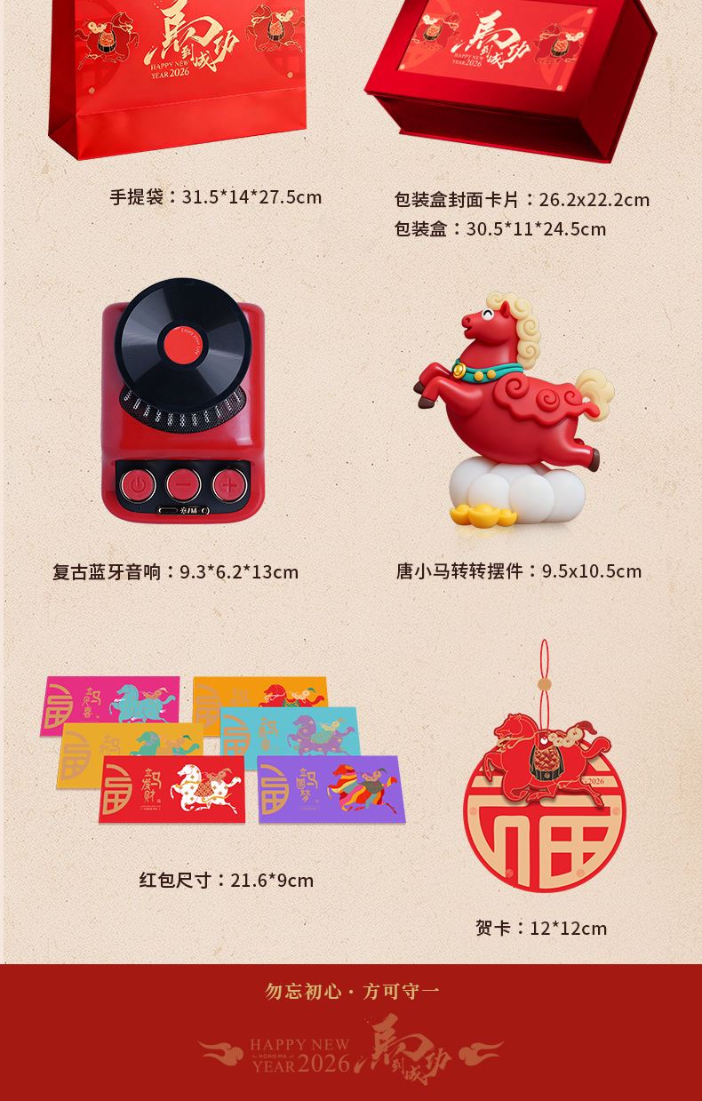 1、好运复古蓝牙音箱:蓝牙、氛围灯、趣味按键 2、马到成功桌面摆件 3、新年红包*6:开启新年好运程 4、绒面礼盒:日历功能、收纳功能 用完不闲置, 注:礼盒可专版定制画面