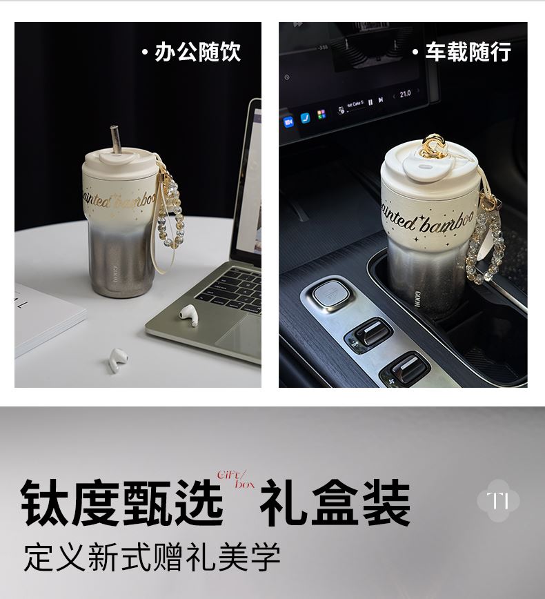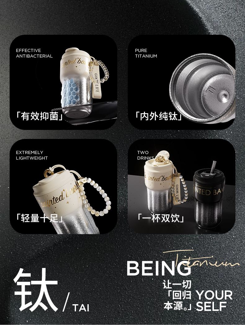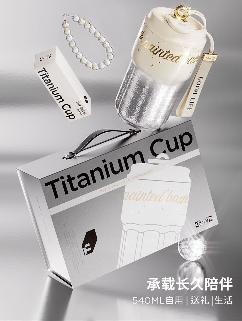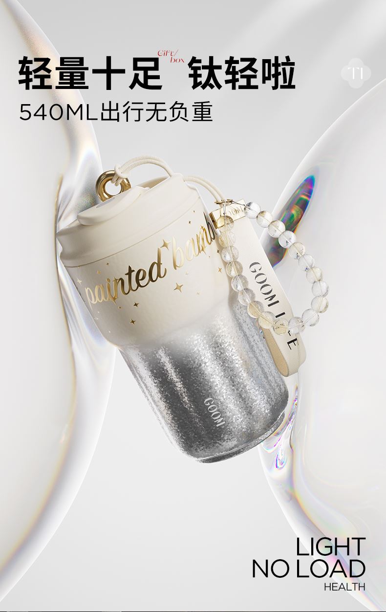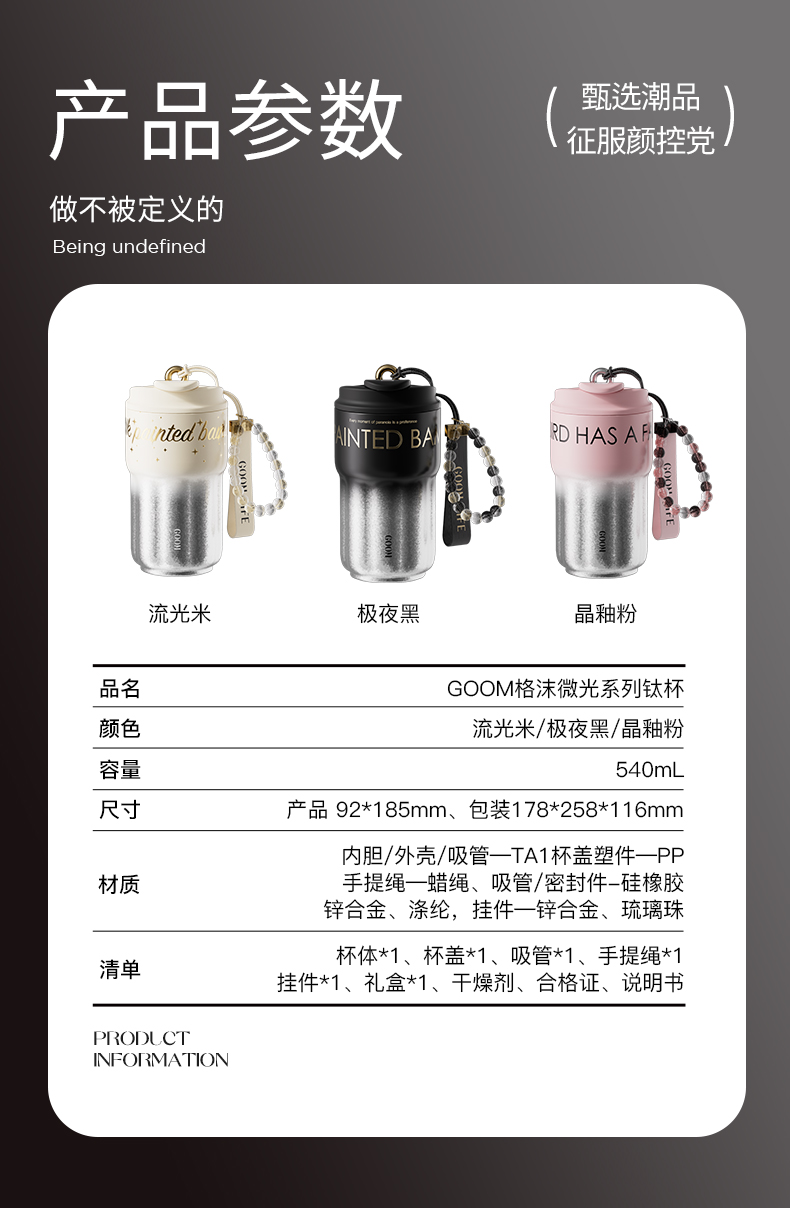 型 号:GM-25AW-B17 颜 色:极夜黑/流光米 材 质:内胆/外壳/吸管—TA1,杯盖塑件— PP聚丙烯(丙烯均聚物),吸管/密封件-硅橡胶,手提绳—蜡绳、锌合金、涤纶,挂件—锌合金、 琉璃珠 容 量:540ml 1、一杯三饮:敞口痛快喝、直饮口防呛、精致吸管口不花妆 2、密封防漏:360密封,多重防漏,丢进包里安心不漏水 3、安心材质:内胆/外壳/吸管TAI材质,安全无异味 4、科学容量:540ml钛式平衡,轻量杯身装足全天饮量 5、礼盒装备:藏于日用,钛杯承载长久陪伴 6、琉璃珠链:防烫拎手+防丢神器,微闪珠光为日常添彩