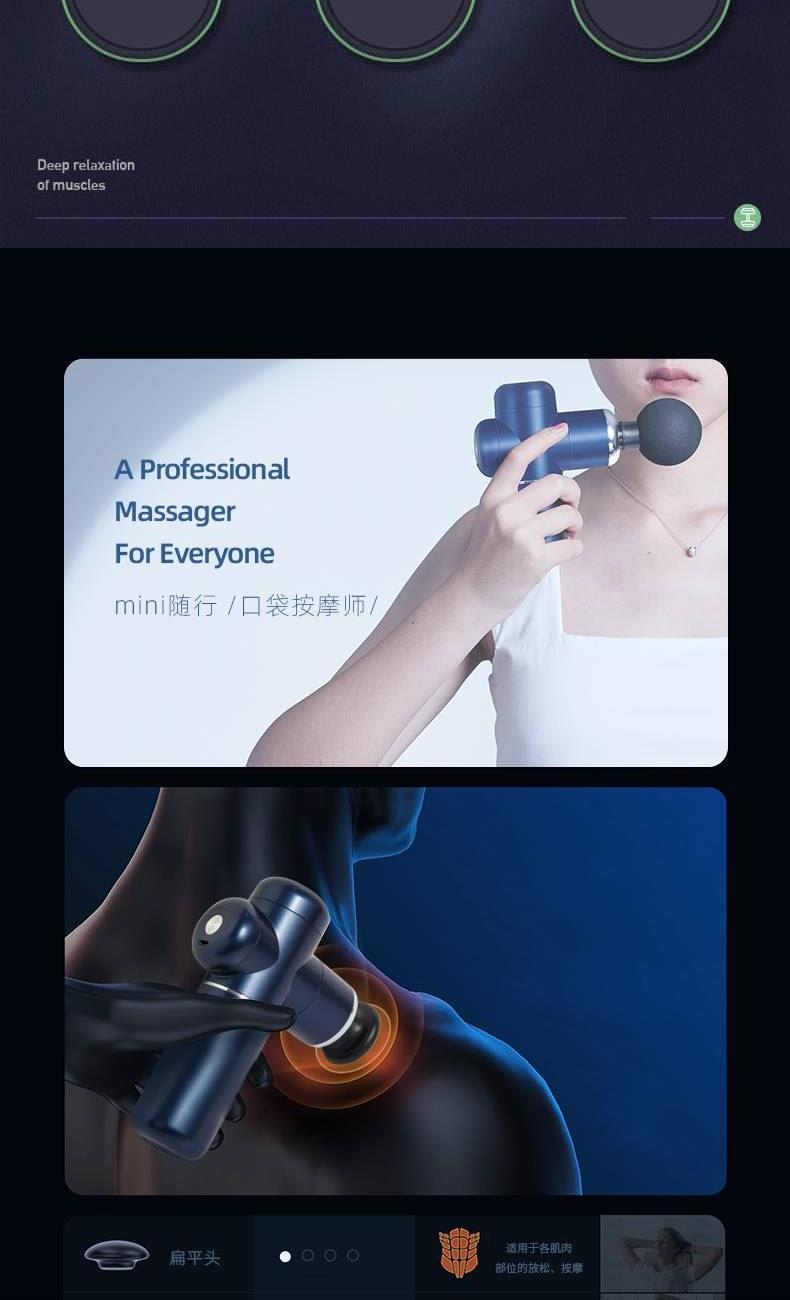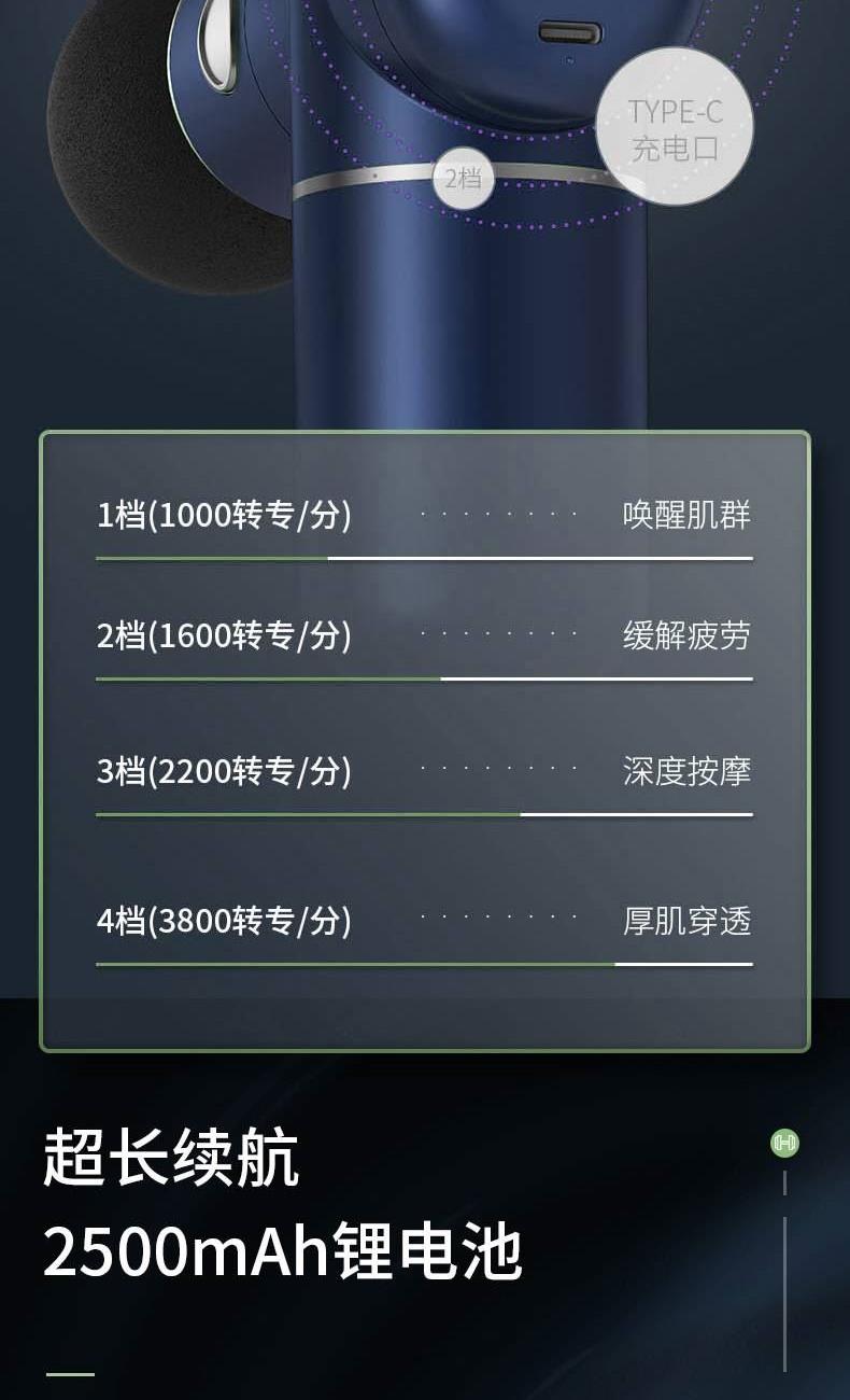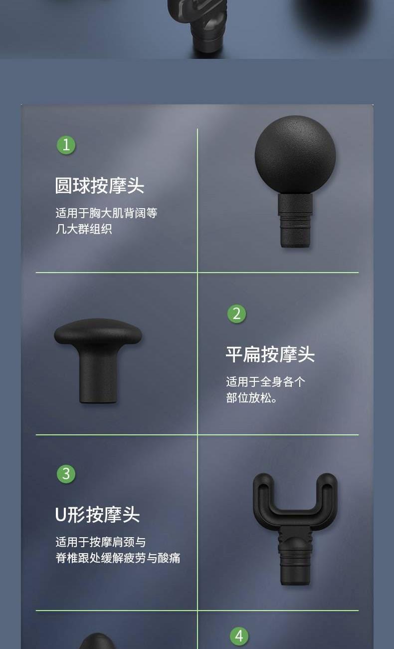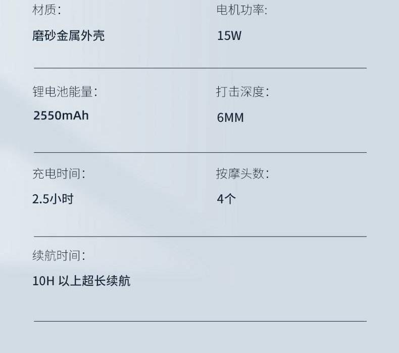 型号 MF3105 净重 390g 毛重 700g 包装尺寸 19.5x19.5x6.2cm 大箱尺寸 50x40x21cm 续航:≈10h 充电时间:2小时±0.5小时 充电电压:5V2A 额定功率:15w 充电接口:Type-C 电池容量:2550毫安 执行标准:GB31241-2014 配件:主机,按摩头*4,充电线