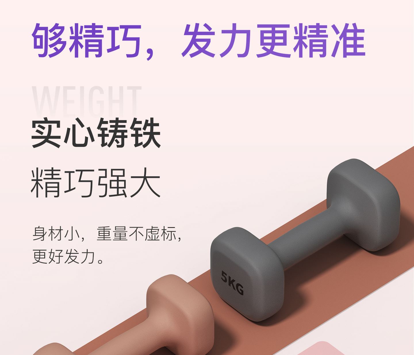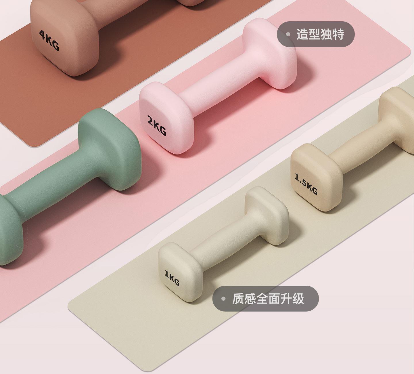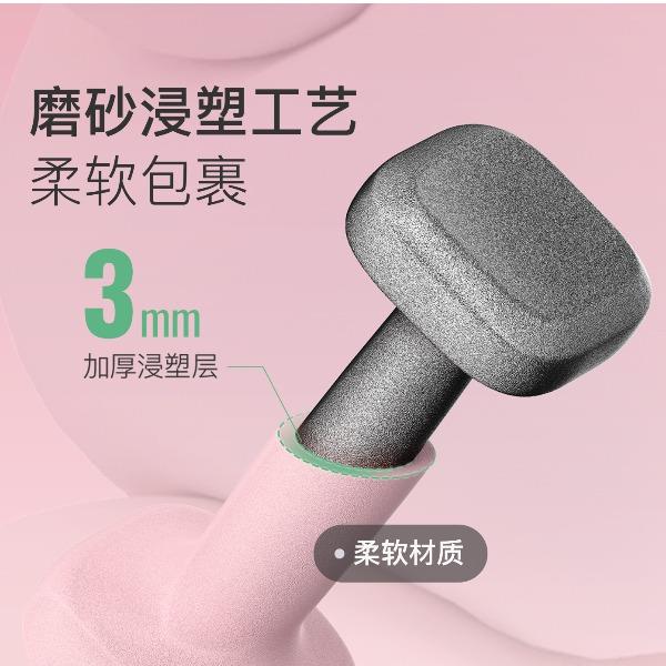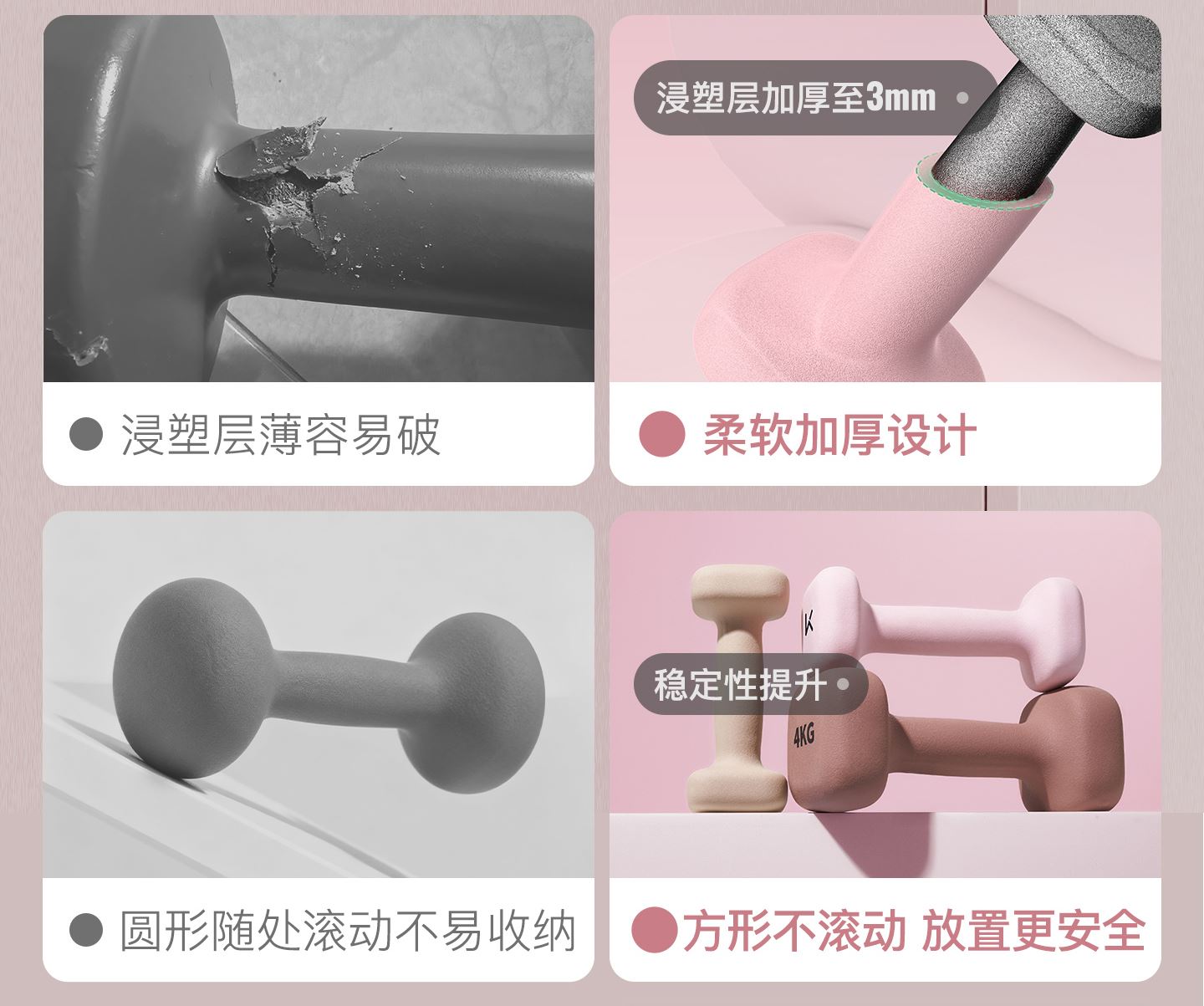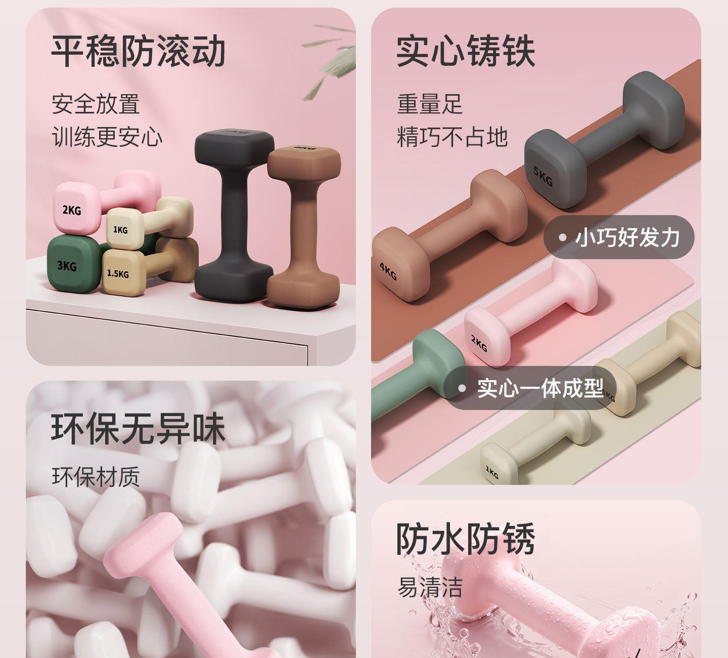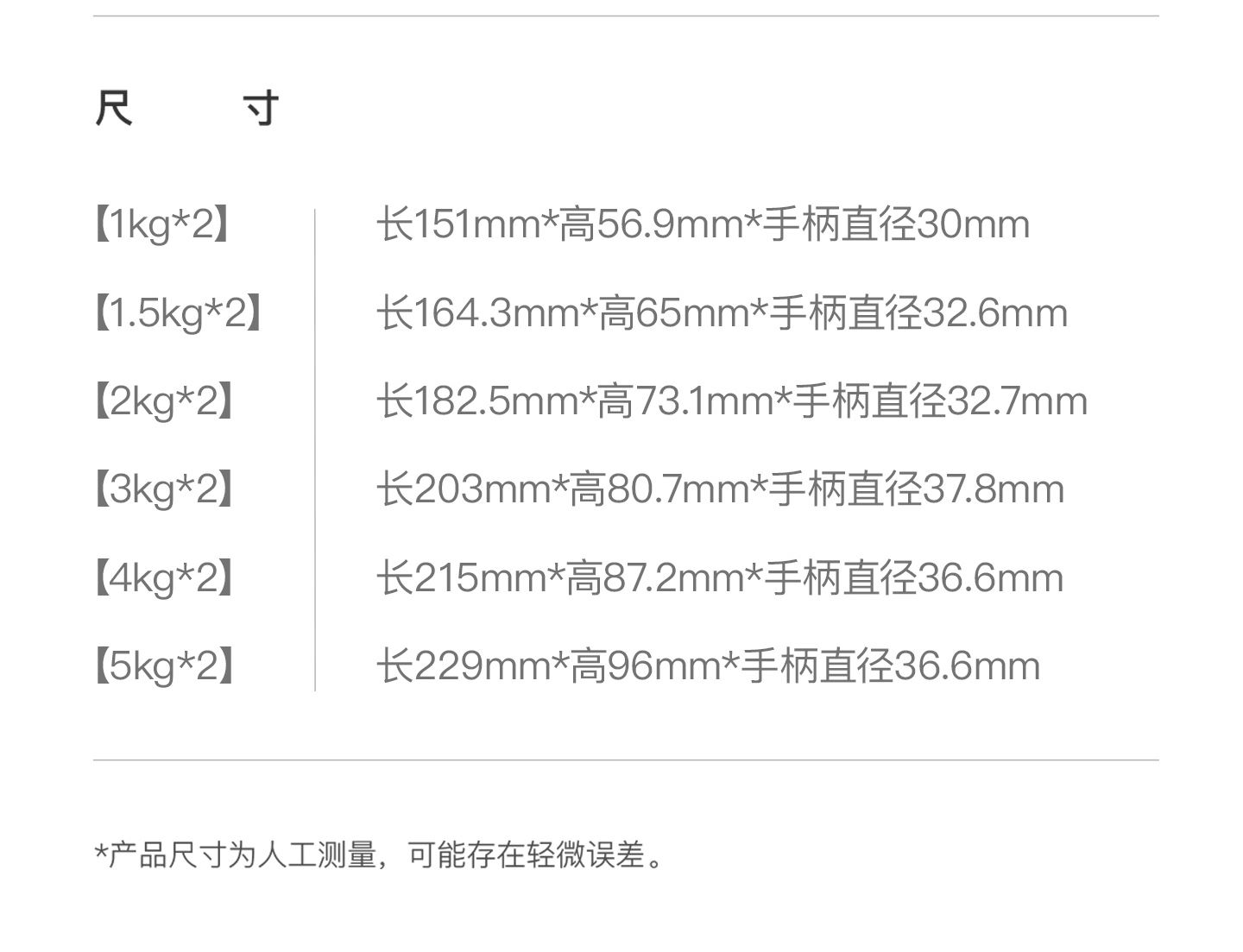 实心铸铁PVC环保无毒材质 浸塑层增厚至3mm 方形结构不宜滚动立放也能收纳弧形握把贴合手掌 握感全新升级 1.5KG*2