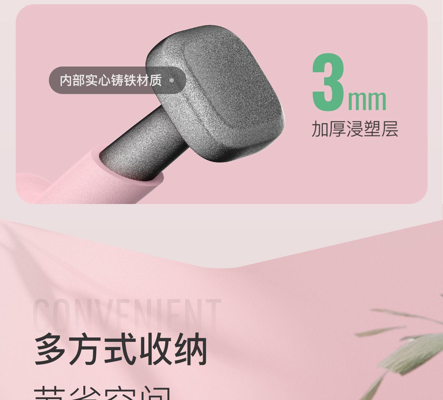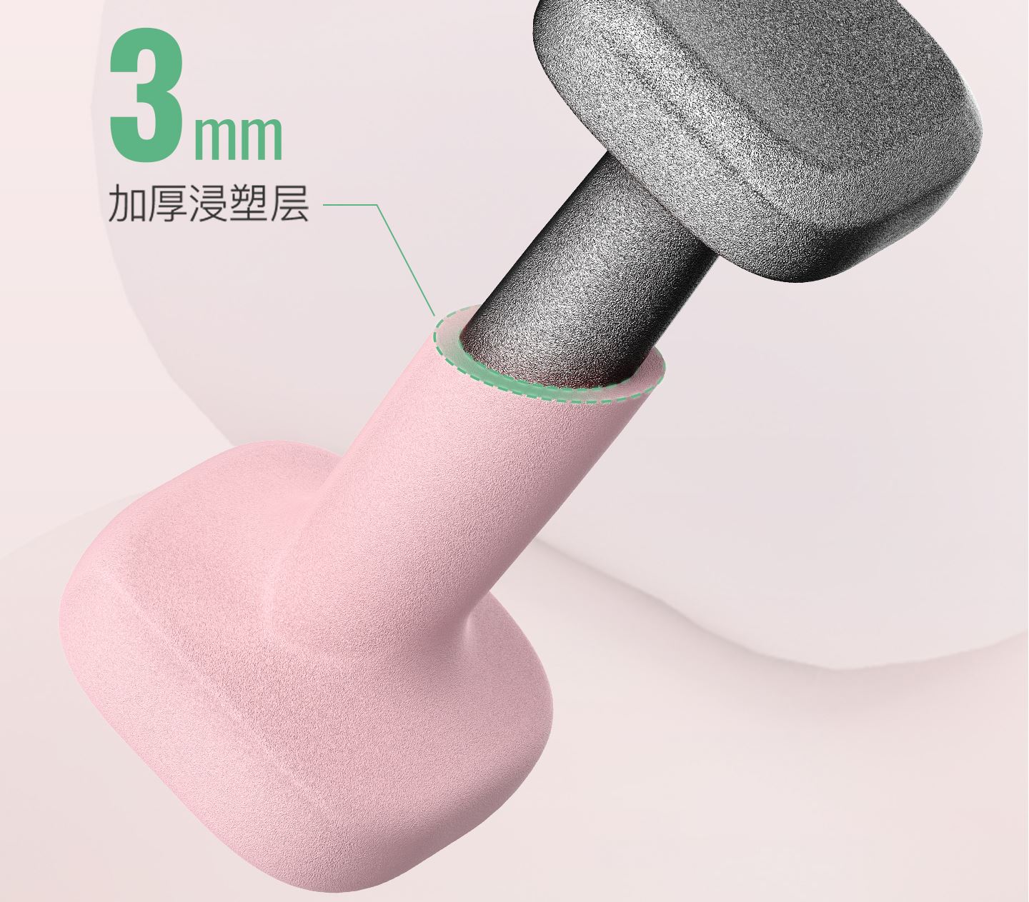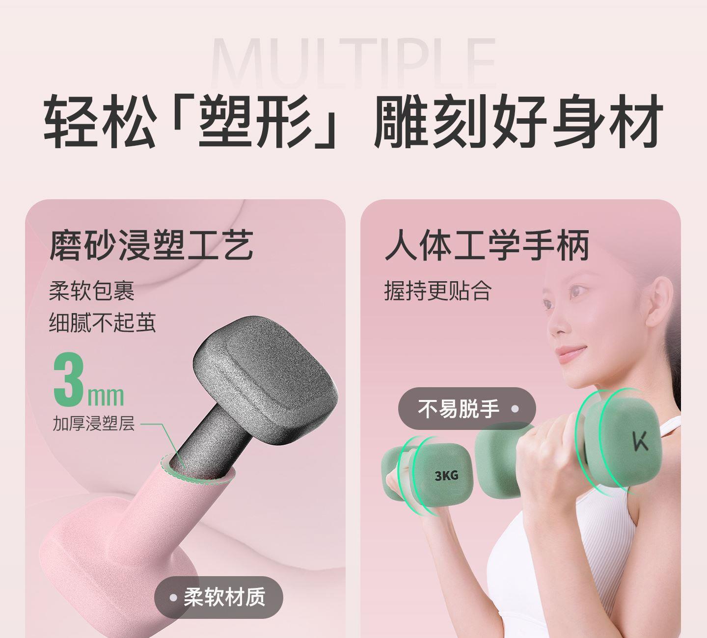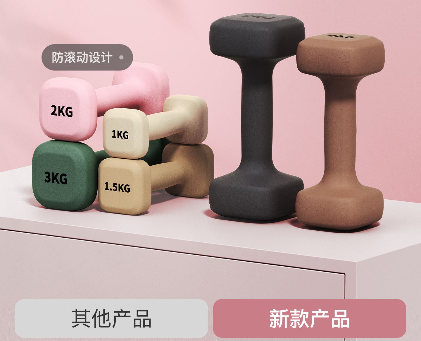 实心铸铁PVC环保无毒材质 浸塑层增厚至3mm 方形结构不宜滚动立放也能收纳弧形握把贴合手掌 握感全新升级 1.5KG*2