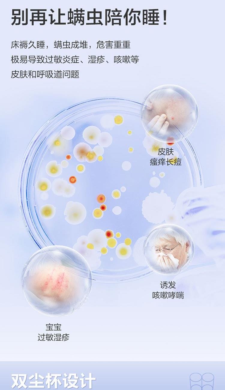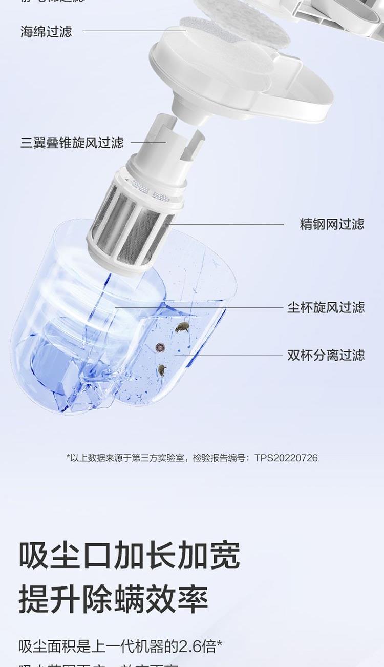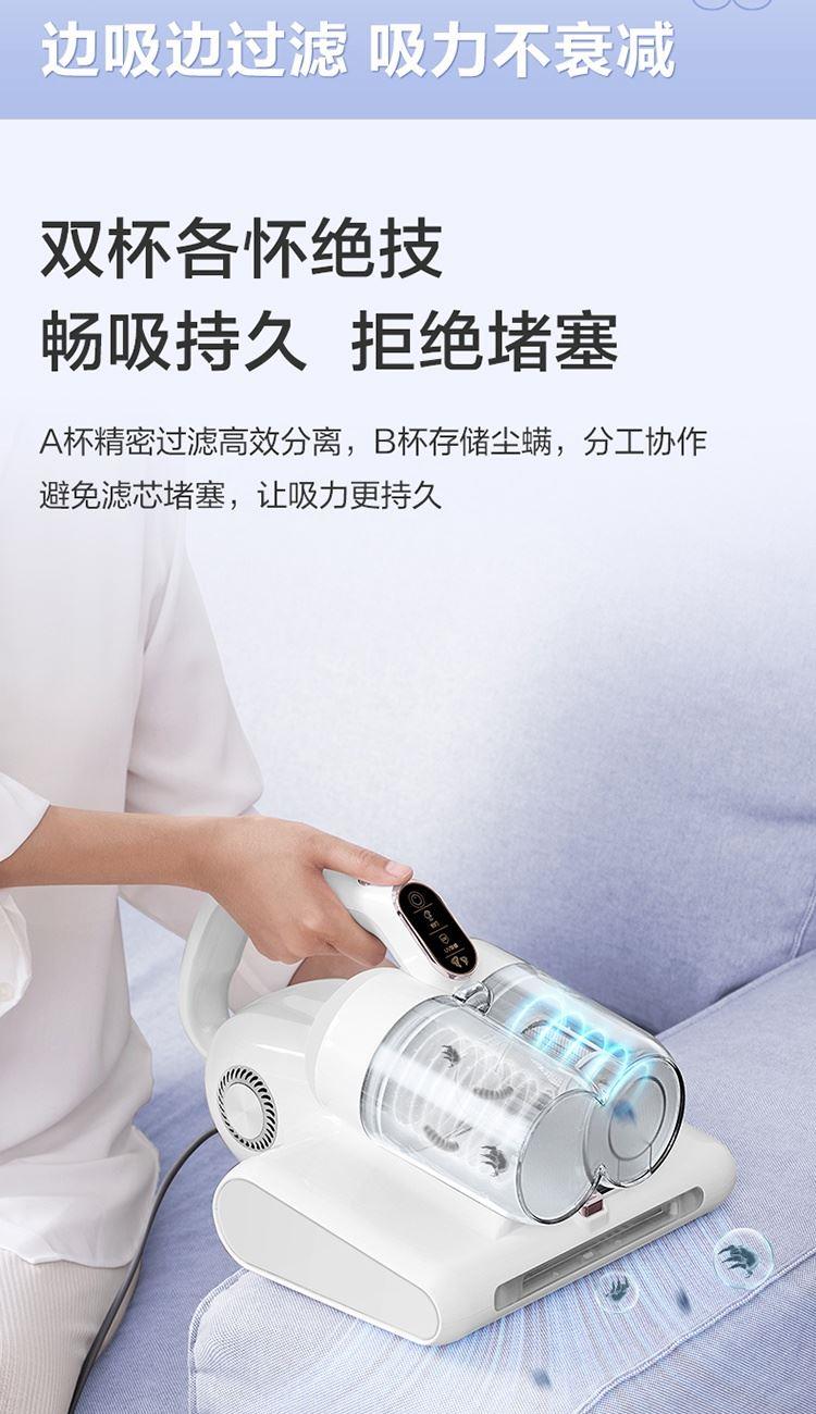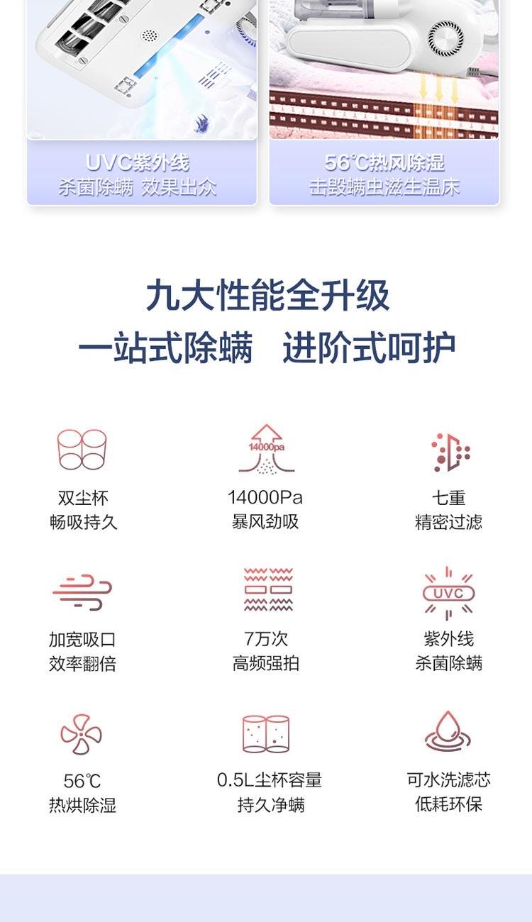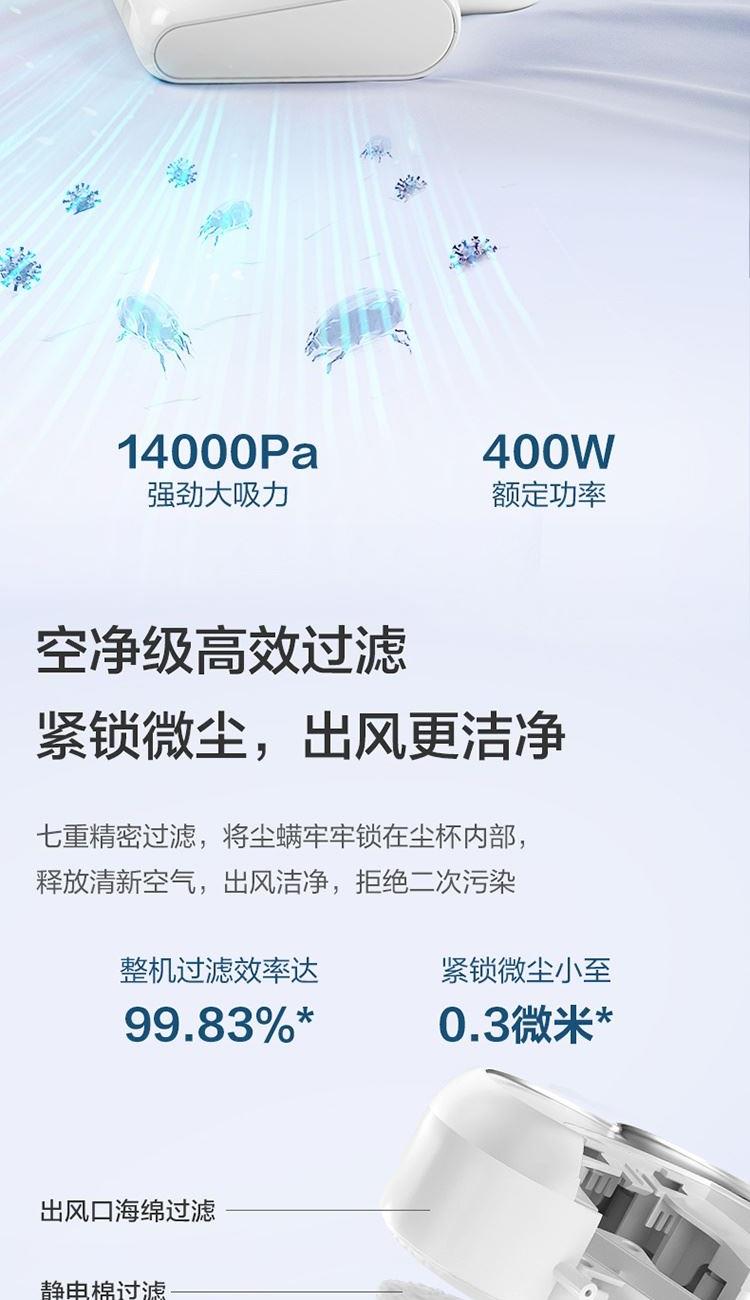 电源线长: 5m 尘杯容积: 400ml 滤芯材质: HEPA滤芯 电源线长: 4m 真空度: 14kPa 额定电压: 220V 额定功率:400W zui低噪音:82db 热风温度:55℃ 产品尺寸:24*31.1*19.4cm 拍打频次:70000次/分钟 1. 双尘杯设计深度除螨 高效洁)净