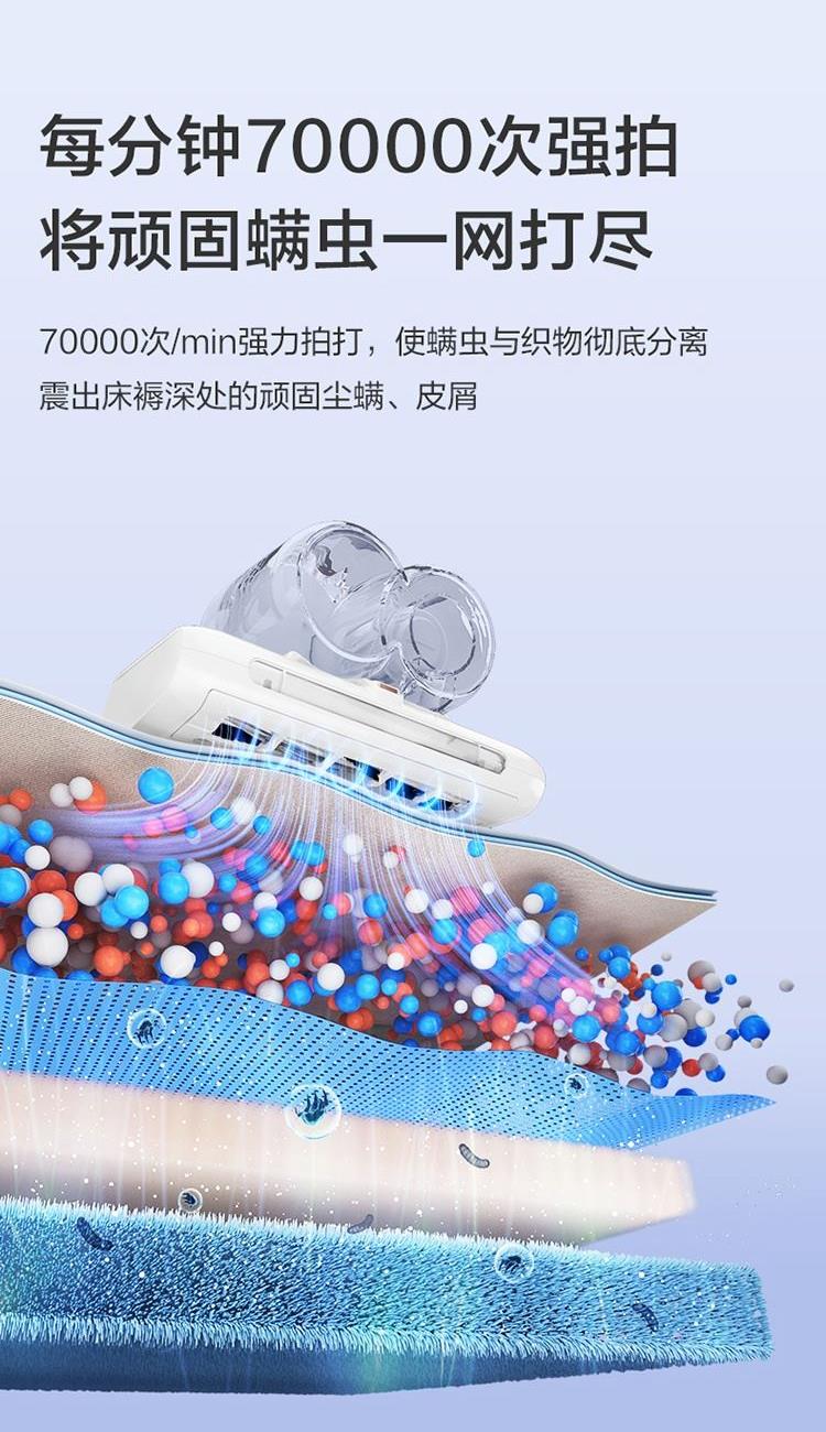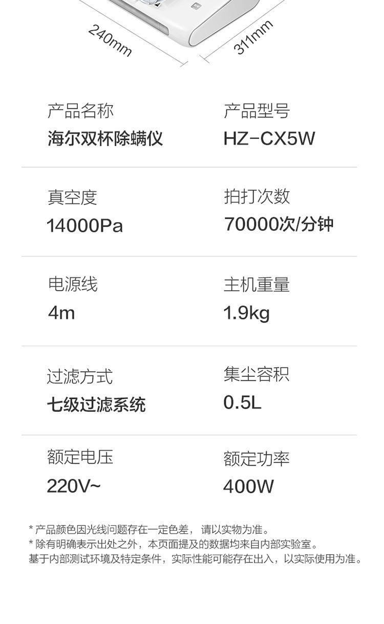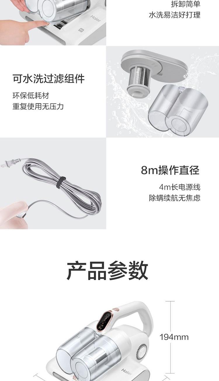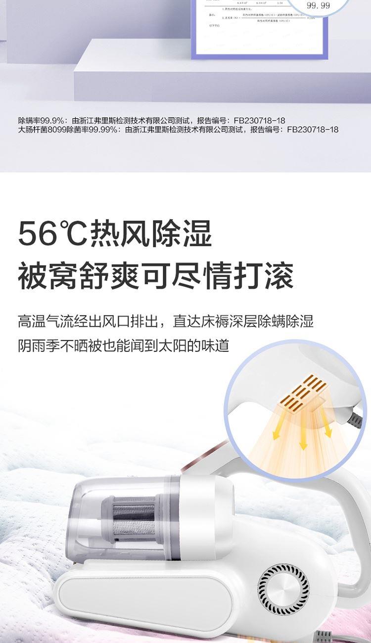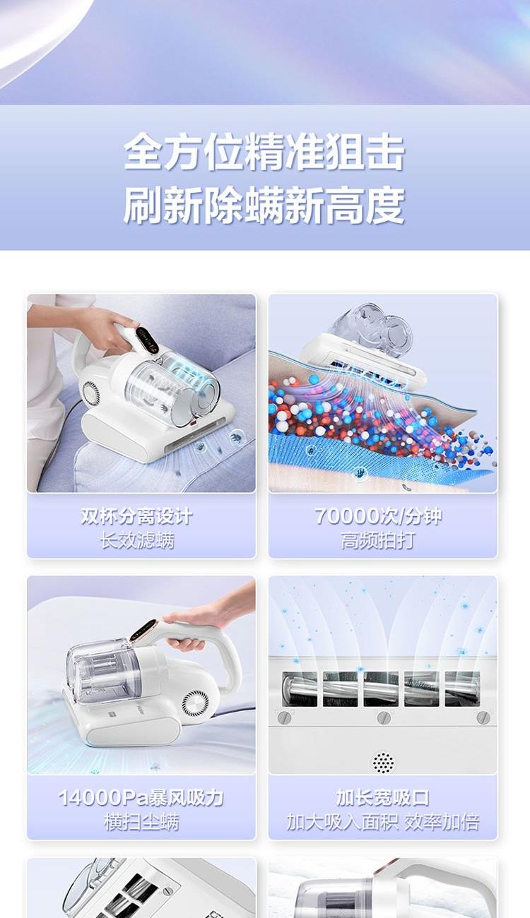 电源线长: 5m 尘杯容积: 400ml 滤芯材质: HEPA滤芯 电源线长: 4m 真空度: 14kPa 额定电压: 220V 额定功率:400W zui低噪音:82db 热风温度:55℃ 产品尺寸:24*31.1*19.4cm 拍打频次:70000次/分钟 1. 双尘杯设计深度除螨 高效洁)净