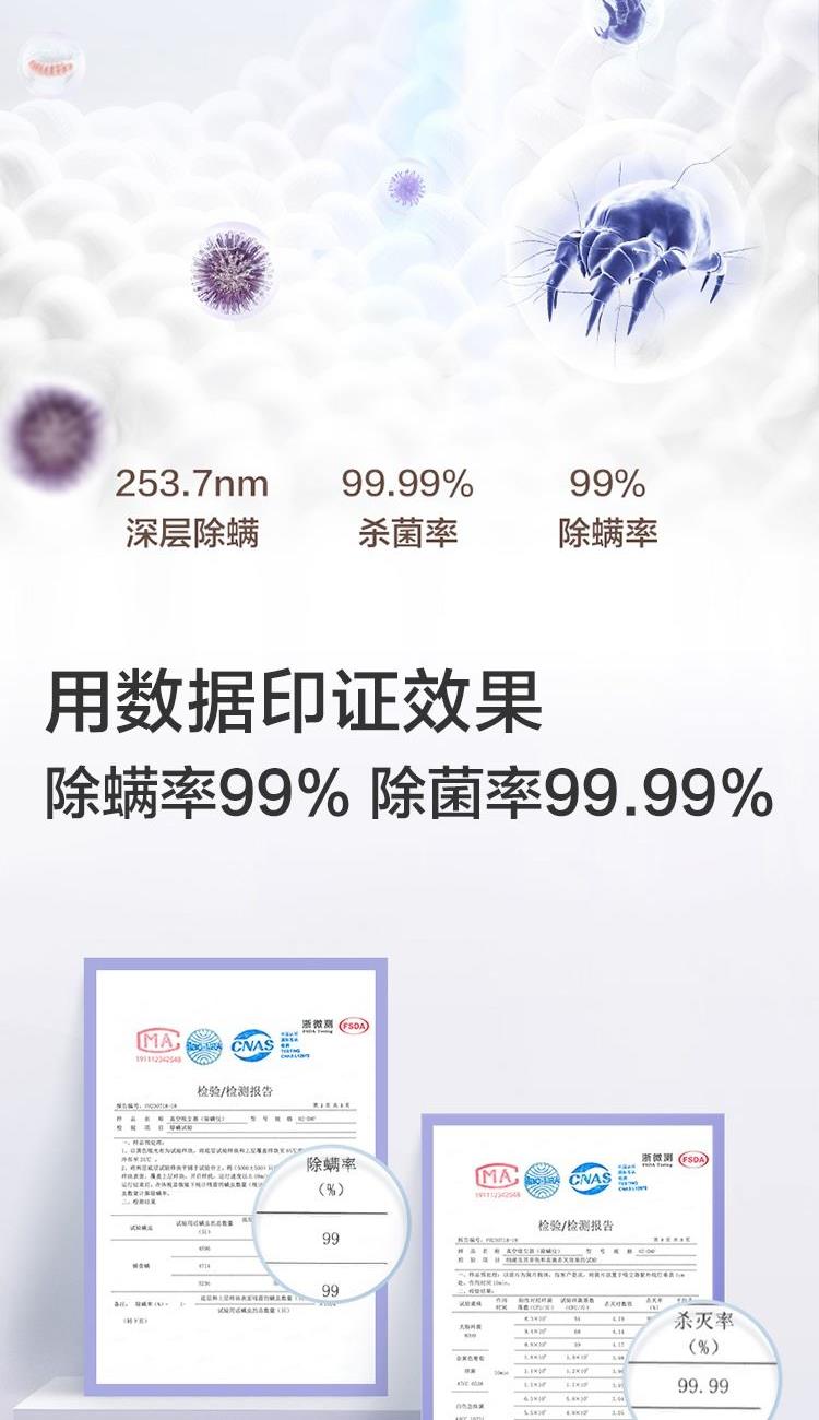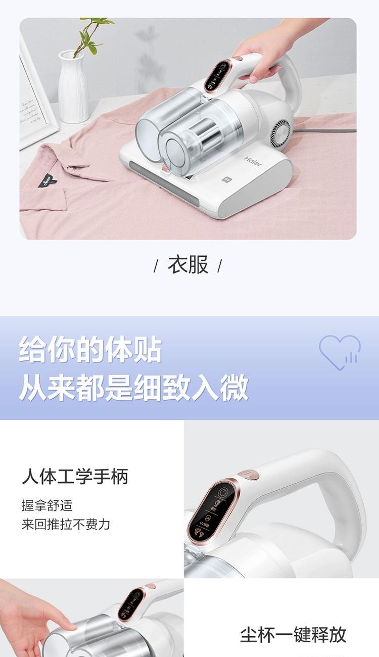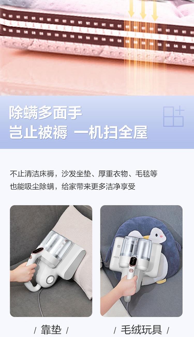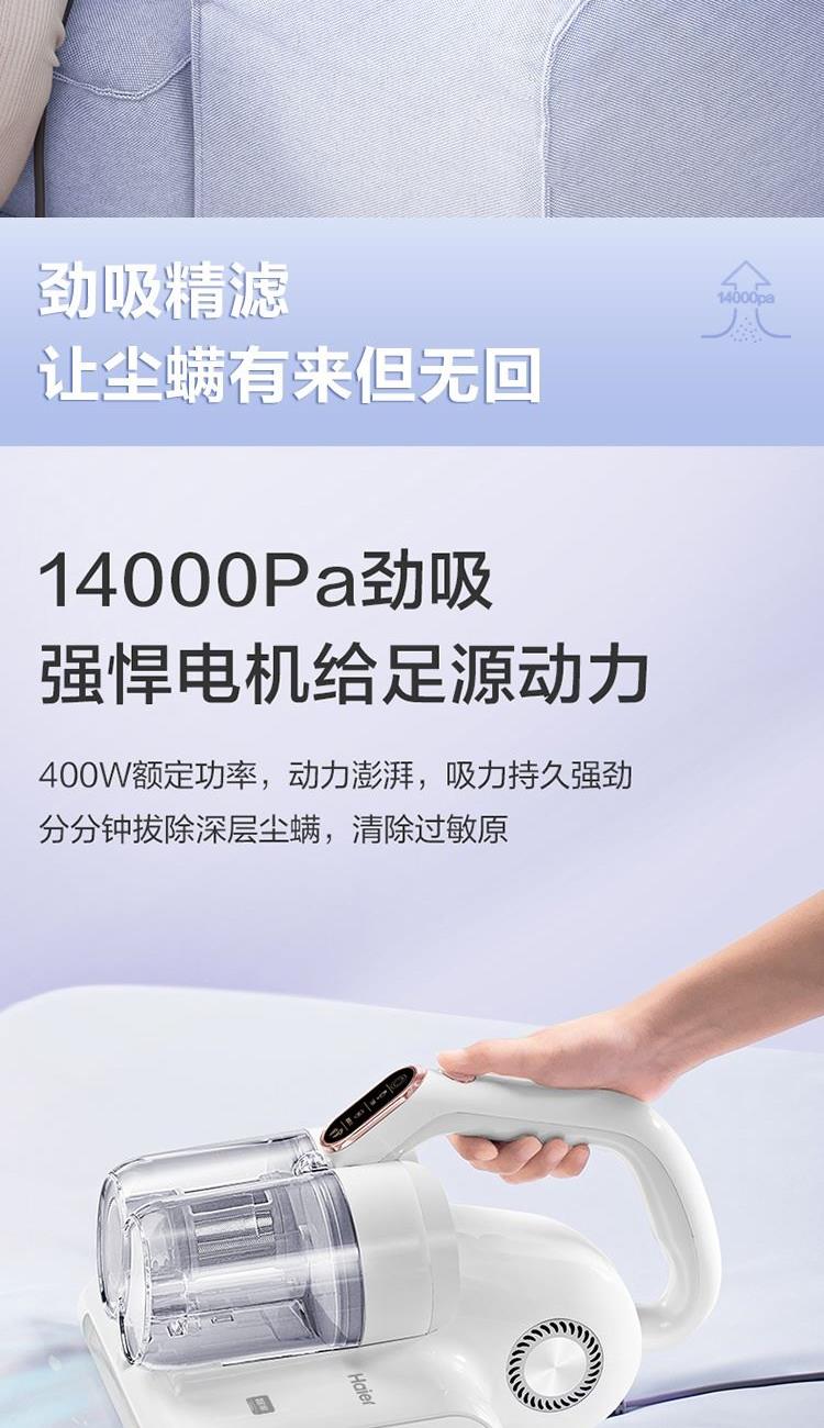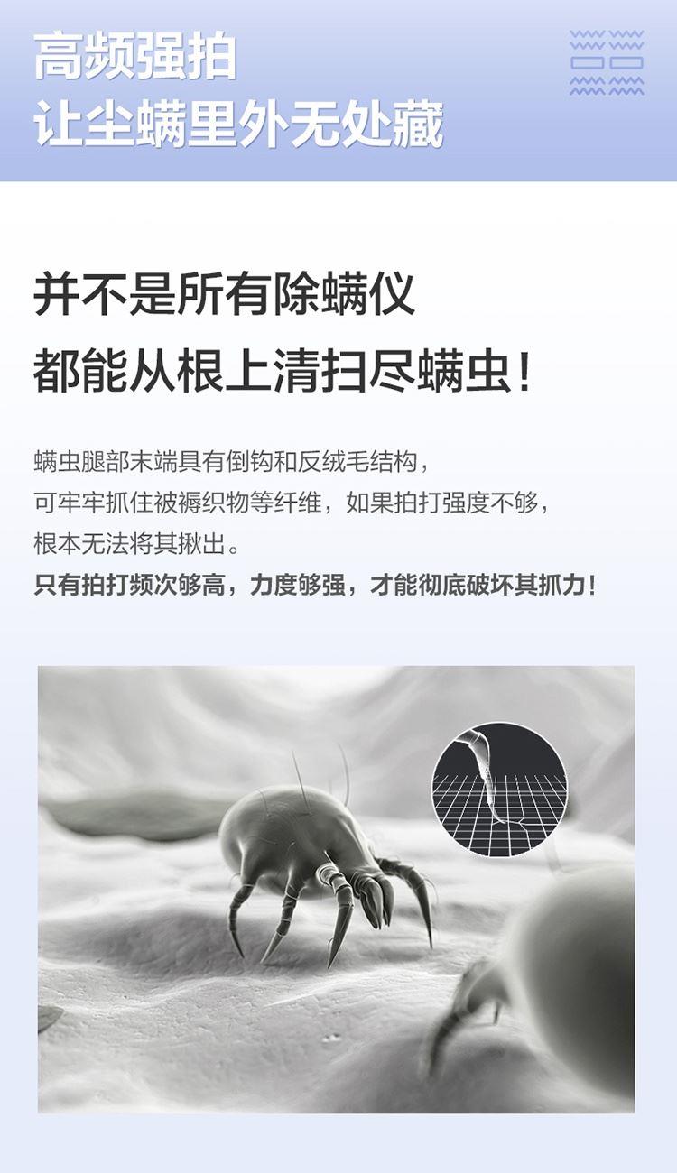 电源线长: 5m 尘杯容积: 400ml 滤芯材质: HEPA滤芯 电源线长: 4m 真空度: 14kPa 额定电压: 220V 额定功率:400W zui低噪音:82db 热风温度:55℃ 产品尺寸:24*31.1*19.4cm 拍打频次:70000次/分钟 1. 双尘杯设计深度除螨 高效洁)净