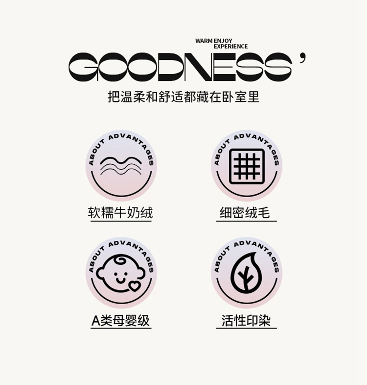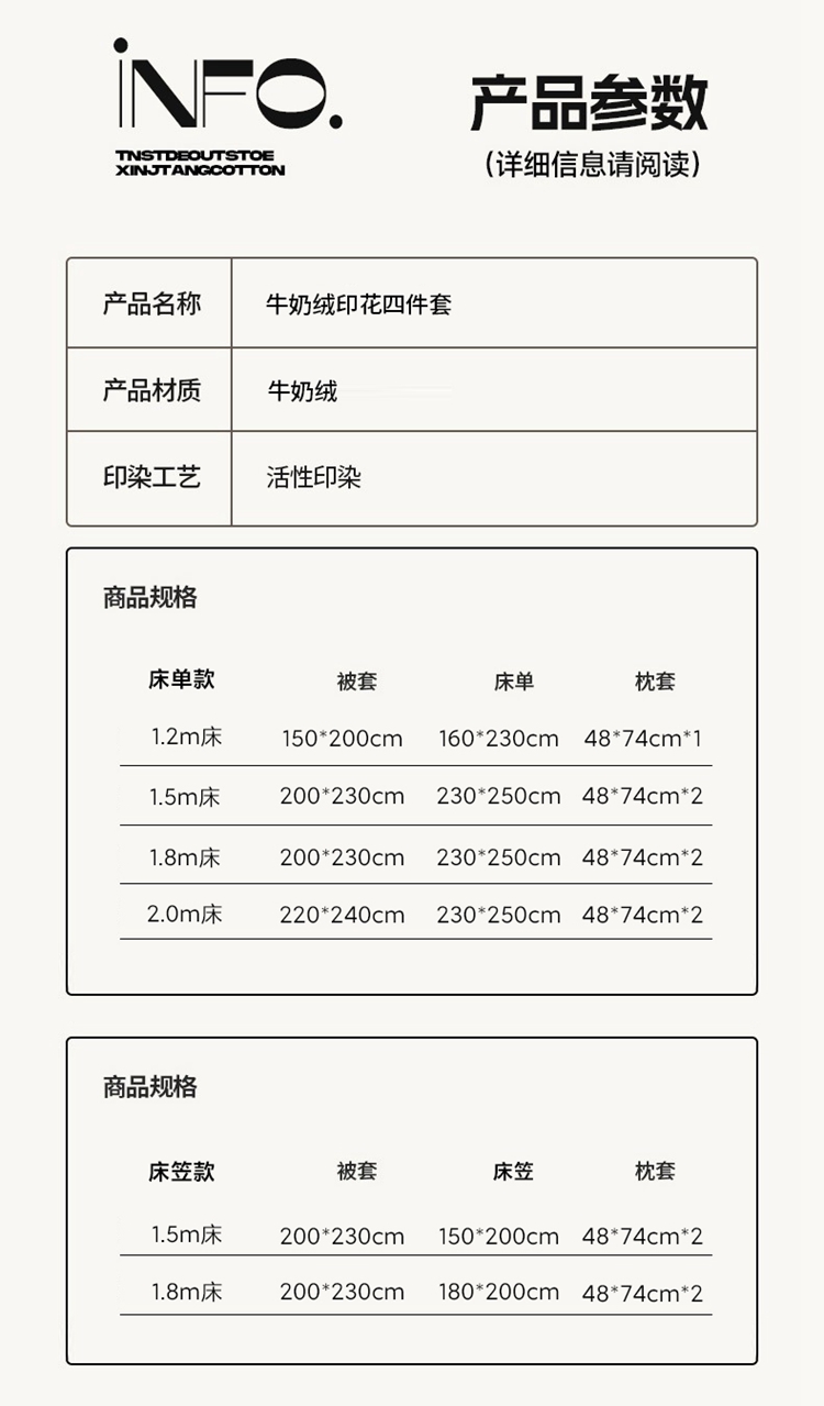 1:软糯牛奶绒牛奶绒面料绒毛纤长,轻盈贴身细密温暖具备透气的能力 温暖不闷汗 2:摸上去就感觉软软舒适的床上用品是自带好感的居家好物 3:绒面细腻温暖(一触即暖就能感知) 4:尺寸:被套 200*230cm*1 床单 230*250cm*1 枕套 48*74cm*2 包装 彩盒