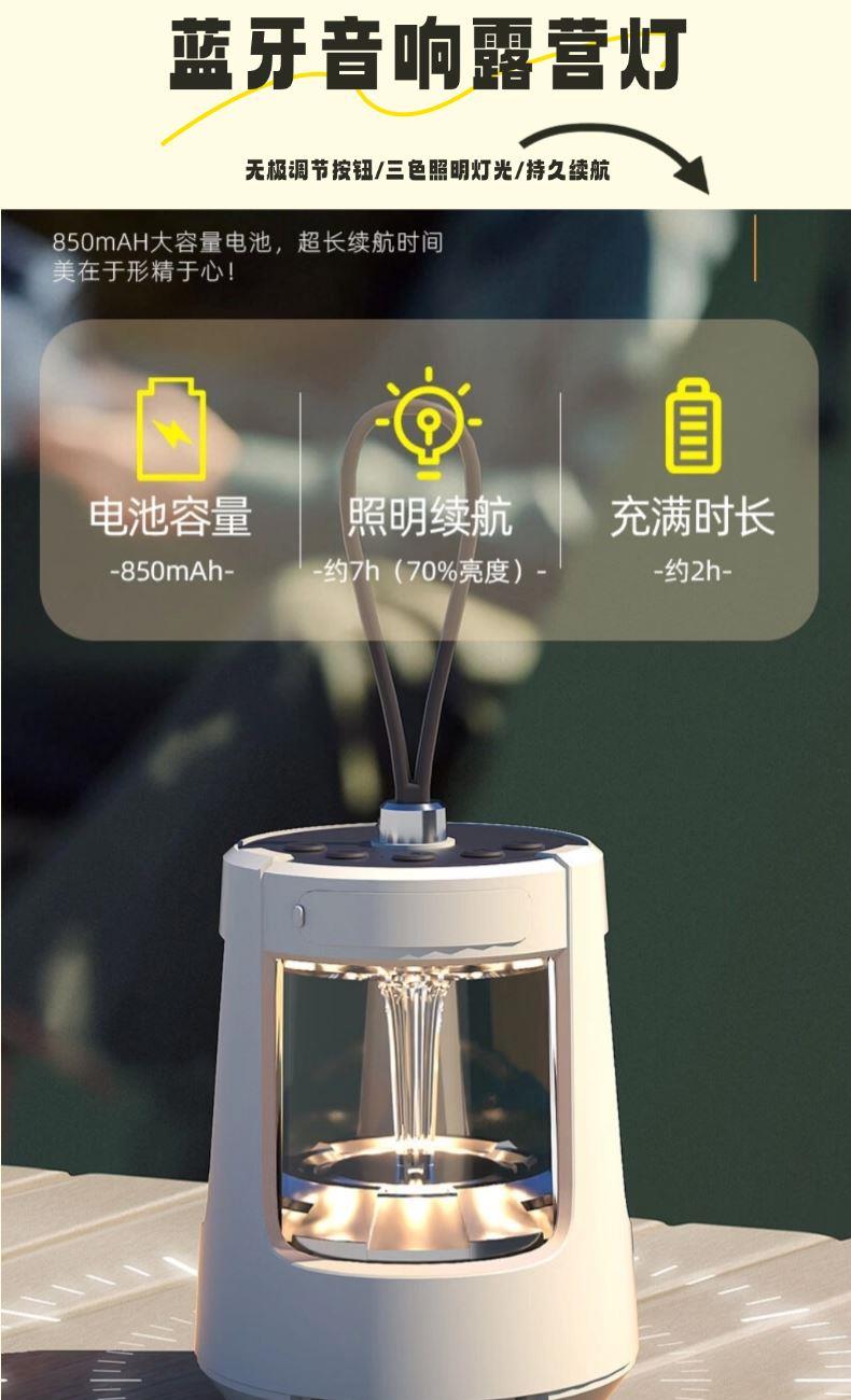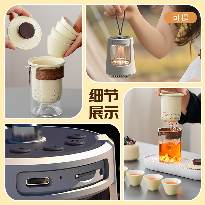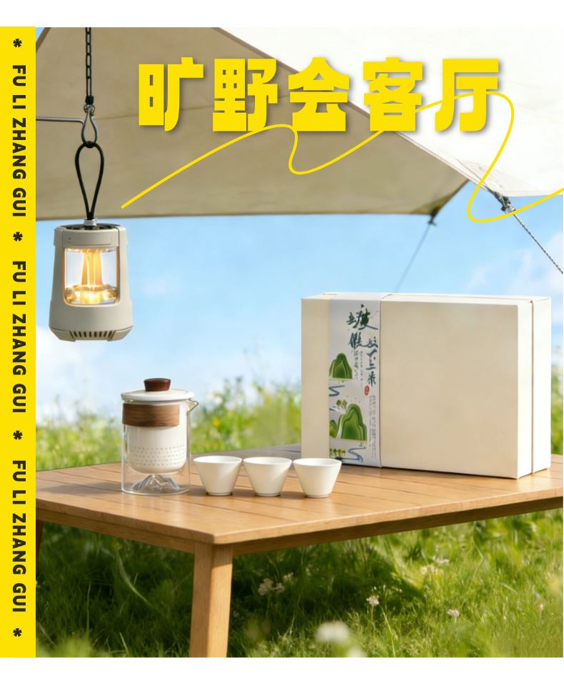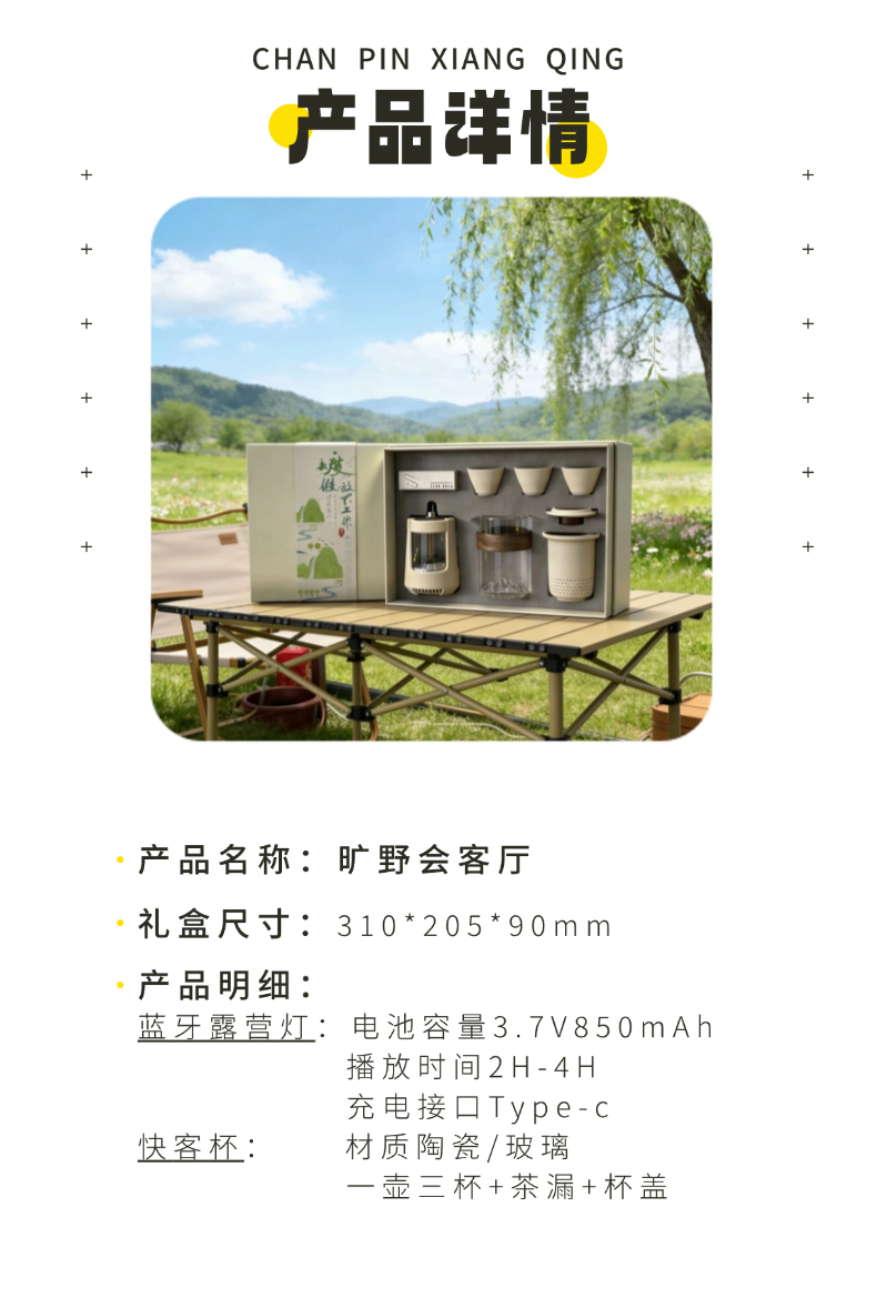 无论置身山海之畔还是露营地之间,【户外音响灯】 即刻用360°环绕立体声与柔和氛围光,为您勾勒出客厅的轮廓;【便携茶具】 则同步为您呈上一壶甘醇,以茶香连接彼此。一套装备,重构户外生活定义,让每一次出发,都成为一次有光、有乐、有茶香的高品质欢聚。 露营音响灯 产品尺寸:116*85*85mm 电池容量:3.7V 850mAh 播放时间:2H-4H 传输距离:≤10M 充电时间:2H 充电接口:Type-c 快客杯 产品材质:陶瓷/玻璃 配置:一壶三杯+茶漏+杯盖