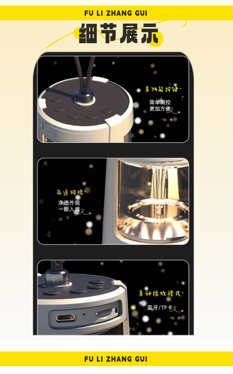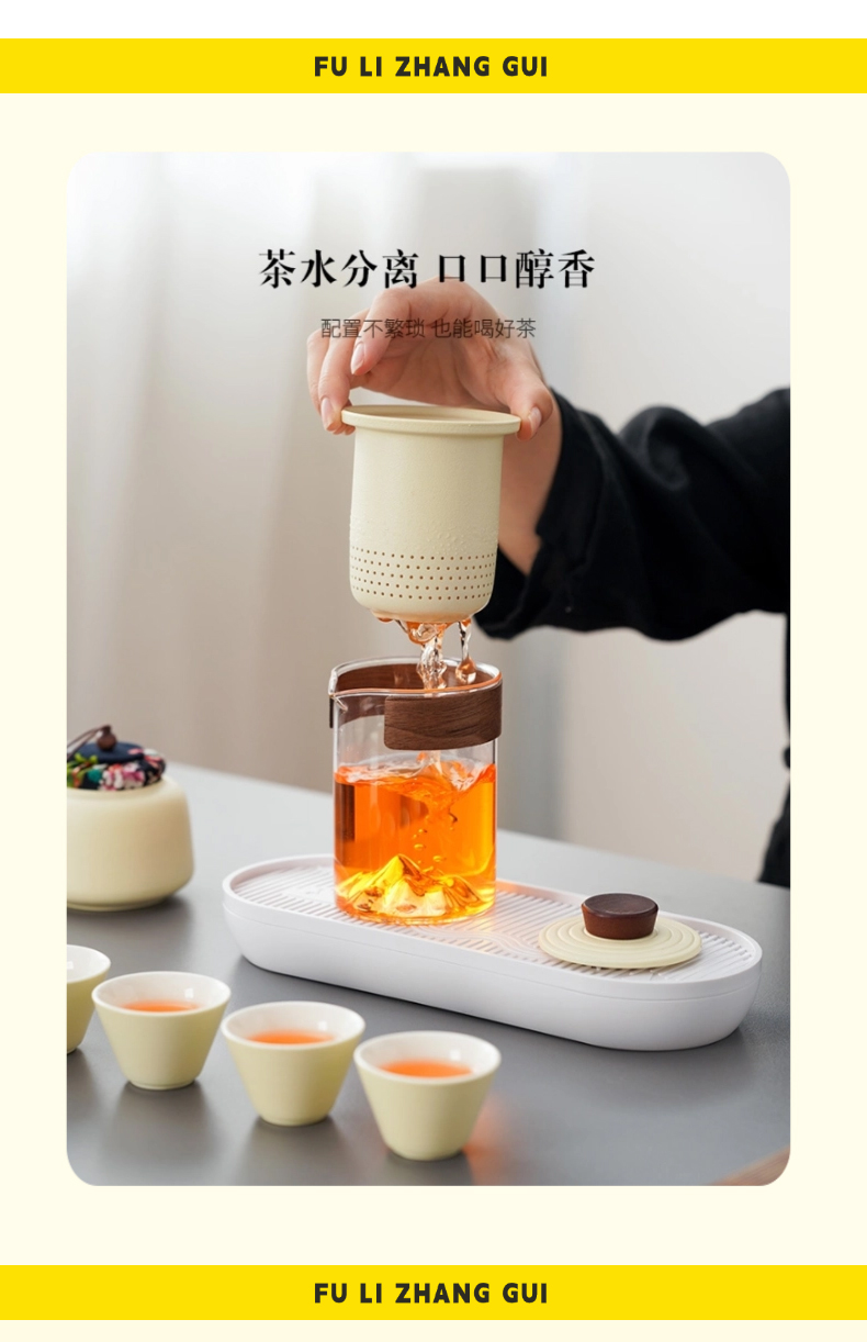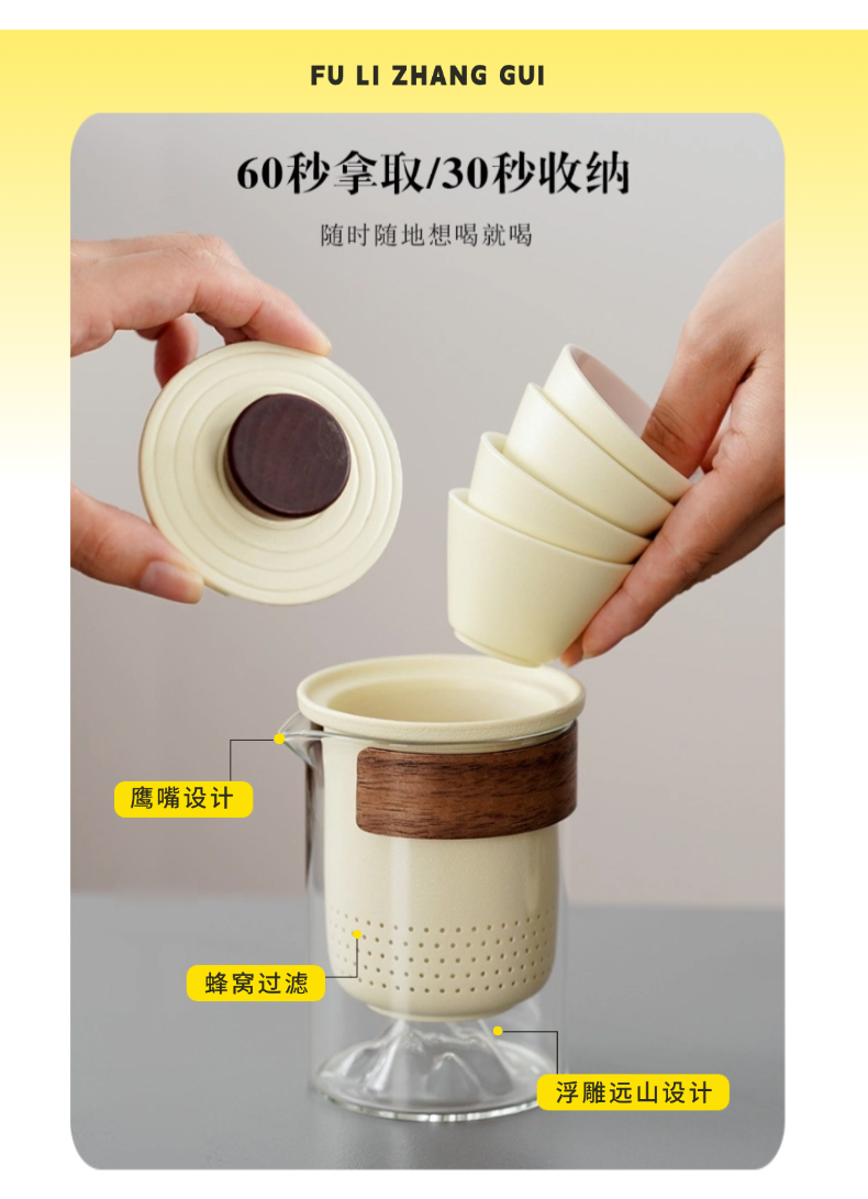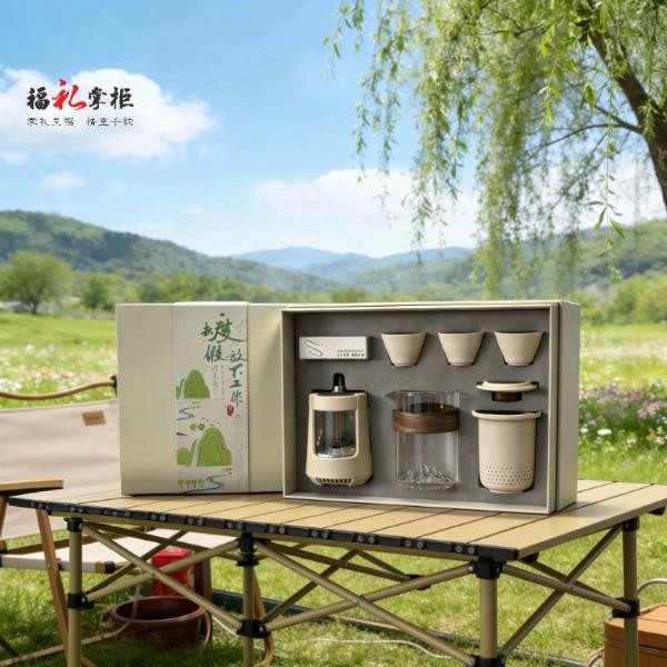 无论置身山海之畔还是露营地之间,【户外音响灯】 即刻用360°环绕立体声与柔和氛围光,为您勾勒出客厅的轮廓;【便携茶具】 则同步为您呈上一壶甘醇,以茶香连接彼此。一套装备,重构户外生活定义,让每一次出发,都成为一次有光、有乐、有茶香的高品质欢聚。 露营音响灯 产品尺寸:116*85*85mm 电池容量:3.7V 850mAh 播放时间:2H-4H 传输距离:≤10M 充电时间:2H 充电接口:Type-c 快客杯 产品材质:陶瓷/玻璃 配置:一壶三杯+茶漏+杯盖