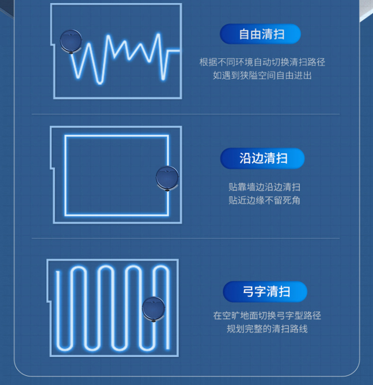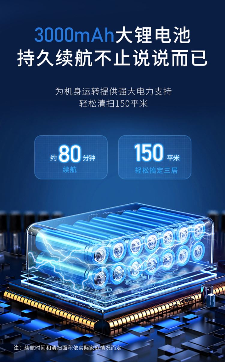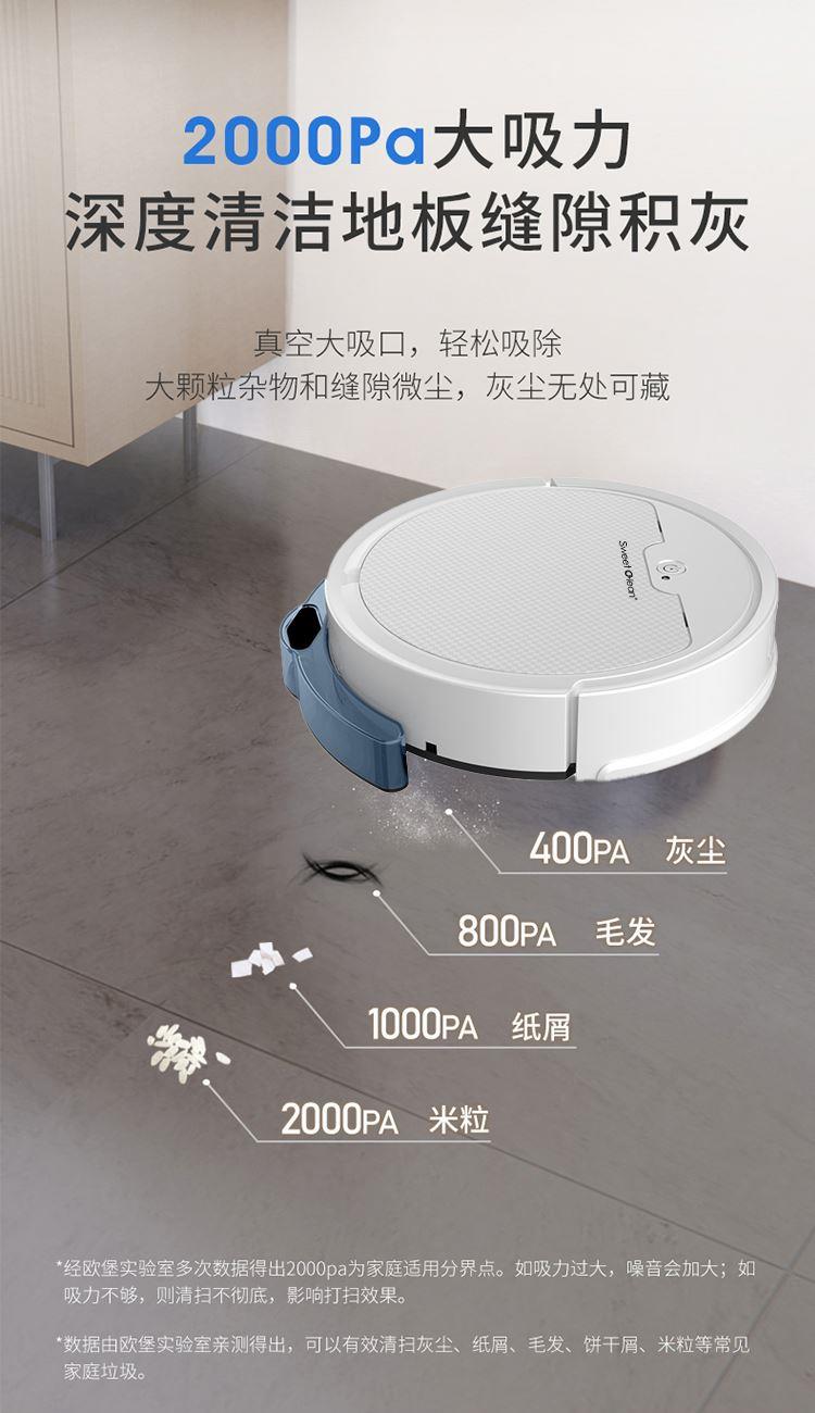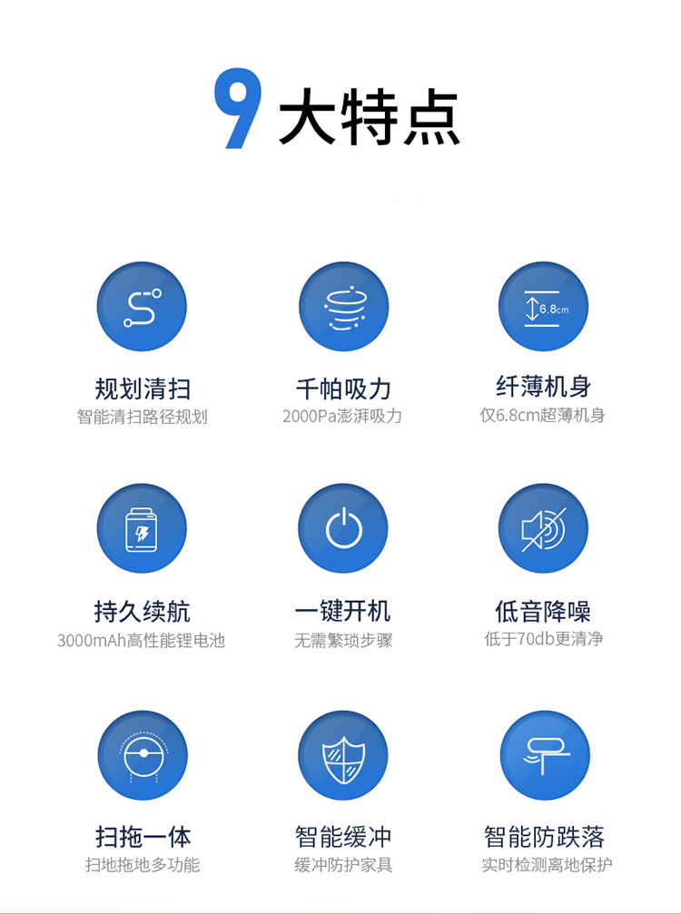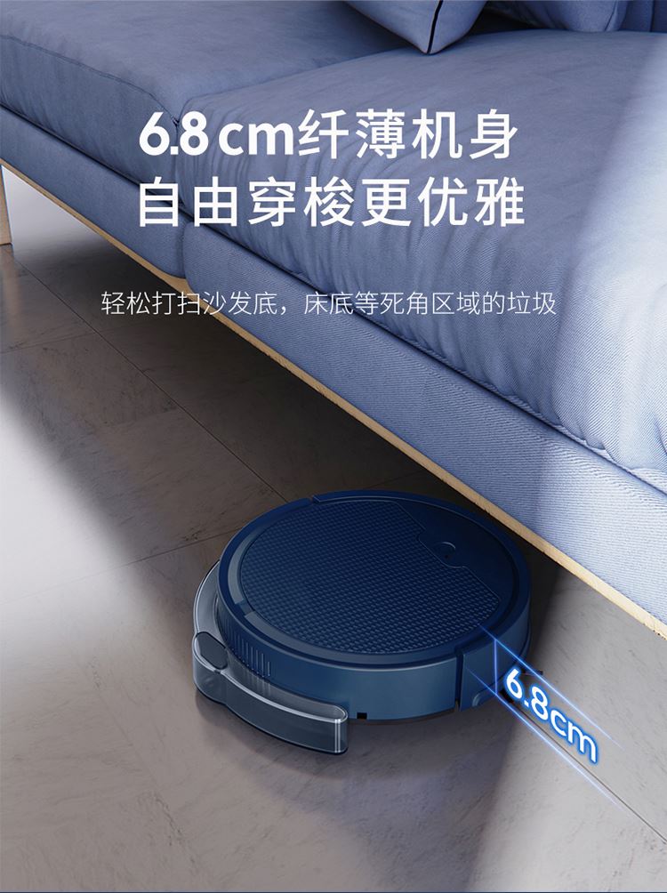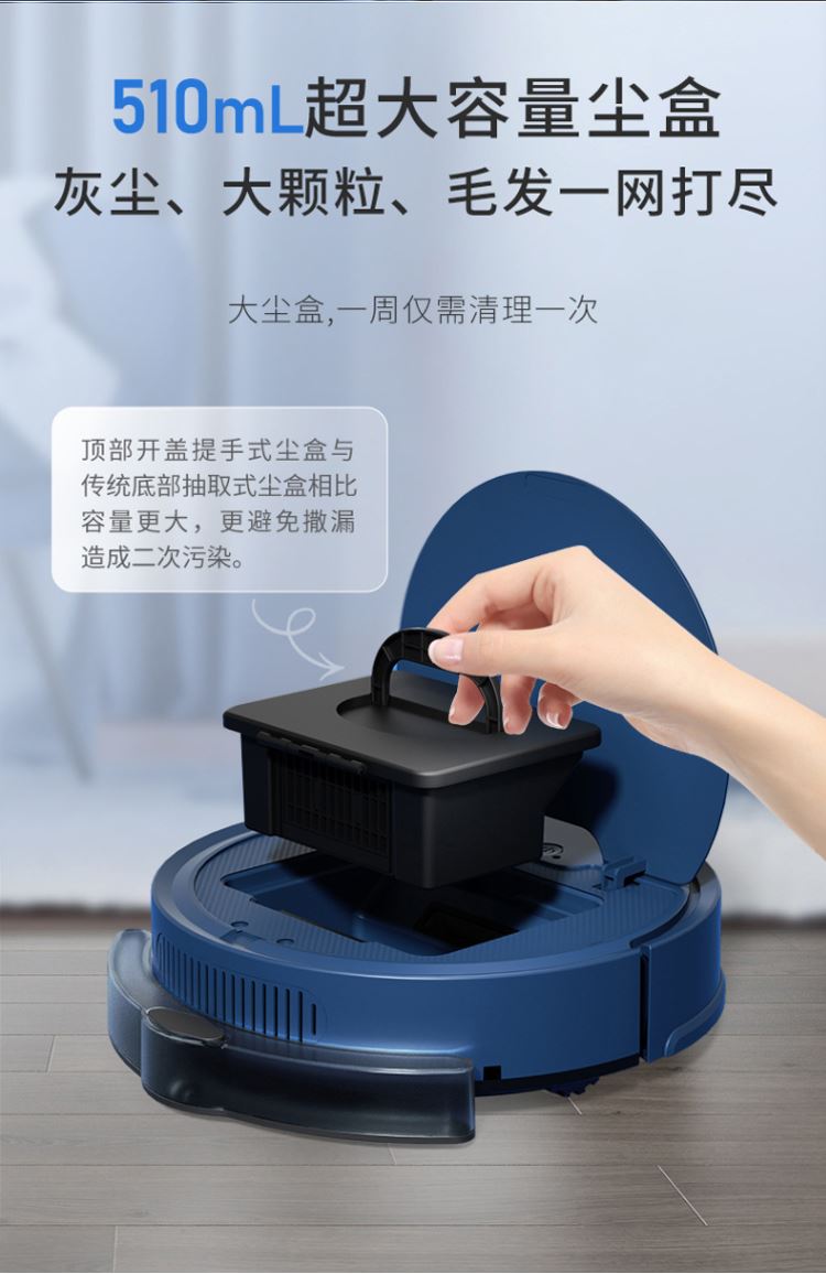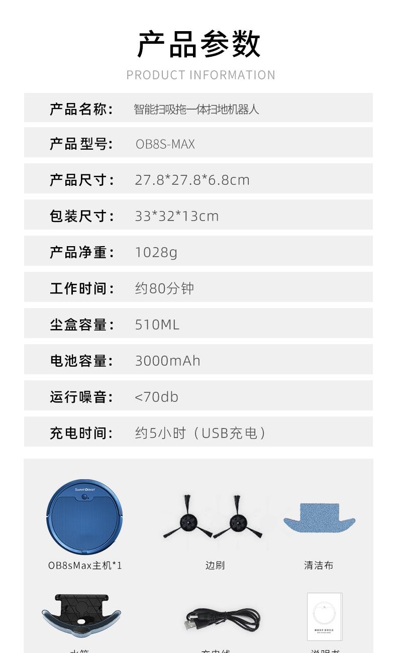产品尺寸:27.8*27.8*6.8cm 包装尺寸:33*32*13cm 产品净重:1028g 工作时间:约80分钟 尘盒容量:510ML 电池容量:3000mAh 运行噪音:<70db 充电时间:约5小时(USB充电) 9大特点 APP可视地图尽在掌握,实时地图、2000pa大吸力,轻松清扫地面灰尘,果皮和毛发,地毯清洁自动触发增压模式,80分钟续航,1cm越障能力,15度爬坡性能,感应障碍、感应台阶、减速轻碰、回退防跌,150平米轻松搞定三居,510ml大容量集尘设计,灰尘、螨虫、大颗粒、毛发一网打尽
