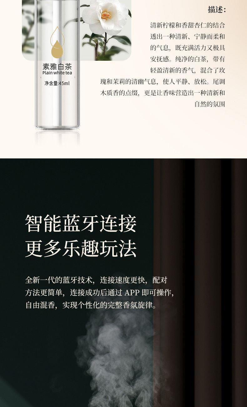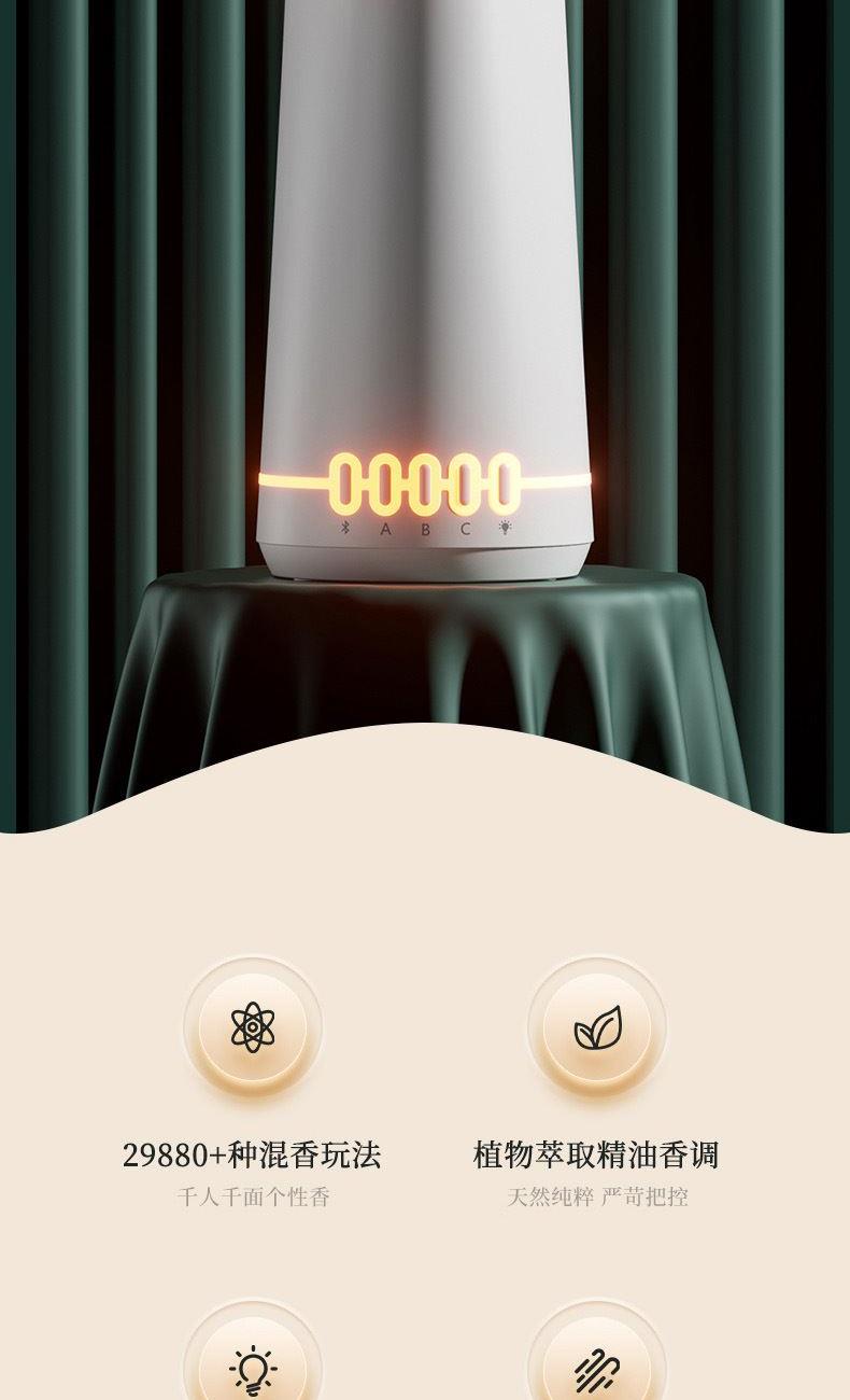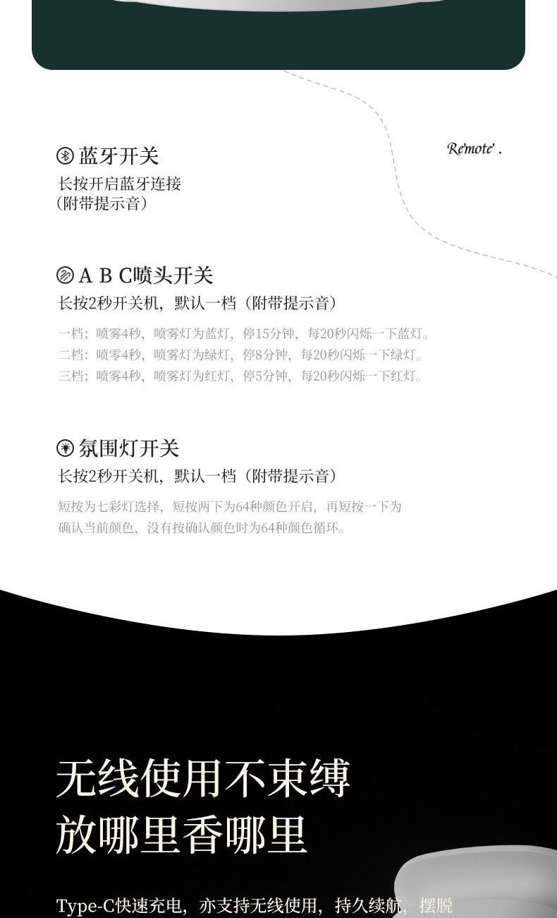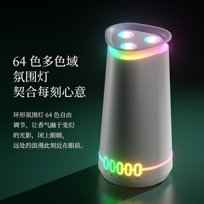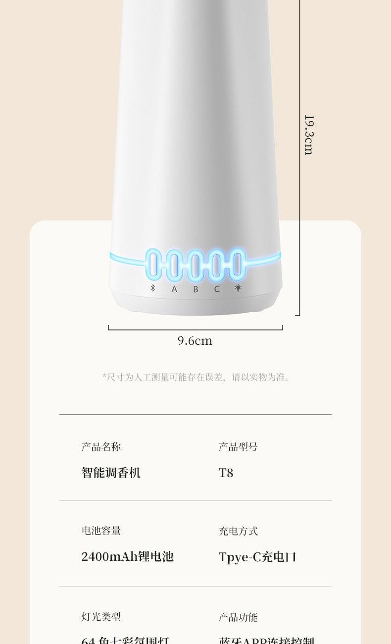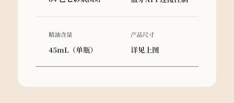 颜色:白色 供电方式:Type-C充电 电池容量:2400mAh 主机包装:20.5*11.3*11.3cm/450g 外箱尺寸:58.5*36*42.5cm/30台/14kg 精油包装:3*3*10.5cm/45ml/48g 精油外箱:31*31*11.5cm/100瓶/5.5kg 产品标配:彩盒、主机、精油(45ml)*3、说明书、数据线 64色多域氛围灯,8种出香模式 智能蓝牙连接,APP自由香氛管理 配纯天然植物活萃植物香氛精油,安全可靠,母婴可用 多采氛围灯,适合居家、办公等多场合适用"