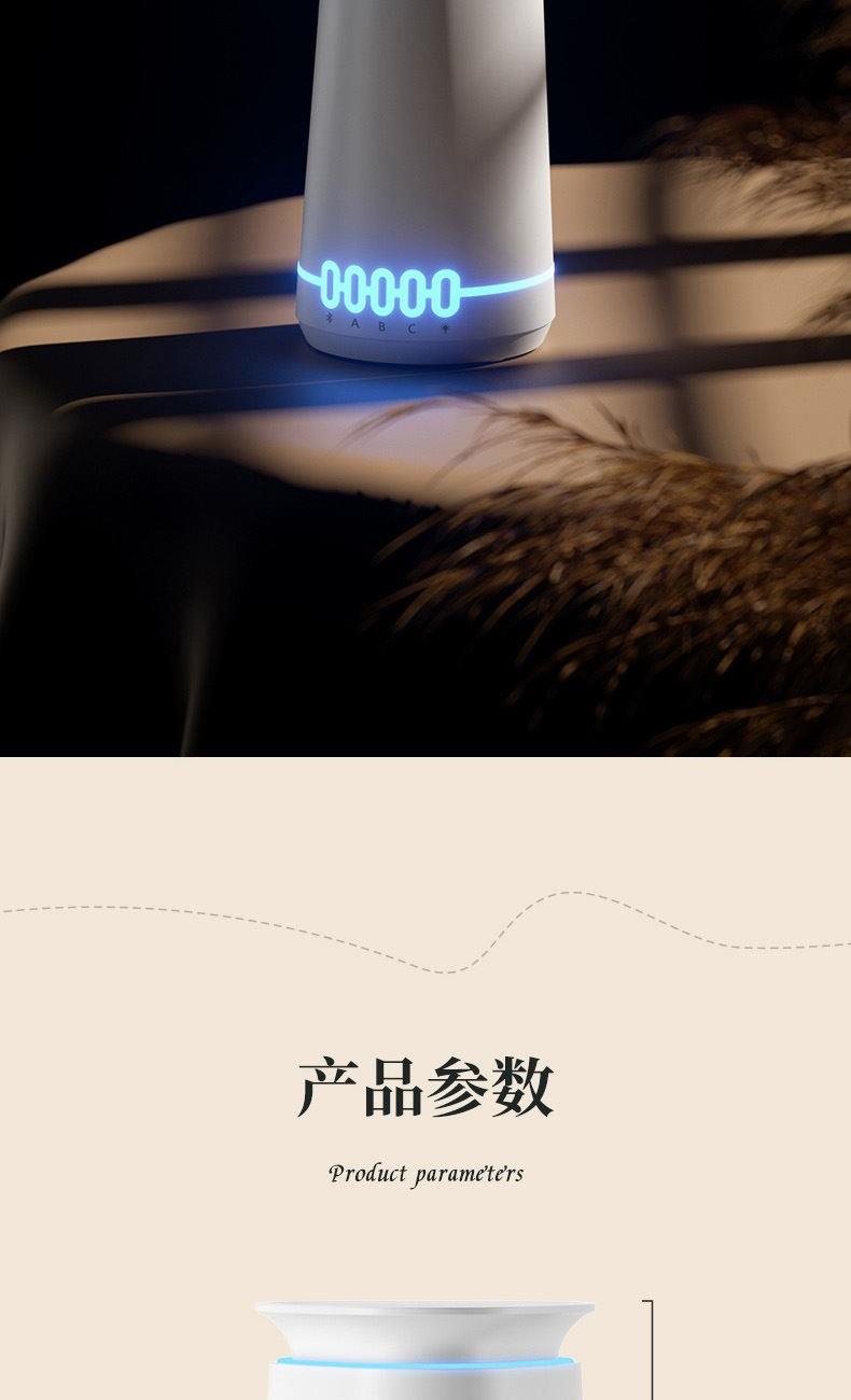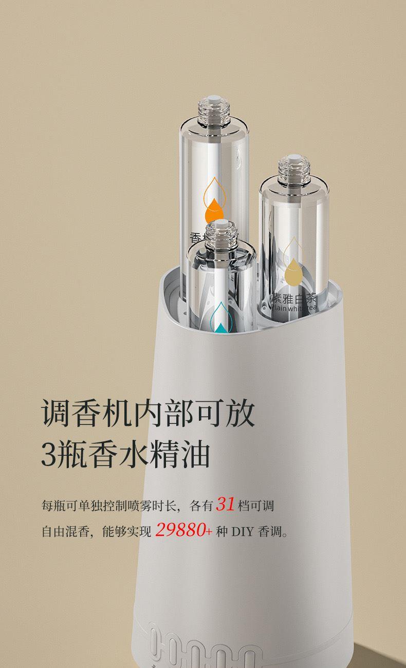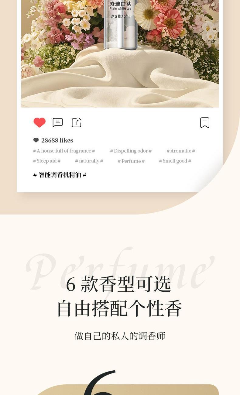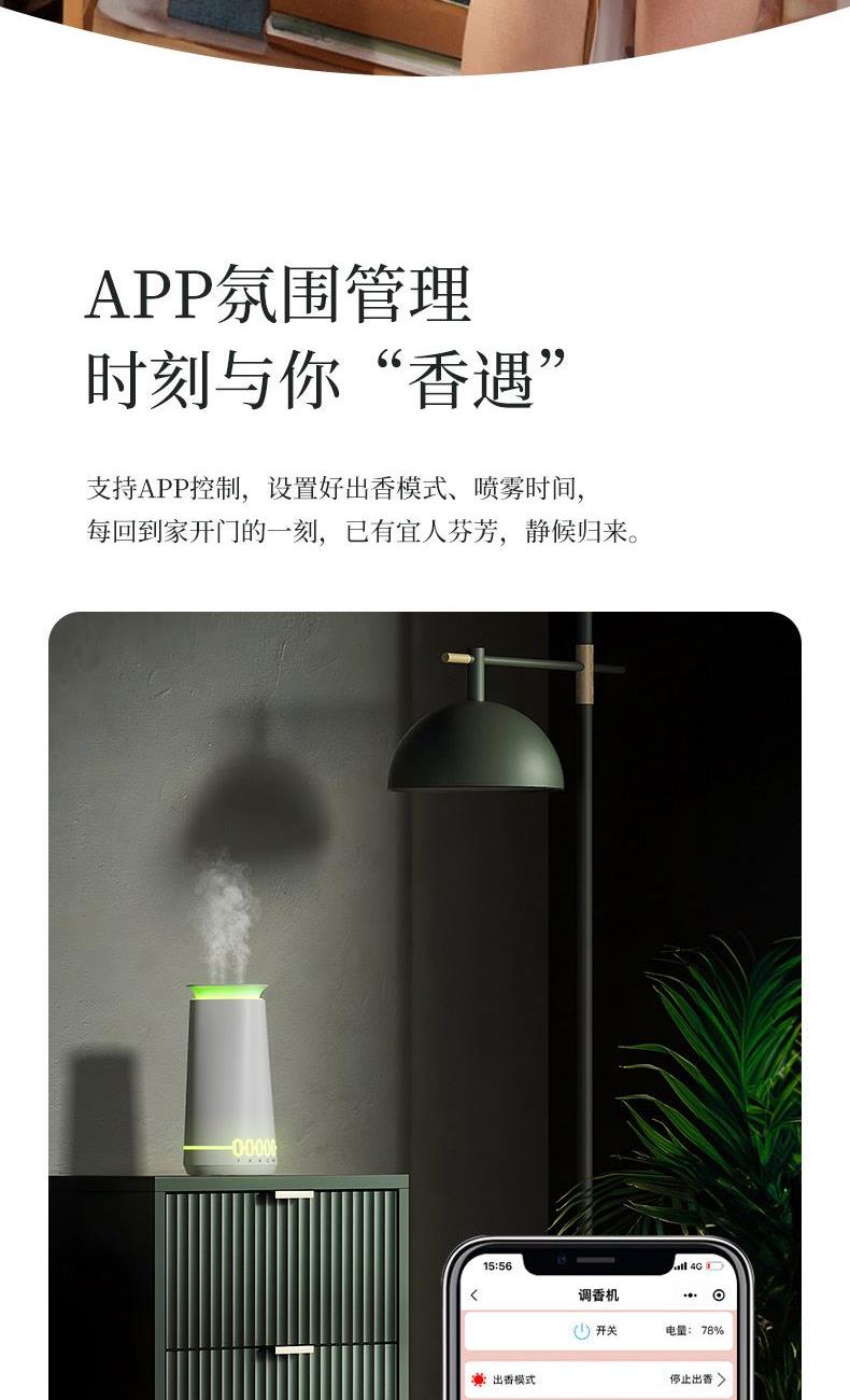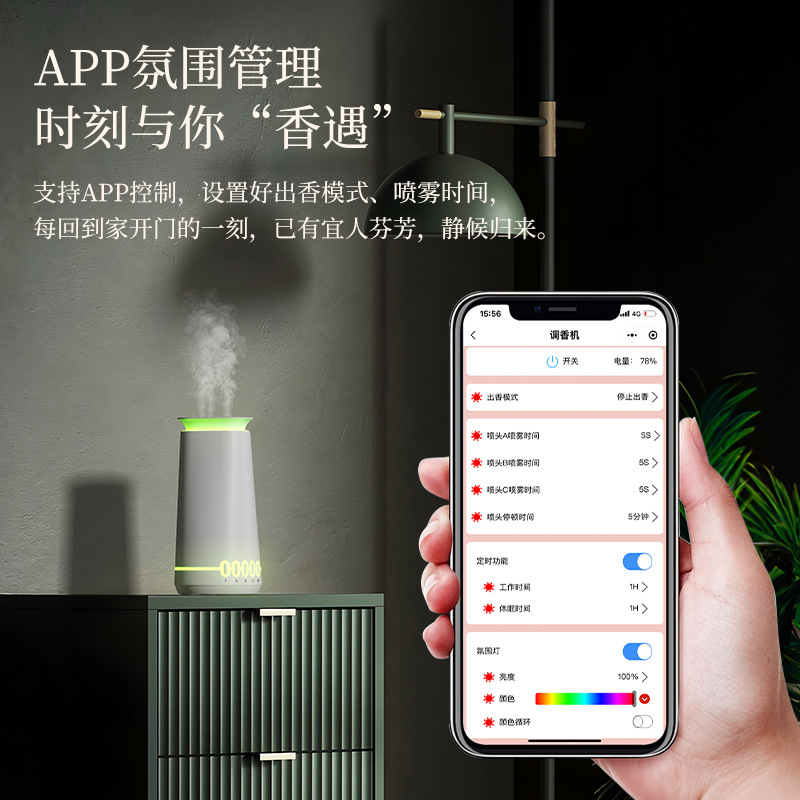颜色:白色 供电方式:Type-C充电 电池容量:2400mAh 主机包装:20.5*11.3*11.3cm/450g 外箱尺寸:58.5*36*42.5cm/30台/14kg 精油包装:3*3*10.5cm/45ml/48g 精油外箱:31*31*11.5cm/100瓶/5.5kg 产品标配:彩盒、主机、精油(45ml)*3、说明书、数据线 64色多域氛围灯,8种出香模式 智能蓝牙连接,APP自由香氛管理 配纯天然植物活萃植物香氛精油,安全可靠,母婴可用 多采氛围灯,适合居家、办公等多场合适用"