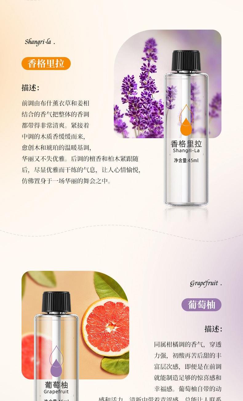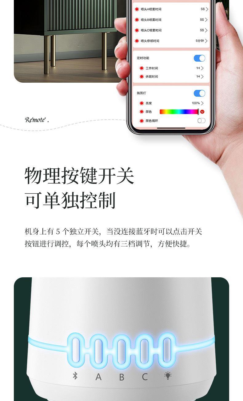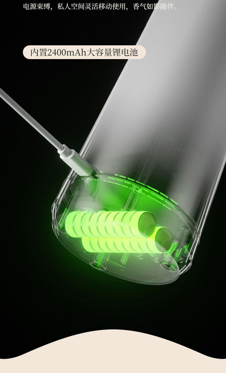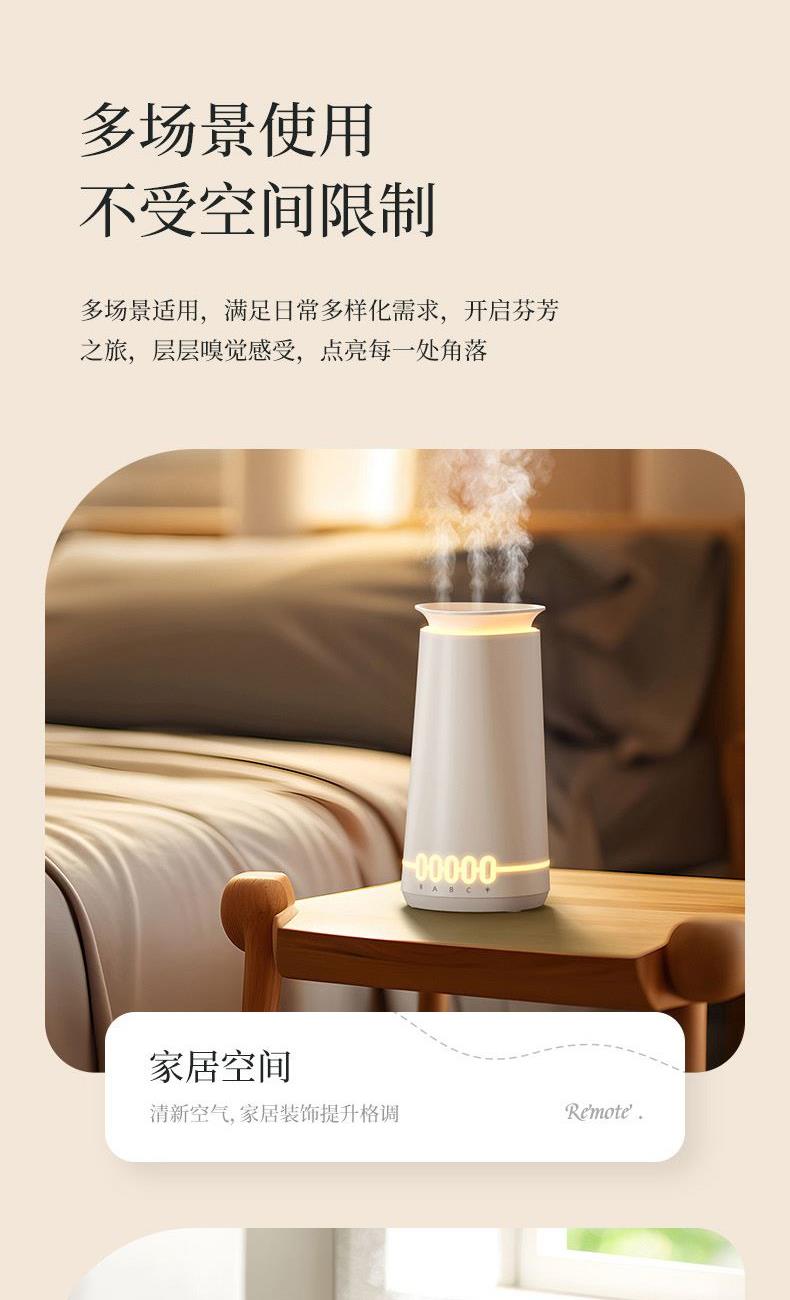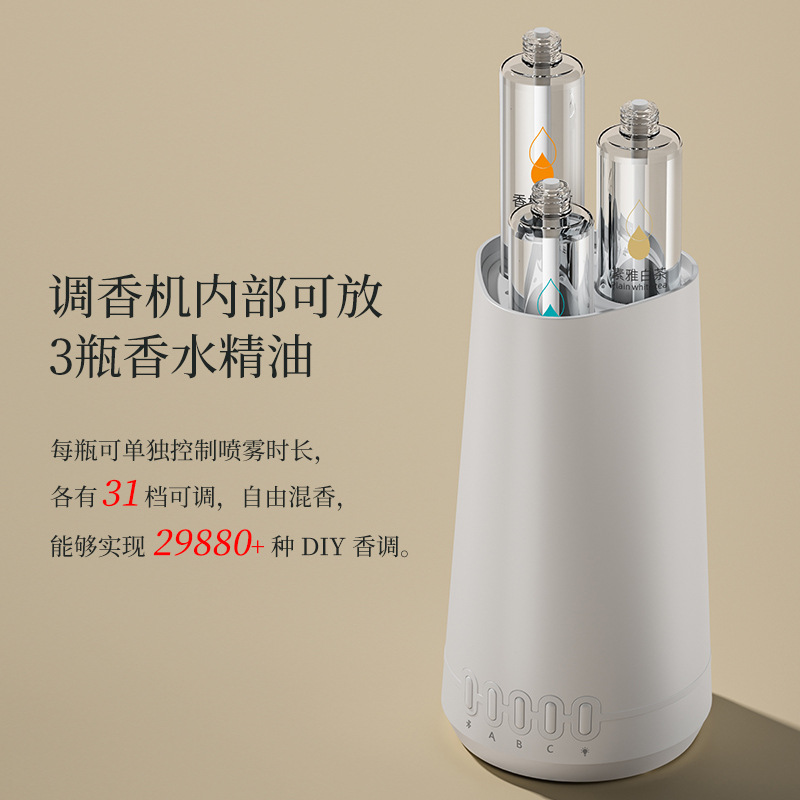 颜色:白色 供电方式:Type-C充电 电池容量:2400mAh 主机包装:20.5*11.3*11.3cm/450g 外箱尺寸:58.5*36*42.5cm/30台/14kg 精油包装:3*3*10.5cm/45ml/48g 精油外箱:31*31*11.5cm/100瓶/5.5kg 产品标配:彩盒、主机、精油(45ml)*3、说明书、数据线 64色多域氛围灯,8种出香模式 智能蓝牙连接,APP自由香氛管理 配纯天然植物活萃植物香氛精油,安全可靠,母婴可用 多采氛围灯,适合居家、办公等多场合适用"