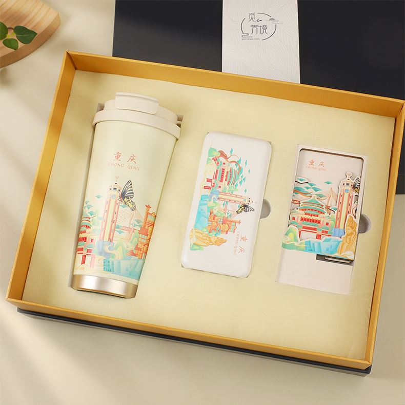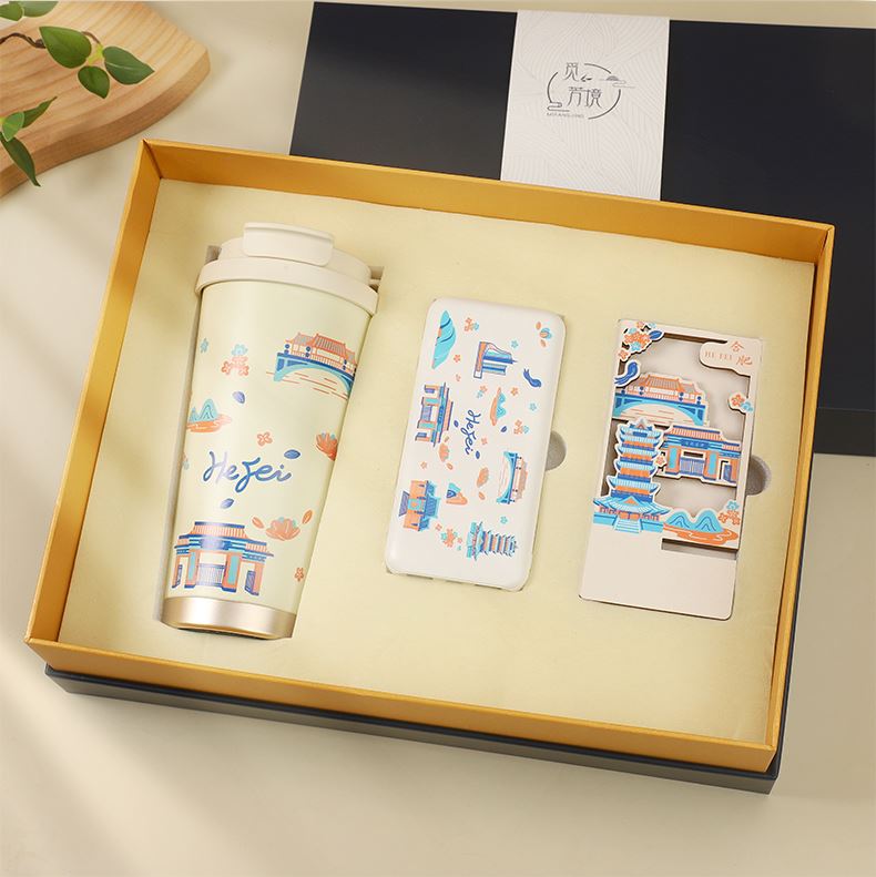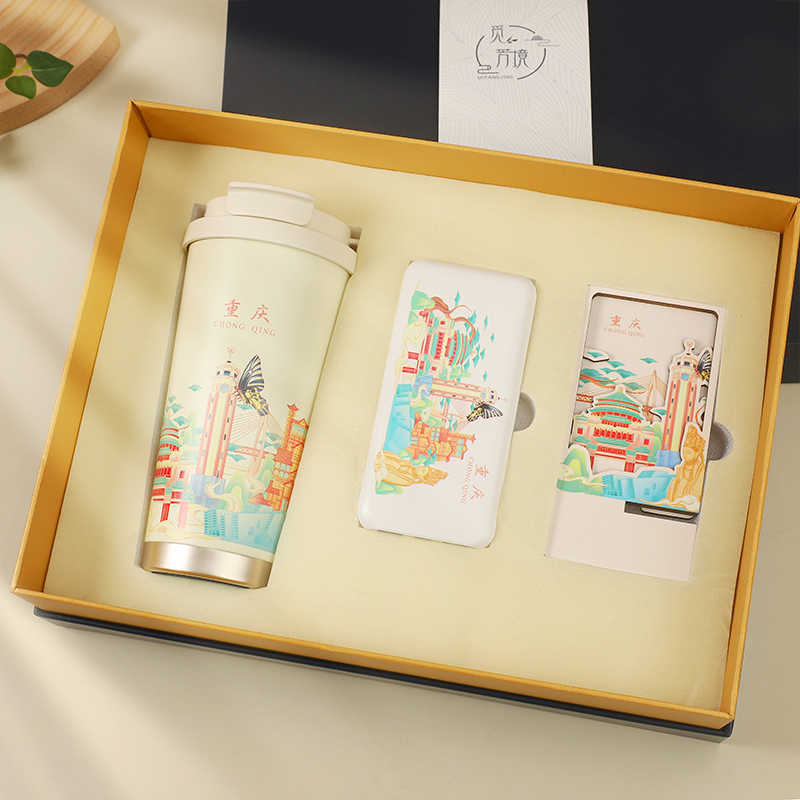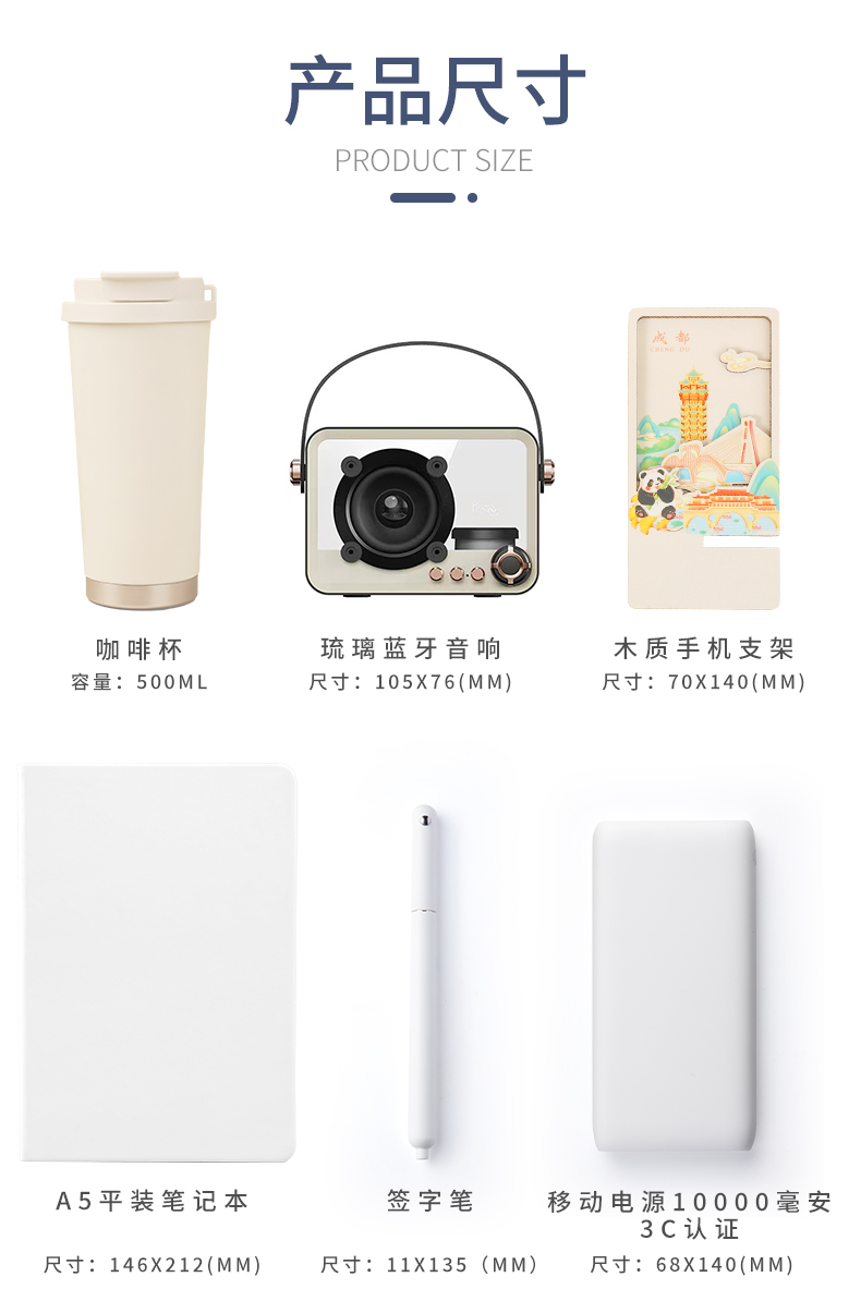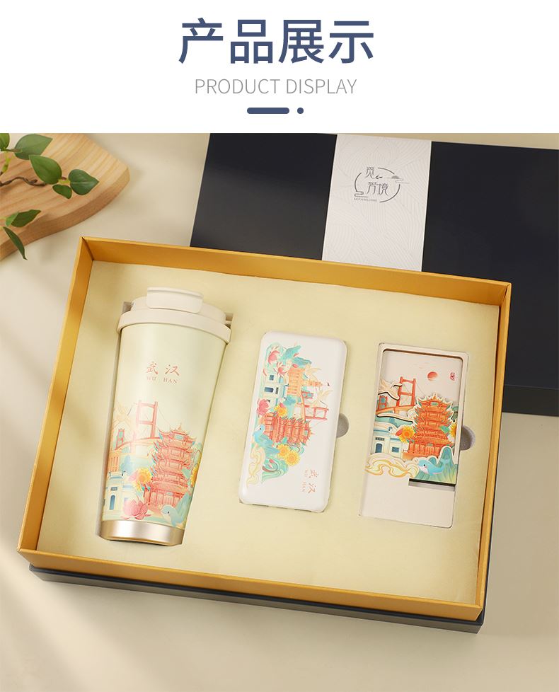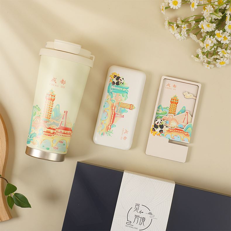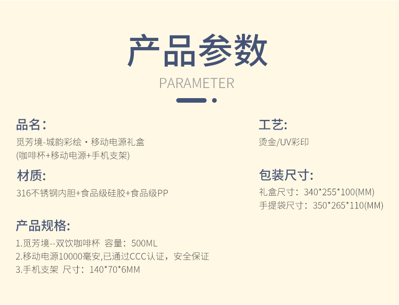 城市文创系列:成都、武汉、长沙、合肥、重庆、西安 1.觅芳境--双饮咖啡杯 容量:500ml 内胆:316 外壳:304 杯盖:食品级PP 吸管:食品级硅胶 吸嘴:食品级PP 密封圈:食品级硅胶 2.移动电源 已通过CCC认证,安全保证 超薄10000mAh聚合物移动电源 3C认证 2A输入输出 安全充电 轻薄手感 方便携带 3.手机支架 140*70*6MM 礼盒尺寸:340*255*100(MM) 手提袋尺寸:350*265*110(MM)