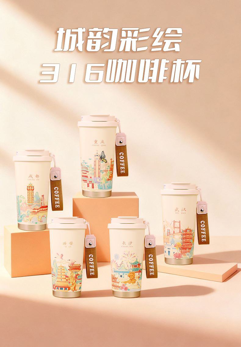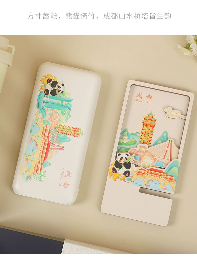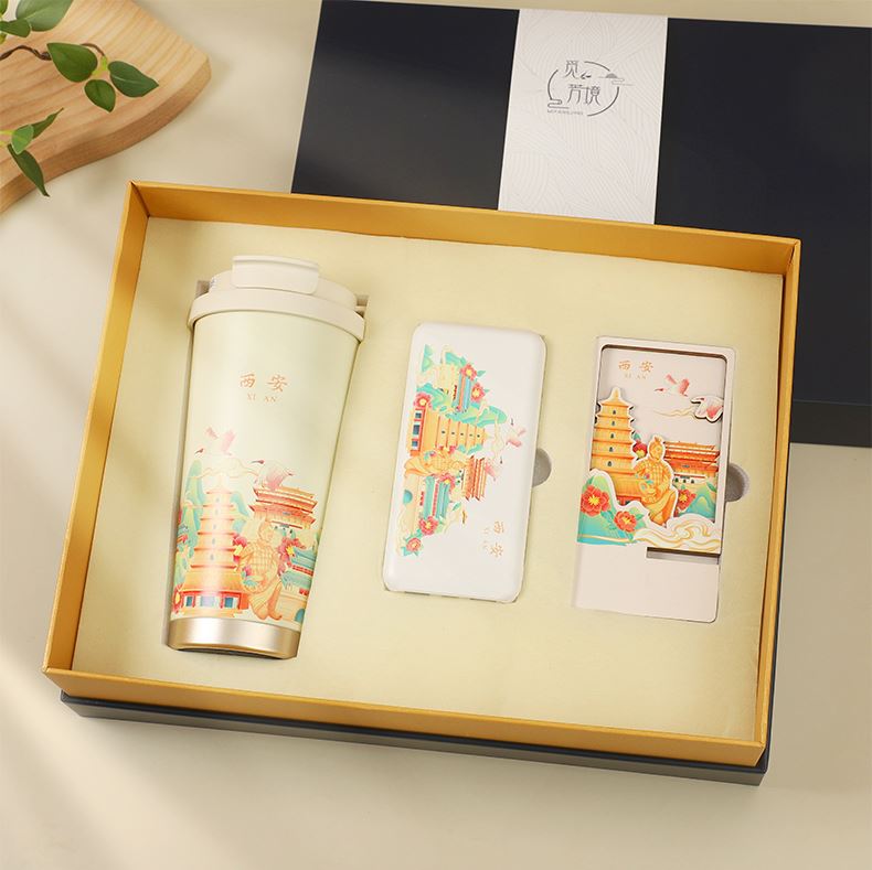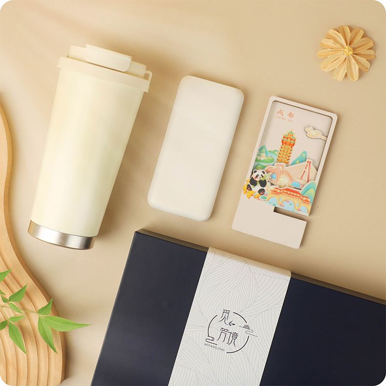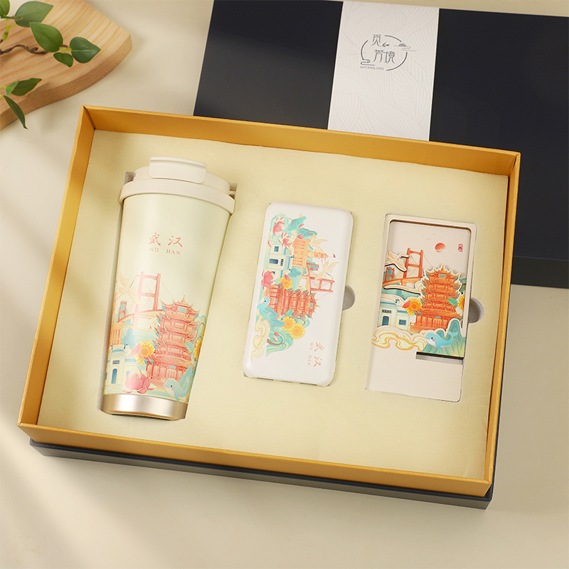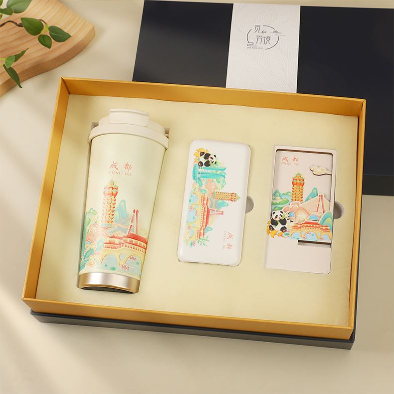 城市文创系列:成都、武汉、长沙、合肥、重庆、西安 1.觅芳境--双饮咖啡杯 容量:500ml 内胆:316 外壳:304 杯盖:食品级PP 吸管:食品级硅胶 吸嘴:食品级PP 密封圈:食品级硅胶 2.移动电源 已通过CCC认证,安全保证 超薄10000mAh聚合物移动电源 3C认证 2A输入输出 安全充电 轻薄手感 方便携带 3.手机支架 140*70*6MM 礼盒尺寸:340*255*100(MM) 手提袋尺寸:350*265*110(MM)