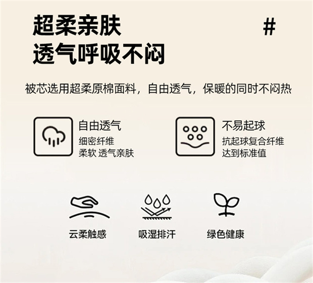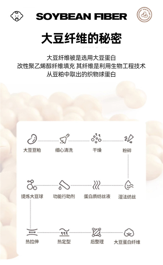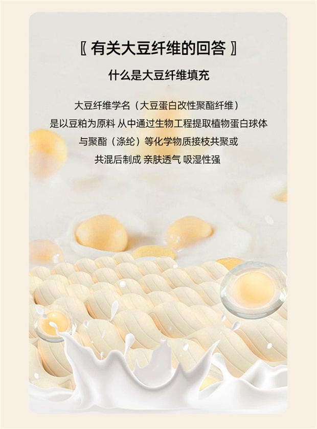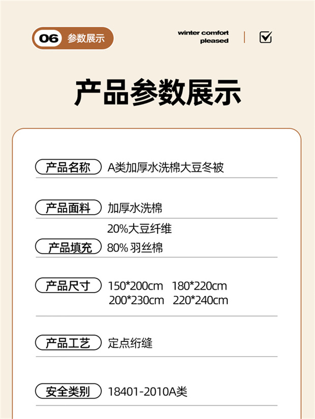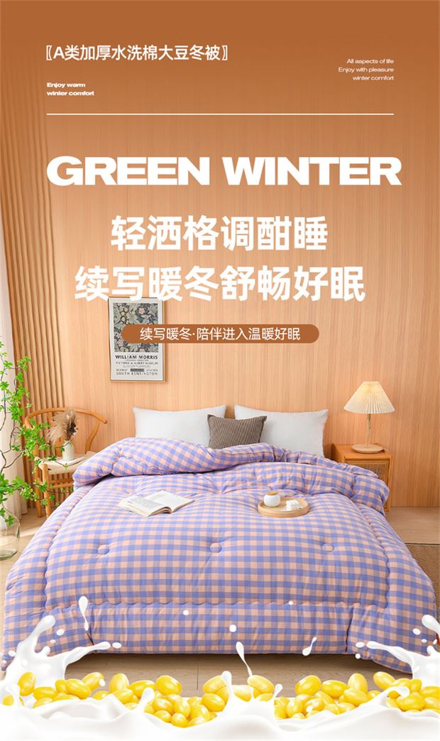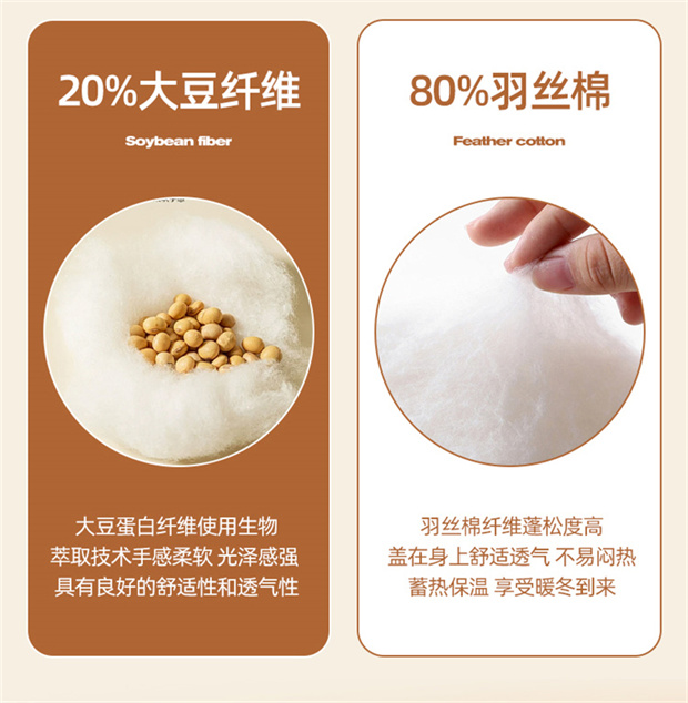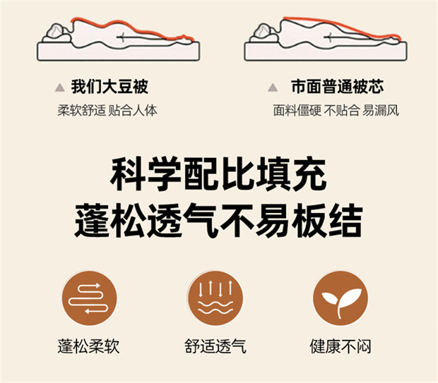 1:轻洒格调酣睡续写暖冬舒畅好眠 续写暖冬·陪伴进入温暖好眠 2:生活中的小情绪都被这自然云感大豆纤维冬被 可以融入加的艺术感 3:大豆纤维被是选用大豆蛋白改性聚乙烯醇纤维填充 其纤维是利用生物工程技术从豆粕中取出的织物球蛋白 尺寸:200*230cm 重量:2kg 包装:礼盒