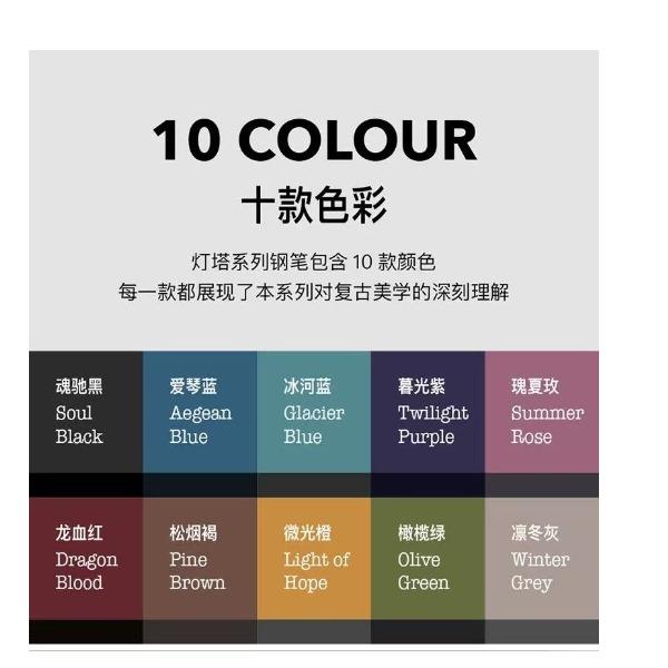 型号:灯塔系列墨水笔 类型:螺纹上墨式墨水笔 重量:墨水/宝珠笔43g/47g 颜色分类:微光橙凛冬灰橄榄绿爱琴蓝龙血红魂驰黑 书写粗细:F尖 套餐类型:官方标配 包装方式:鸿运笔记本礼盒装 适用场景:送礼书写钢笔 笔尖成分:铱金笔 笔尖种类:标准型 适用人群:商务办公人士 上墨方式:旋转吸墨 笔杆材质:金属笔尖 嵌入方式:明尖 笔身纹理:格子纹 墨水材质:非碳素墨水