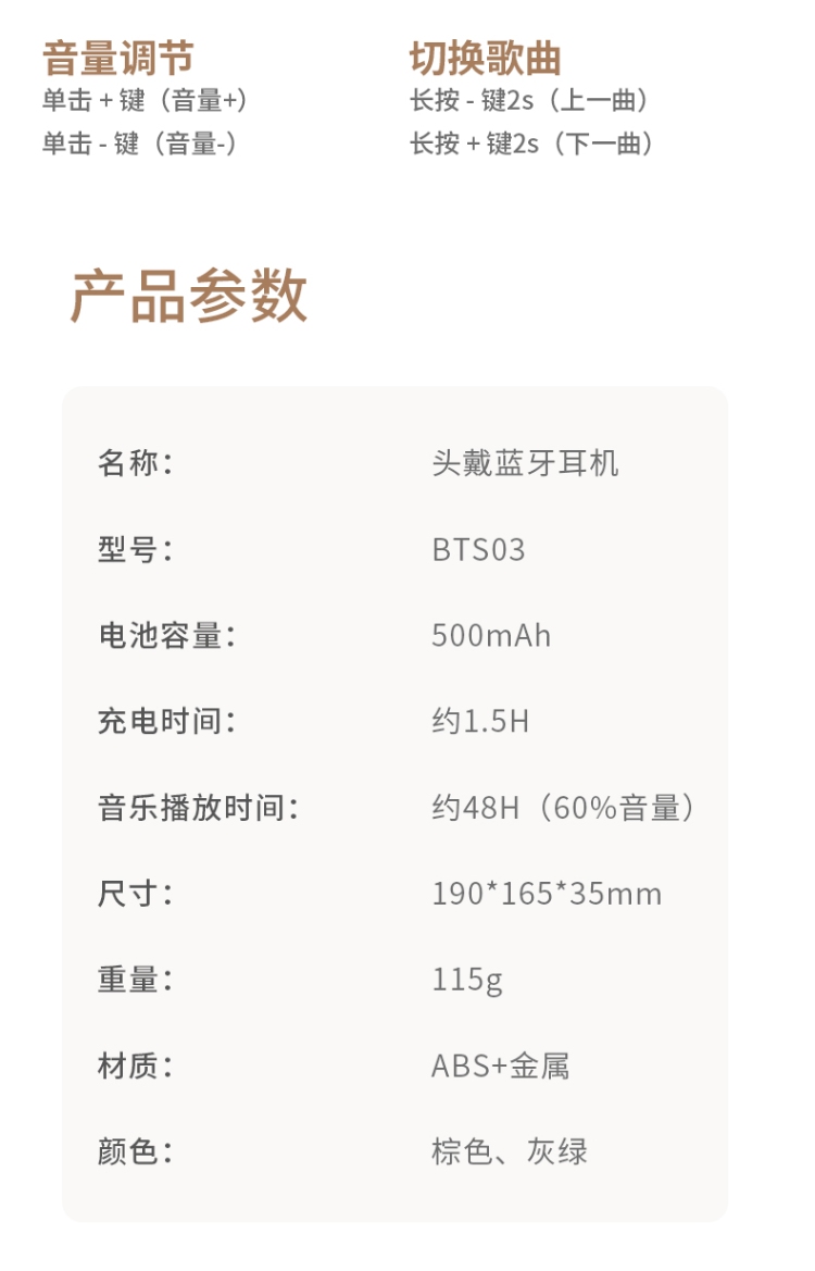 音乐通话时间:约48H(60%音量)颜色:棕色/灰绿