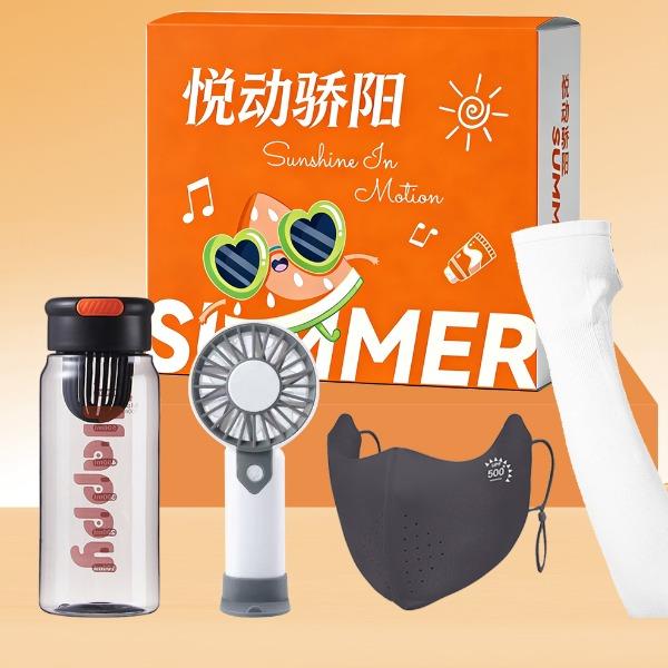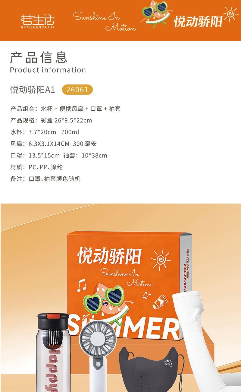 产品组合:水杯+便携风扇+口罩+袖套 水杯:7.7*20cm 700ml 风扇:6.3X3.1X14CM 300毫安 口罩:13.5*15cm 袖套: 10*38cm 材质:PC、PP、涤纶 包装:彩盒 重量/套:425g 备注:口罩、袖套颜色随机