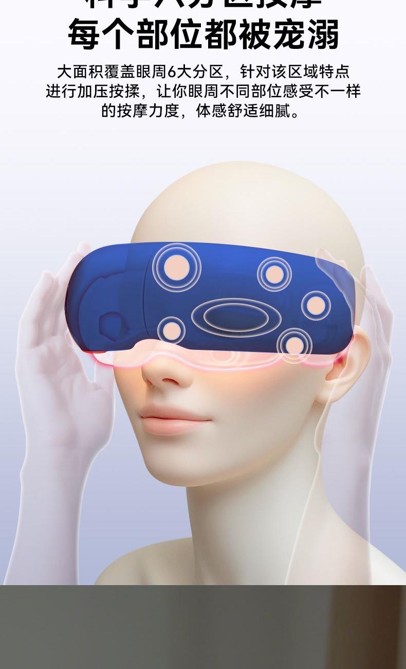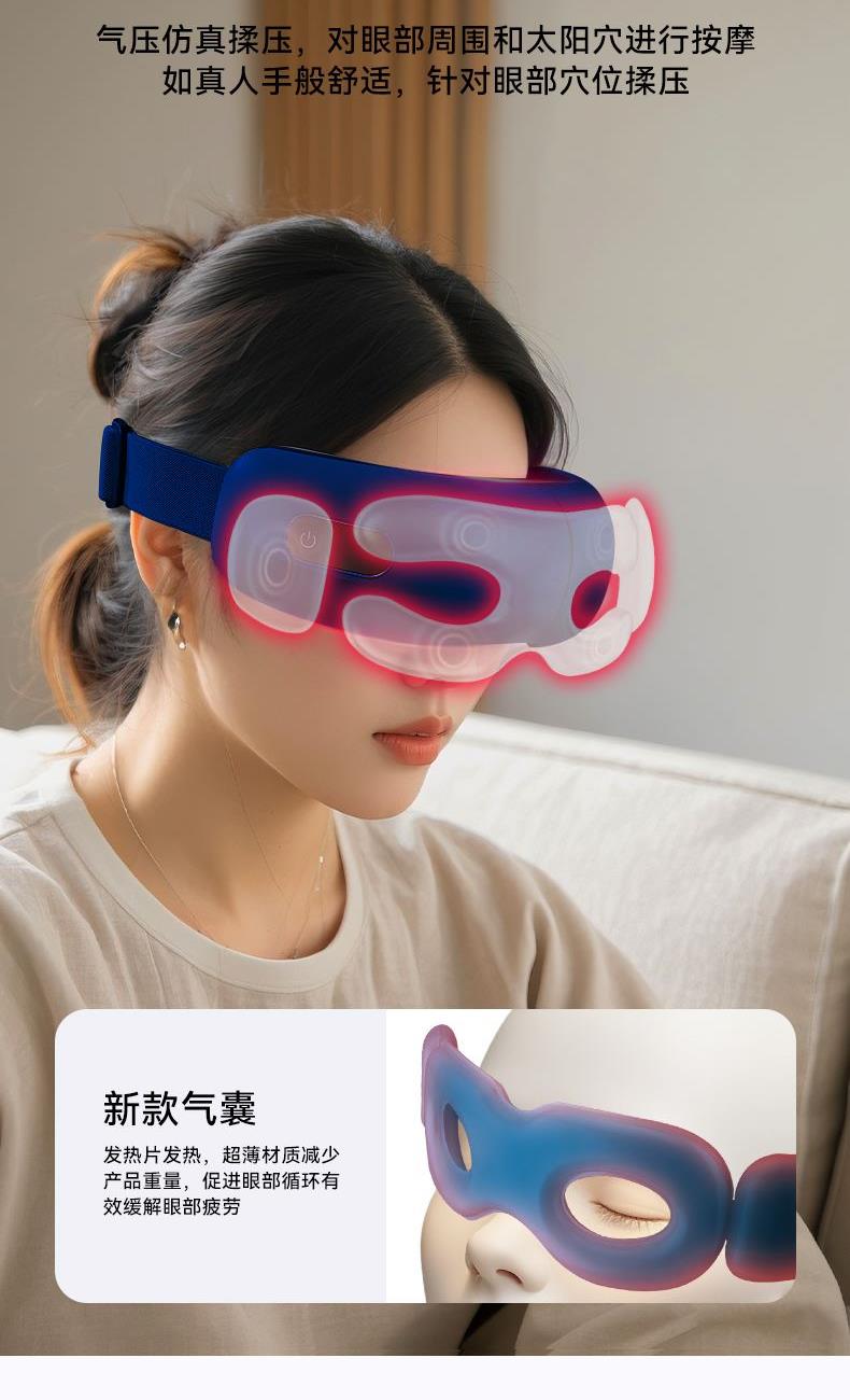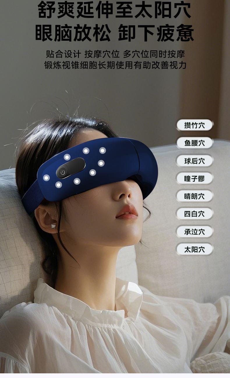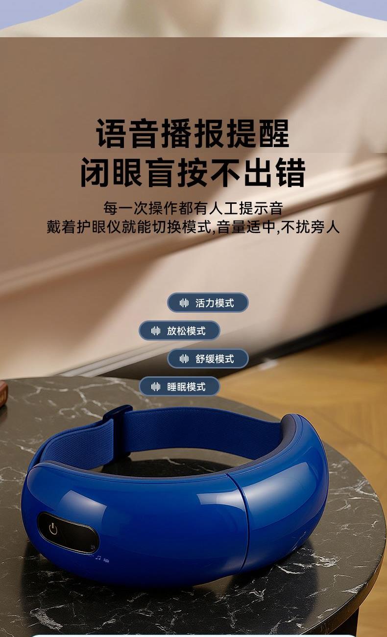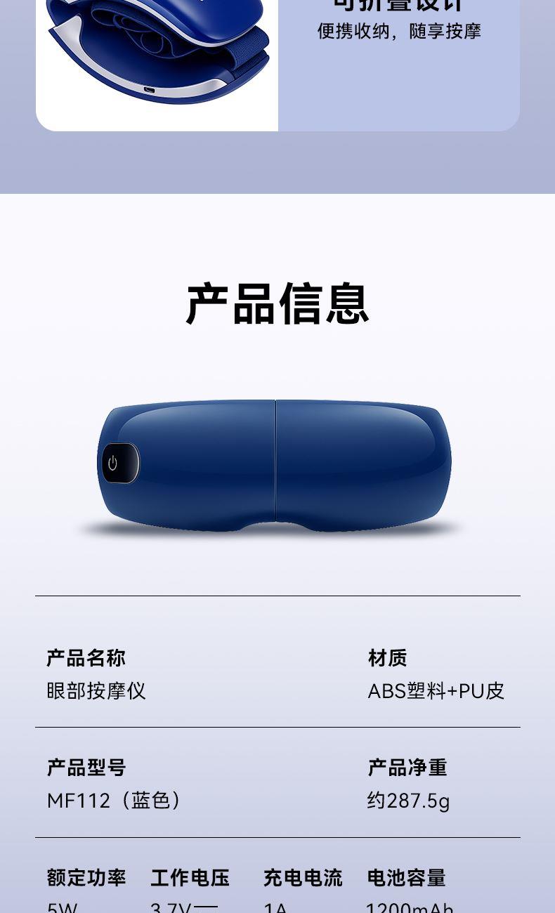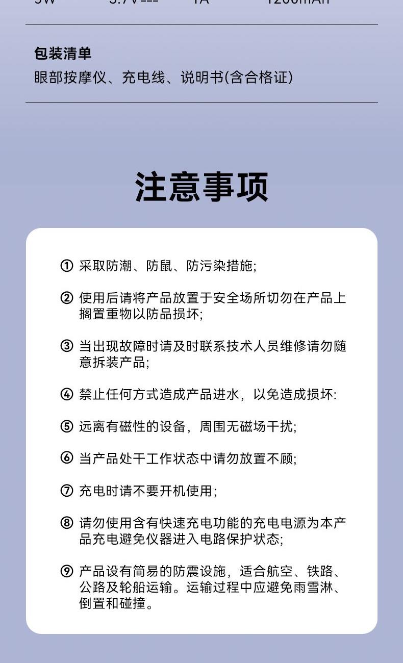 型号 MR3120 69码 6975660322547 产地 浙江温州 净重 170g 毛重 550g 包装尺寸 30X12.2X8cm 大箱尺寸 62.6x31.7x22cm 续航:≈180min 充电时间:1小时±0.5小时 充电电压:5V1A 额定功率:3w 工作电压:5V 充电接口:Type-C 电池容量:700毫安 执行标准:GB4706.1-2005/GB4706.10-2008 配件:主机,充电线,说明书 卖点: 3D环眼周穴位按摩,12颗独立震动马达,点对点放松眼周 太阳穴加大按摩头,更好适配眼周7大穴位 温感热敷模式,升级金属发热,3档速热,舒缓双眸 亲肤面料,柔和透气,久戴舒适 3档震动按摩,轻柔舒缓眼周,缓解疲劳 轻薄设计,180℃可折叠收纳携带