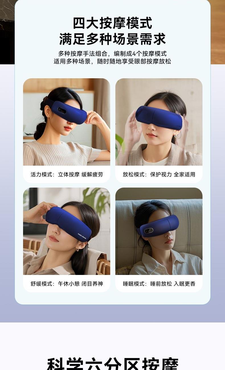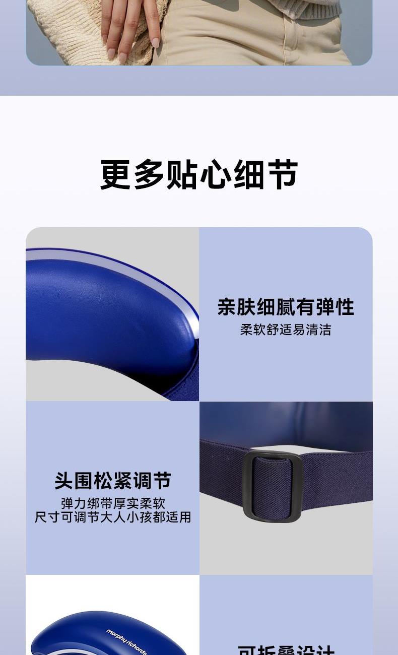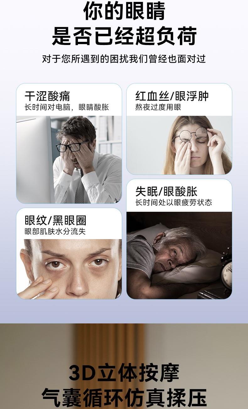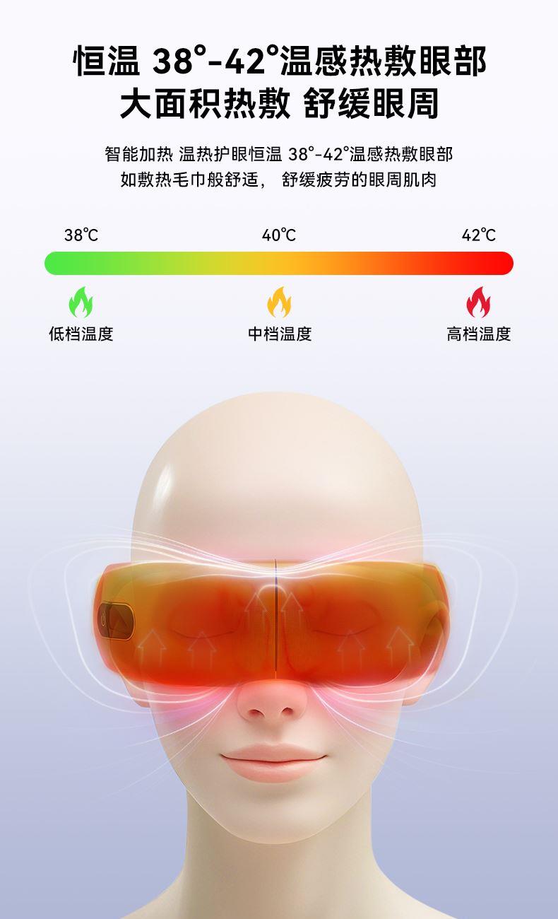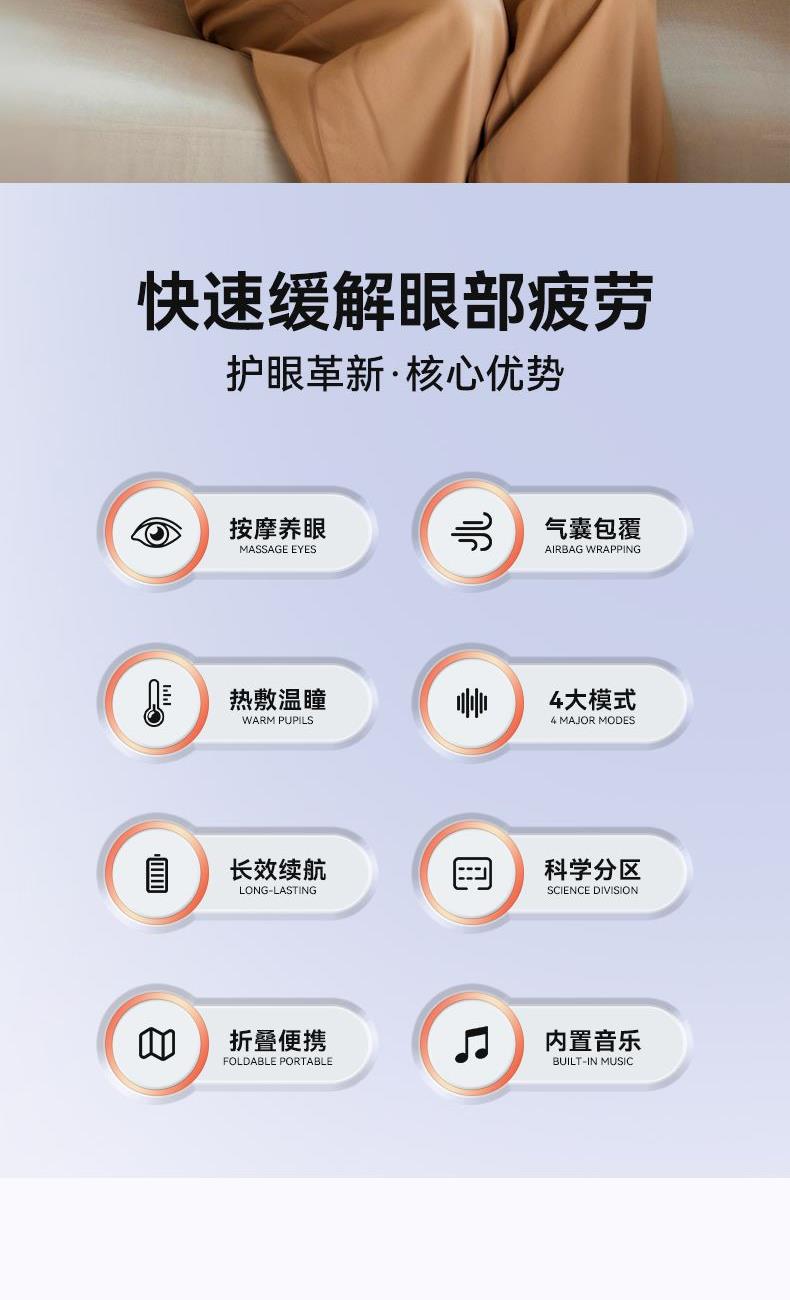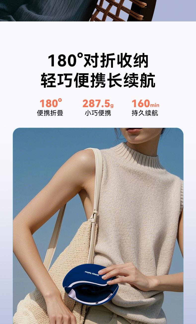 型号 MR3120 69码 6975660322547 产地 浙江温州 净重 170g 毛重 550g 包装尺寸 30X12.2X8cm 大箱尺寸 62.6x31.7x22cm 续航:≈180min 充电时间:1小时±0.5小时 充电电压:5V1A 额定功率:3w 工作电压:5V 充电接口:Type-C 电池容量:700毫安 执行标准:GB4706.1-2005/GB4706.10-2008 配件:主机,充电线,说明书 卖点: 3D环眼周穴位按摩,12颗独立震动马达,点对点放松眼周 太阳穴加大按摩头,更好适配眼周7大穴位 温感热敷模式,升级金属发热,3档速热,舒缓双眸 亲肤面料,柔和透气,久戴舒适 3档震动按摩,轻柔舒缓眼周,缓解疲劳 轻薄设计,180℃可折叠收纳携带