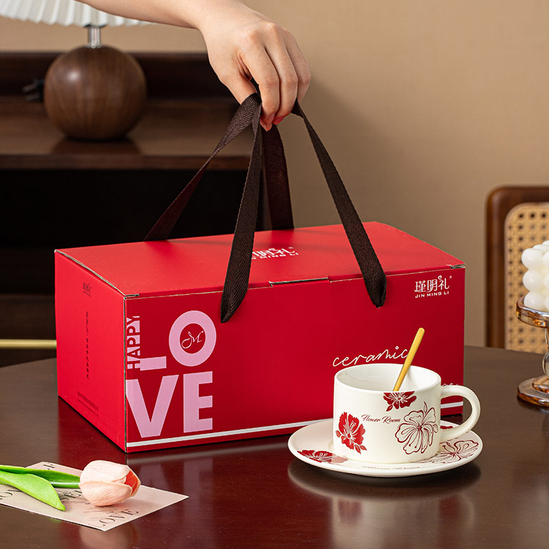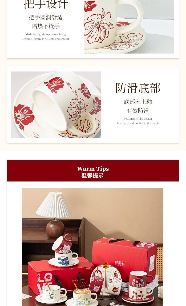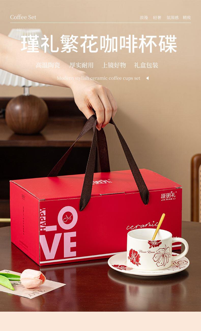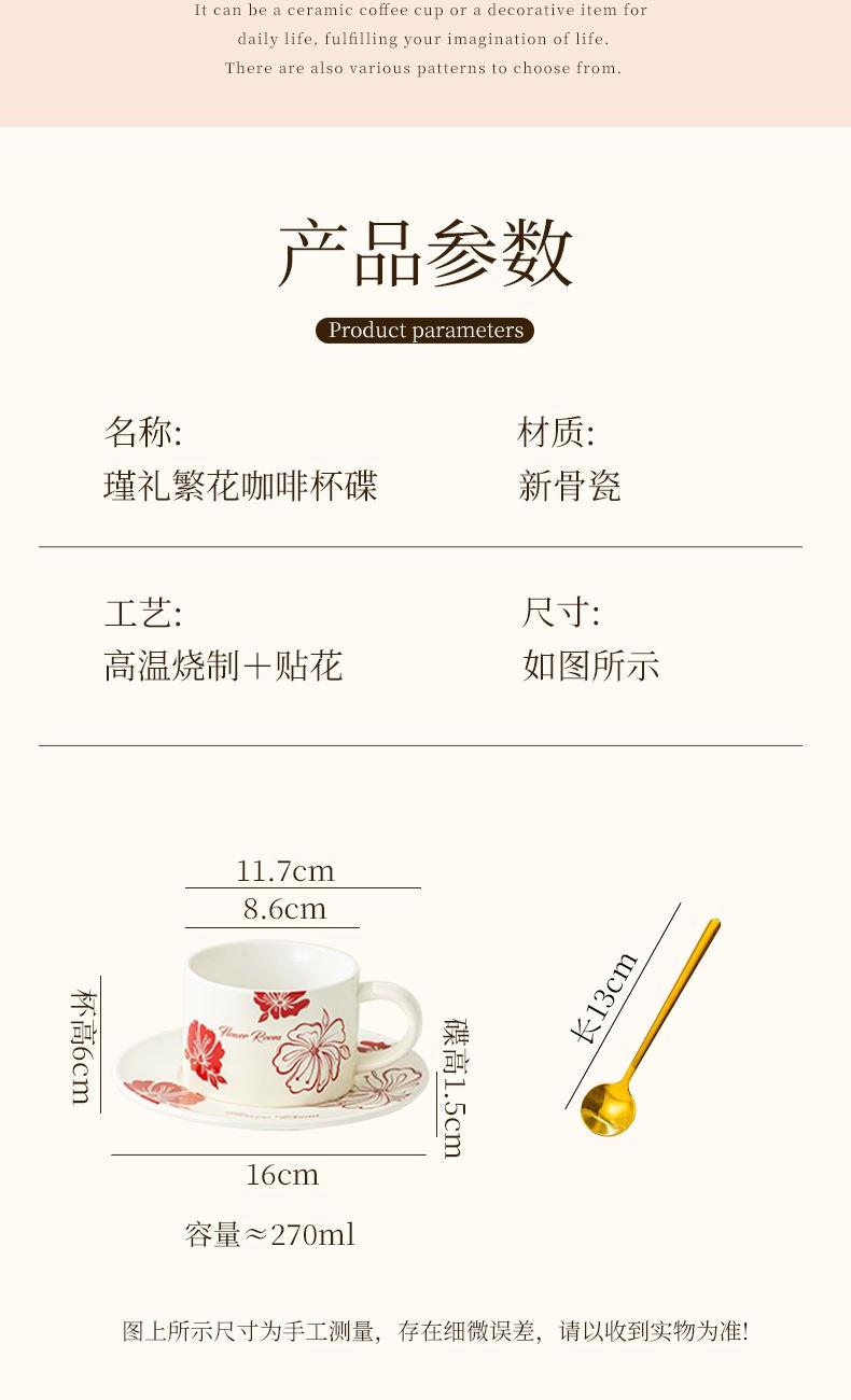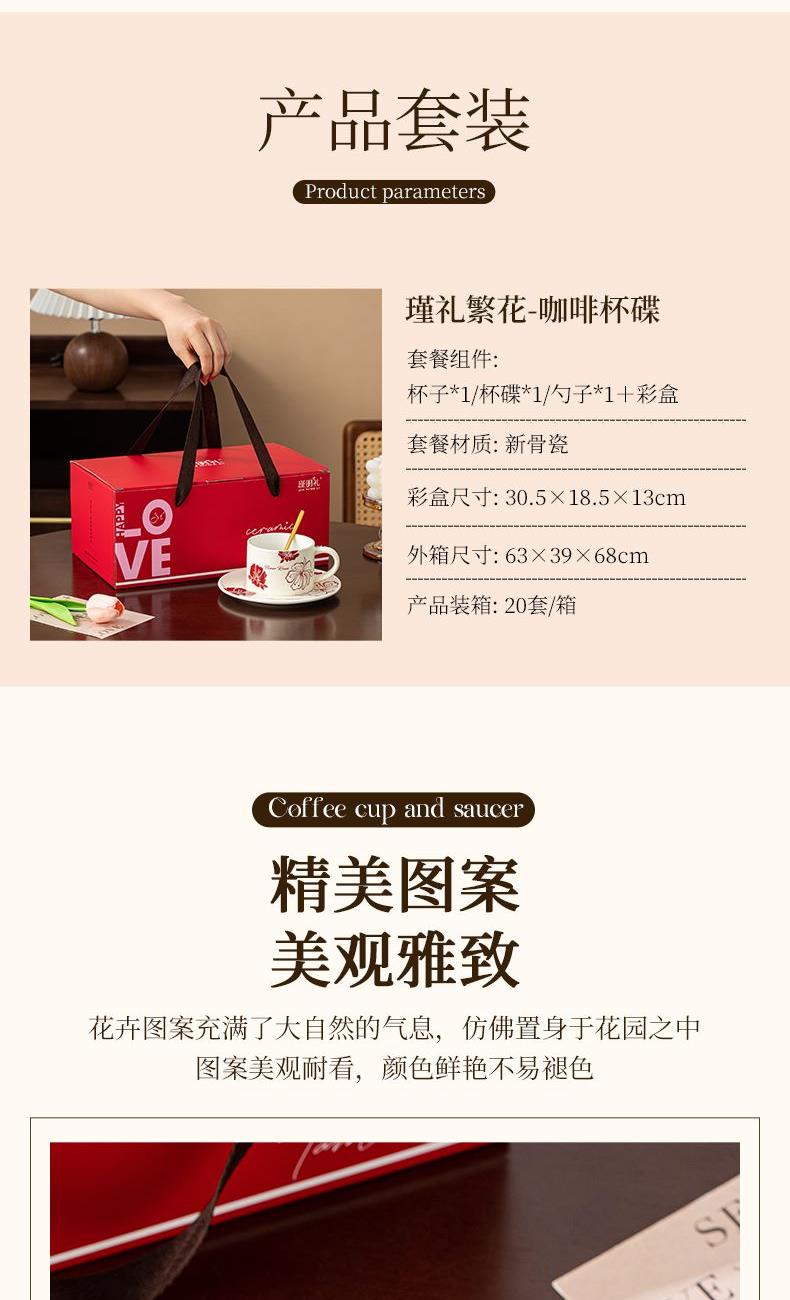 瑾礼繁花-咖啡杯碟-1杯1碟1勺(白色) - 产品组成:整套=1杯1碟1勺+彩盒 产品材质:新骨瓷 容量:270ml 产品规格:杯=口径8.6cm,高度=6cm;碟=长度16cm, 金勺=长13cm; 彩盒尺寸:30.5*18.5*13cm 产品毛重:0.8kg 整箱毛重:17.2kg 外箱尺寸:63*39*68cm - 花朵和植物图案能够让消费者在使用咖啡杯碟时感受到大自然的气息,仿佛置身于花园或森林之中。这种亲近自然的感觉能够缓解压力,带来内心的宁静和放松。消费者可以根据自己的喜好和需求选择具有特定寓意的图案,赋予咖啡杯碟更深层次的情感价值。