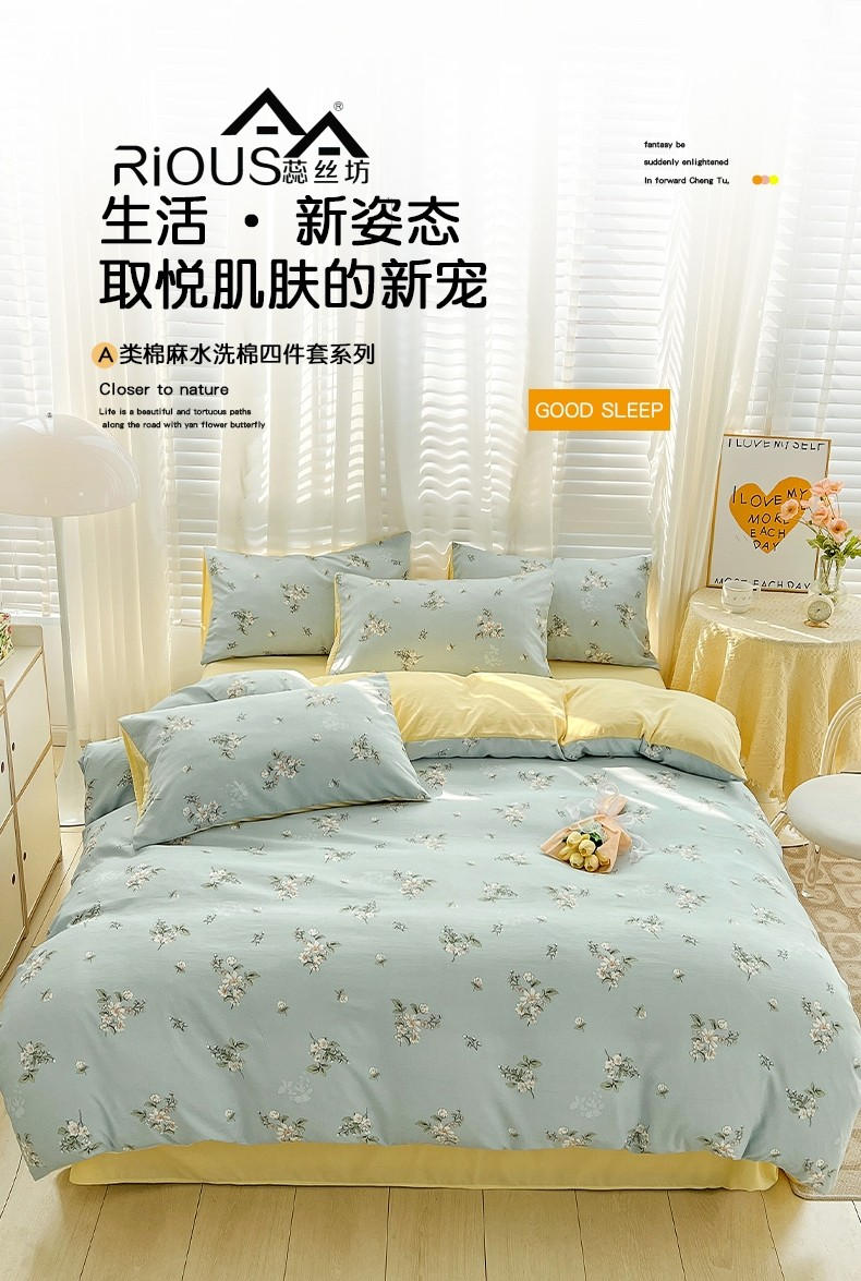 规格:被套200*230cm*1 床单230*245cm*1 枕套48*74cm*2 面料:水洗棉麻/聚酯纤维 花色:花季/花季-绿/花开半夏/花园兔/兰玫瑰/曼芮粉/曼塔玫瑰/玫瑰物语/枇杷树/清欢-蓝/四叶草-黄/微微安/维亚/小熊院长/云深茶白 法式小清新印花,面料A类棉麻水洗棉,柔软透气,软糯贴身拒绝僵硬手感,贴肤透气,细腻绵软,时尚AB双面设计,活性印染色牢度高不易褪色,不易起球,久洗如新!细致做工,内里欧式锁边,尽显匠心工艺,隐形拉链贴心系带