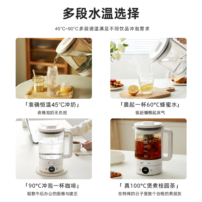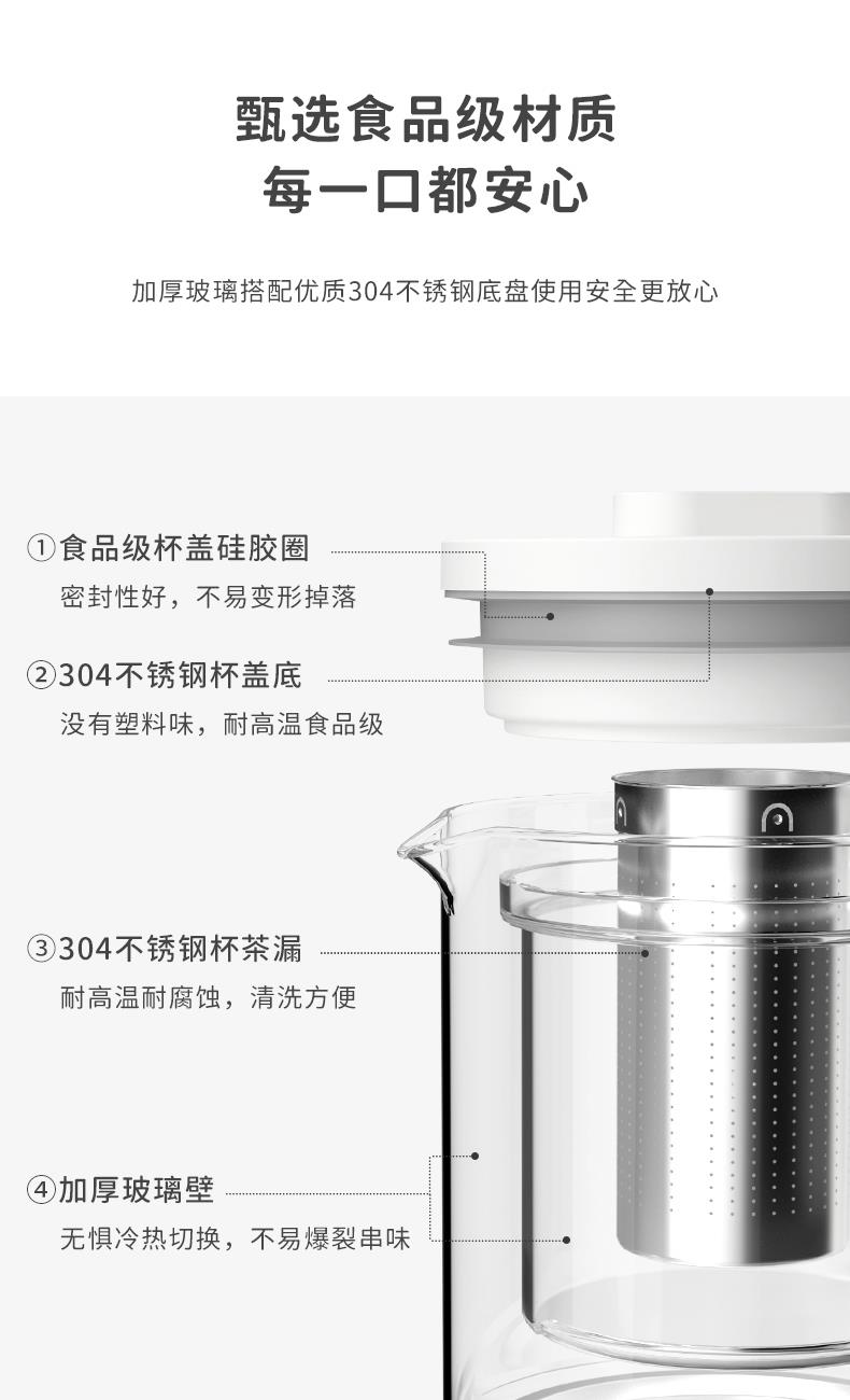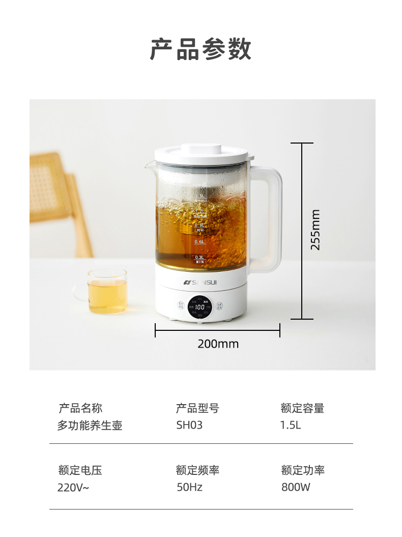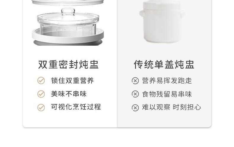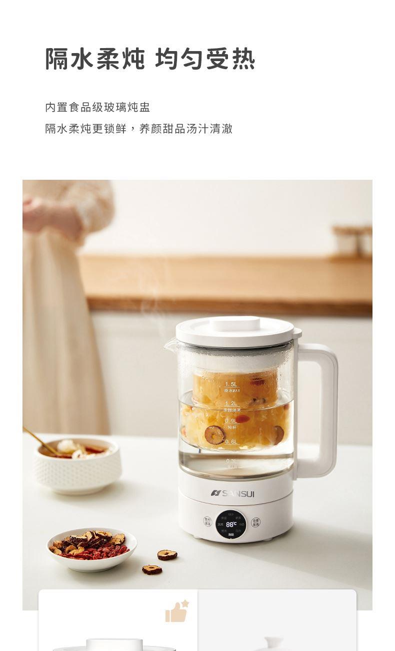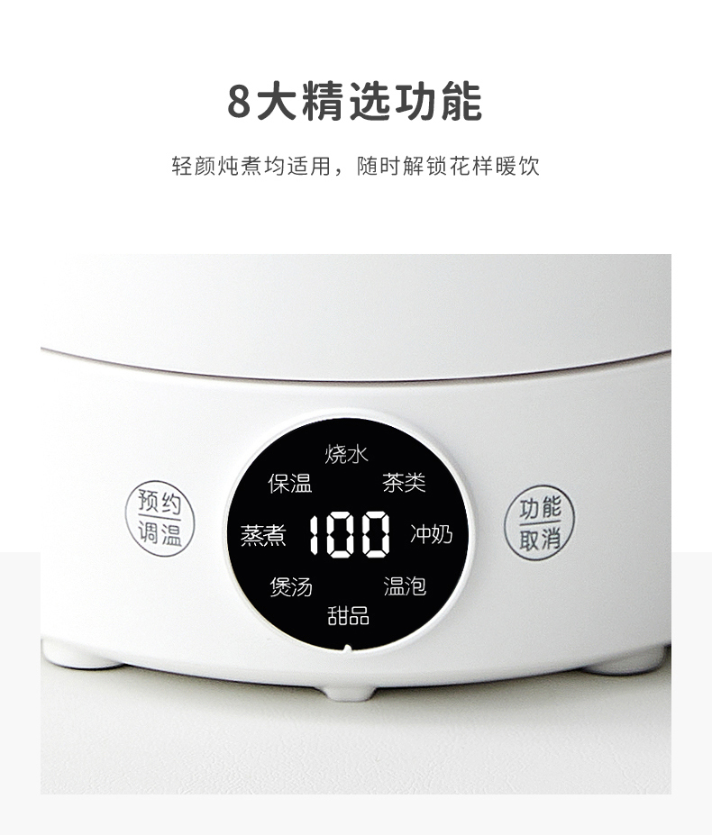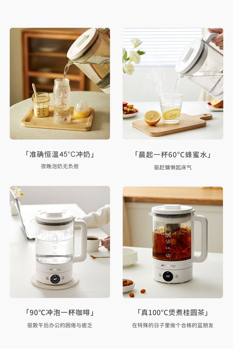 功率:800W 容量:1.5L 8大功能模式:烧水、茶类、冲奶、温泡、甜品、煲汤、煮粥 保温,高硼硅玻璃壶体,304不锈钢滤煮茶滤网,隔水玻璃炖盅、24小时预约,3分钟提壶记忆功能、冲奶、保温温度可调,上下结构可分离式底座、数码显示、一键通触控操作 包装方式: 彩包+邮购箱