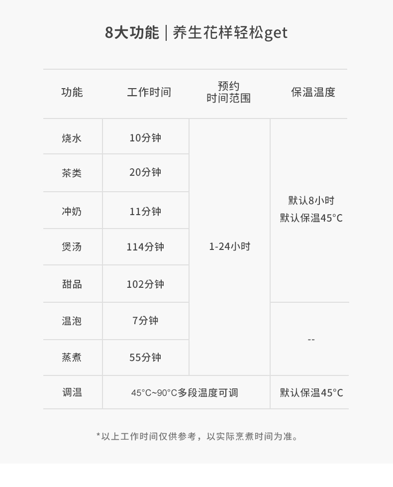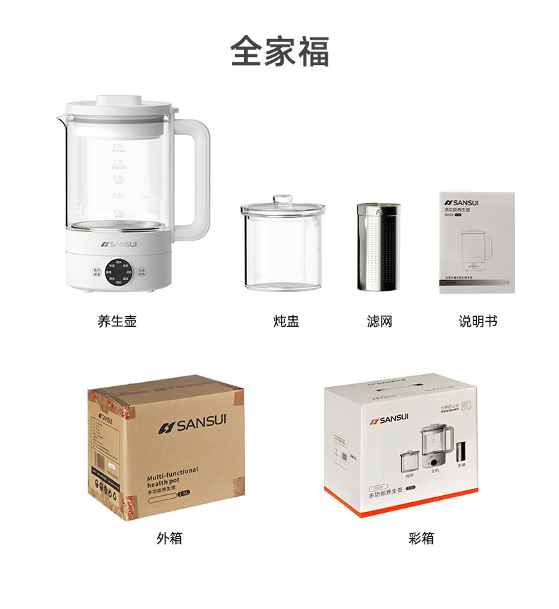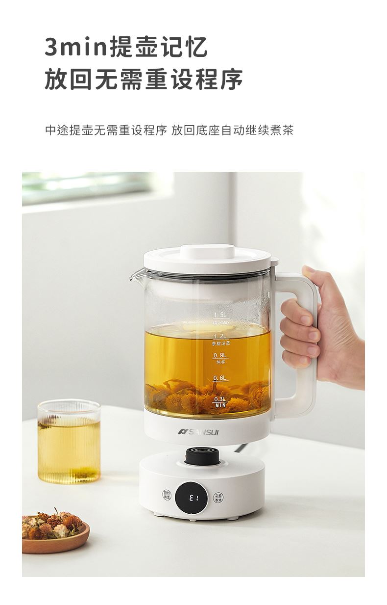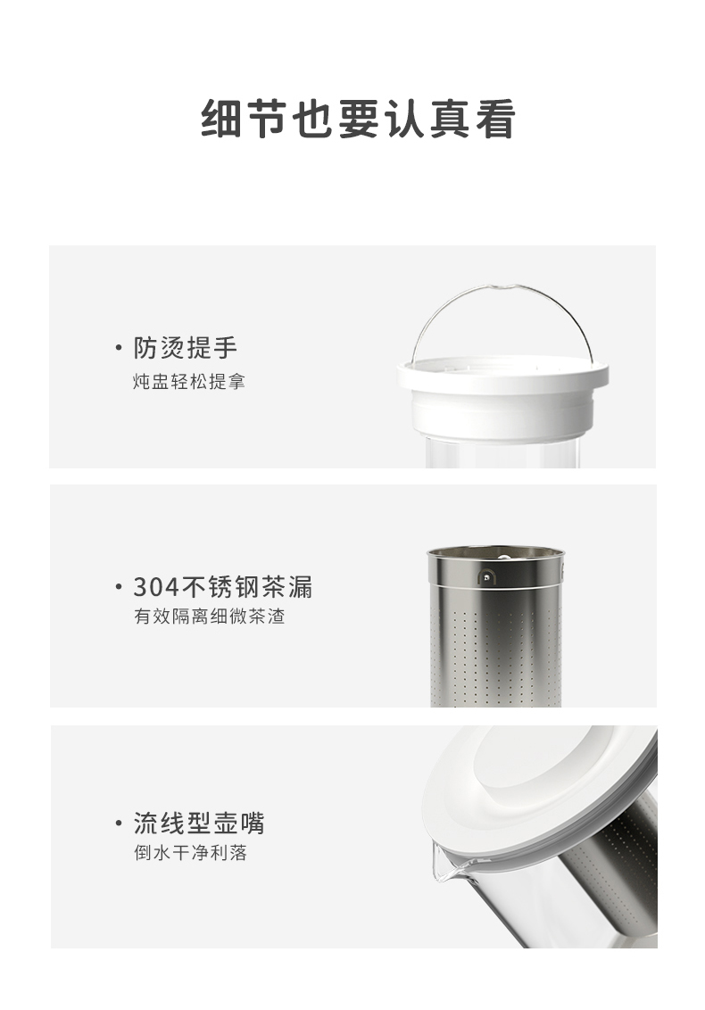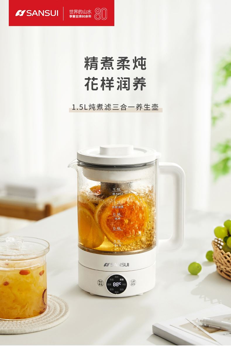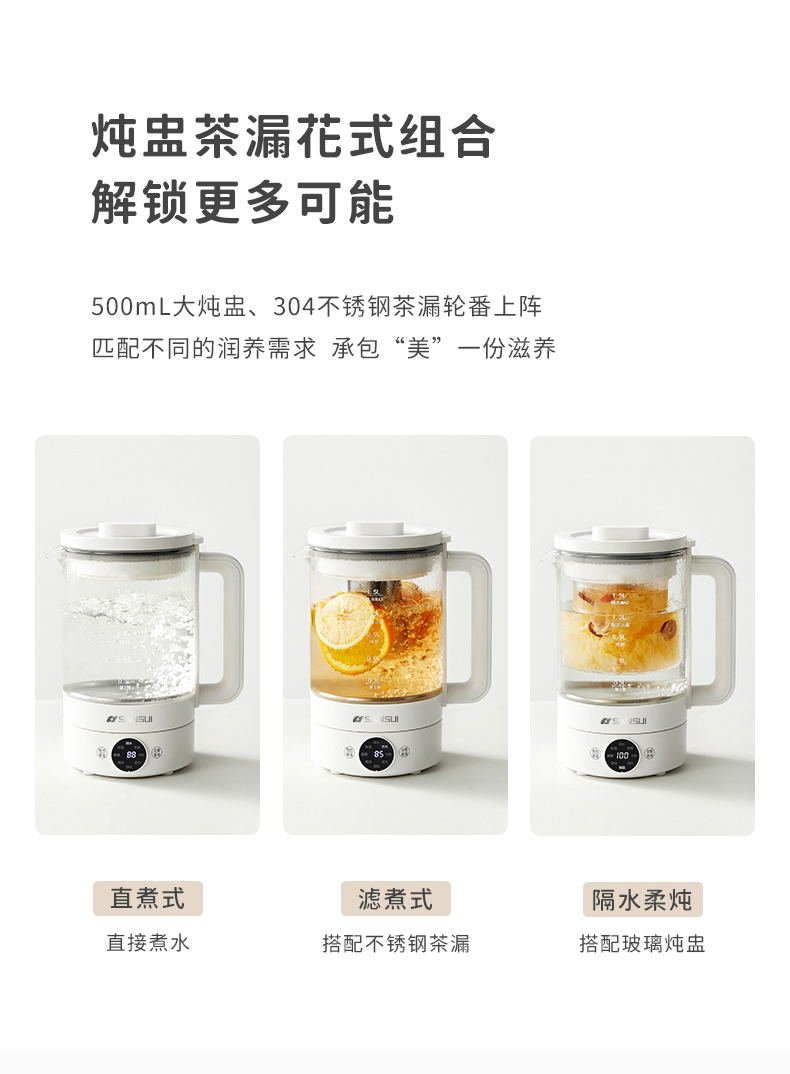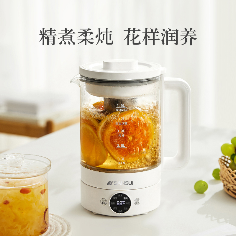 功率:800W 容量:1.5L 8大功能模式:烧水、茶类、冲奶、温泡、甜品、煲汤、煮粥 保温,高硼硅玻璃壶体,304不锈钢滤煮茶滤网,隔水玻璃炖盅、24小时预约,3分钟提壶记忆功能、冲奶、保温温度可调,上下结构可分离式底座、数码显示、一键通触控操作 包装方式: 彩包+邮购箱