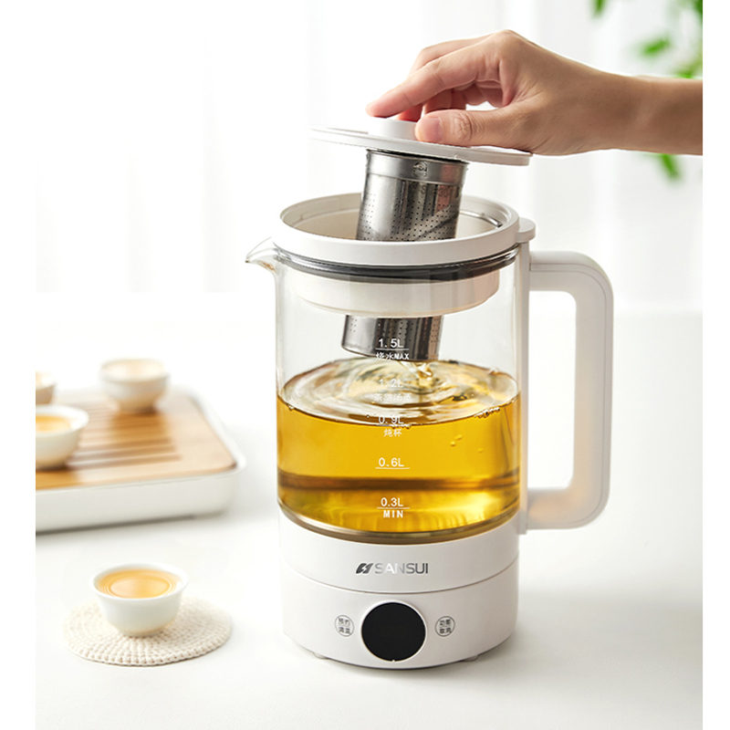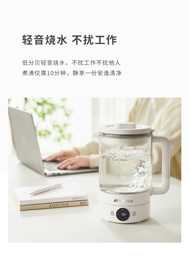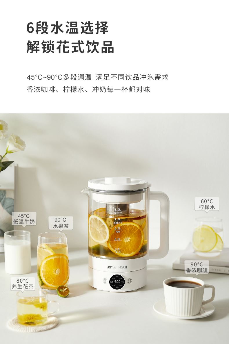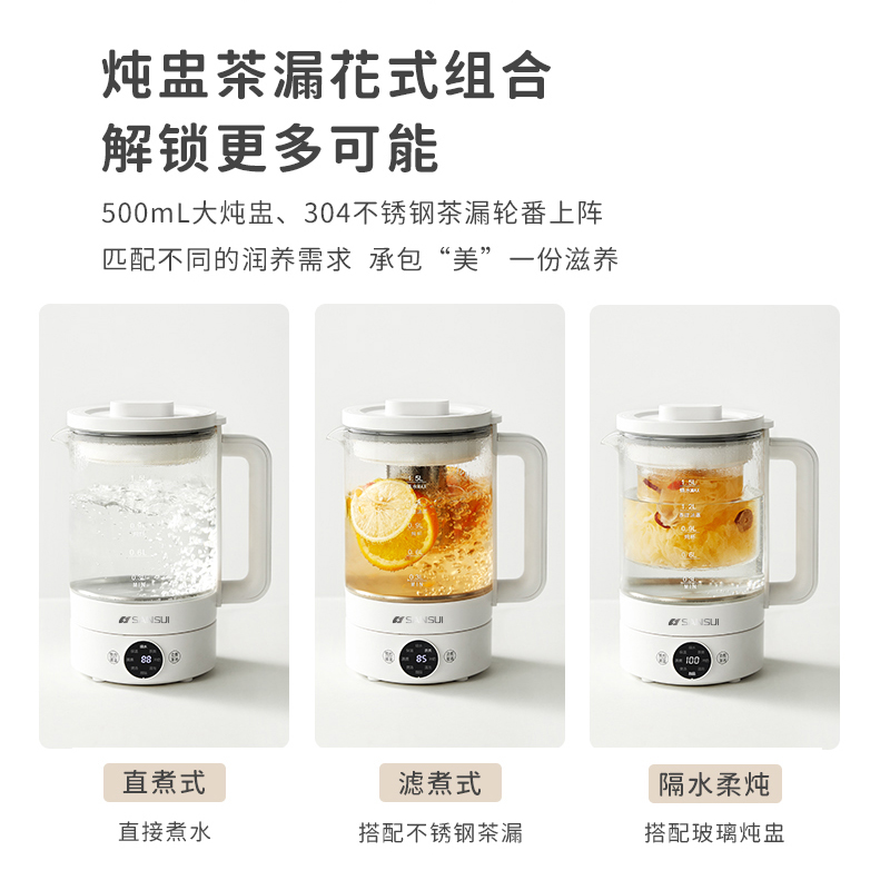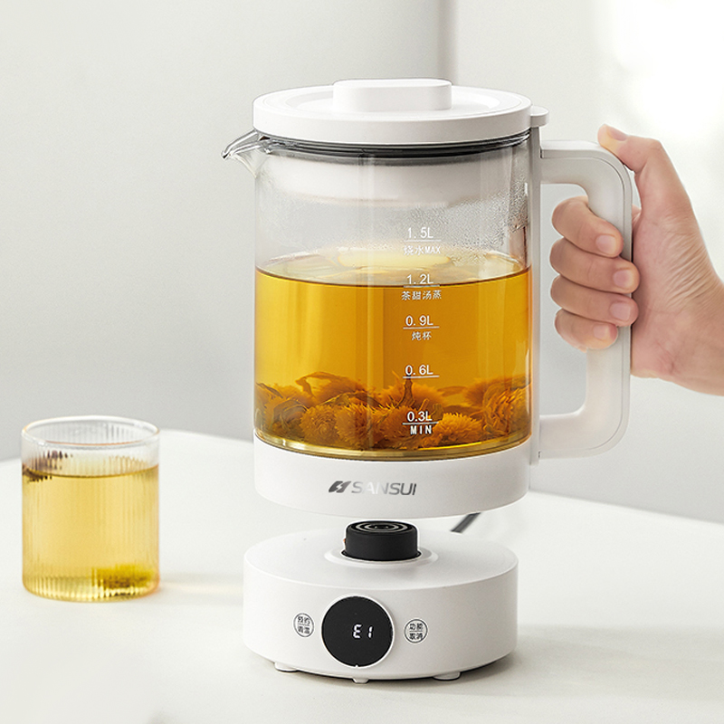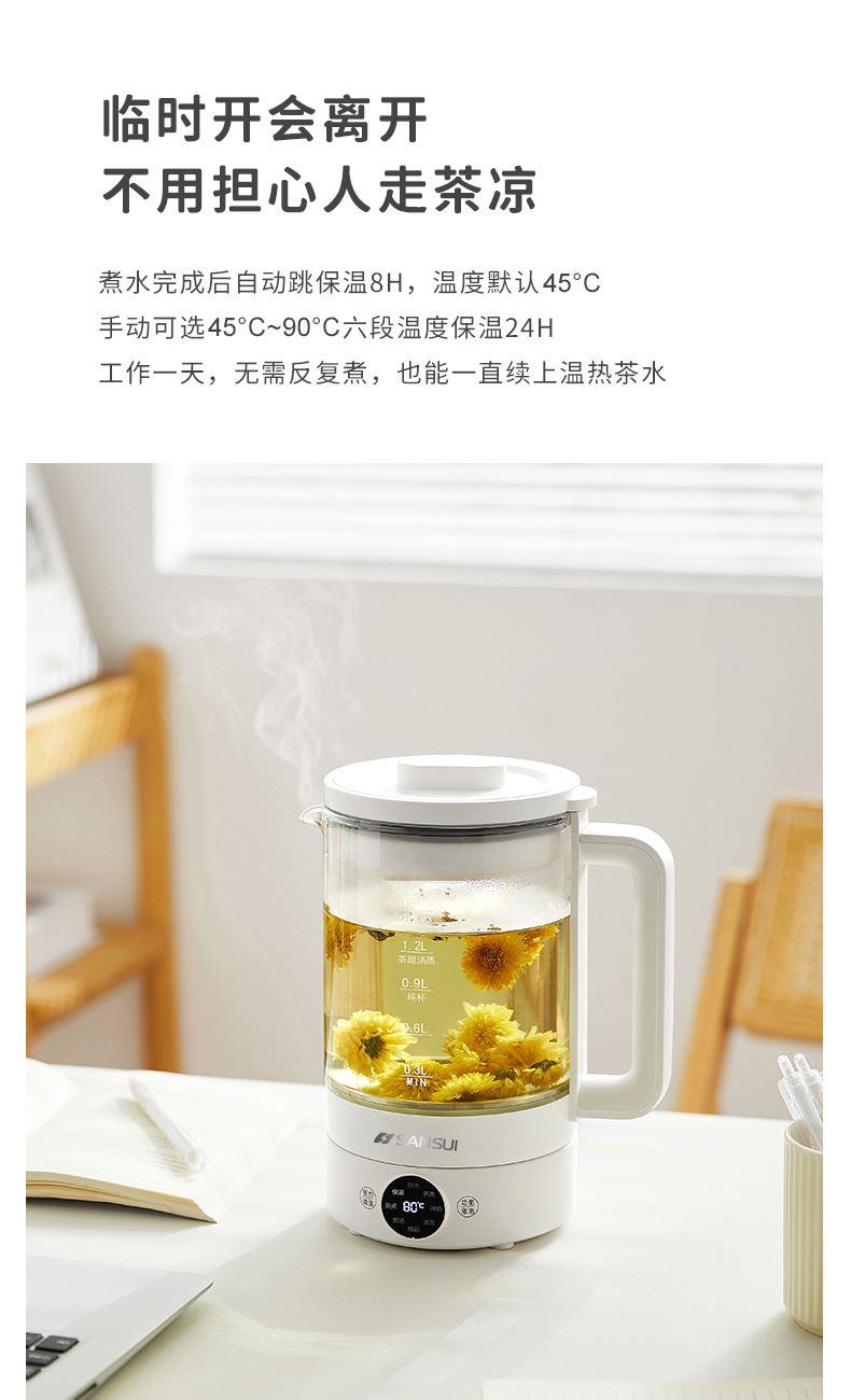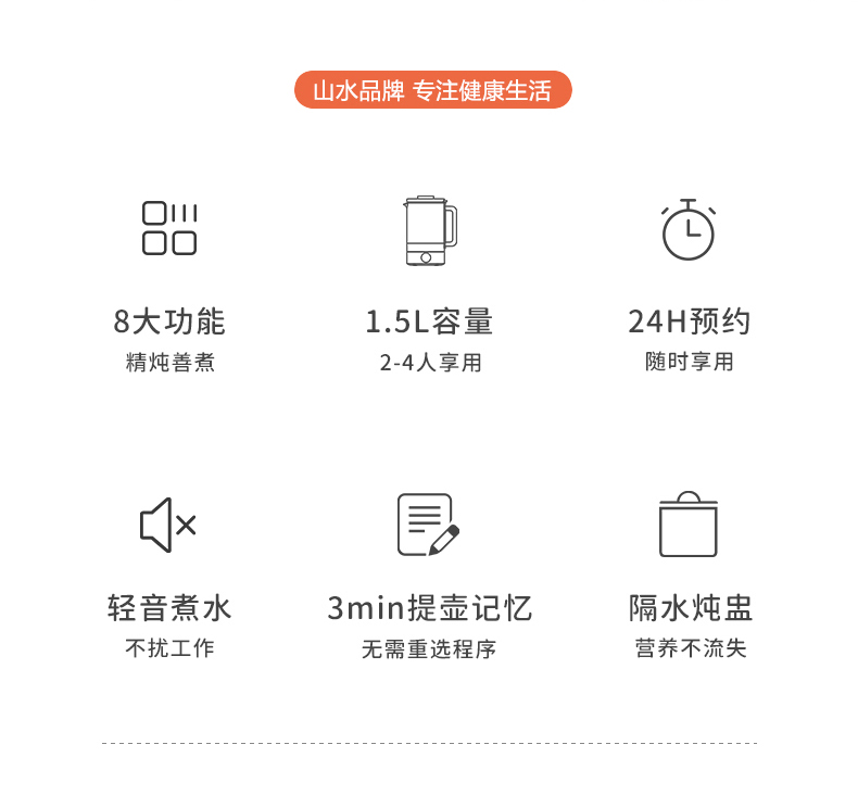 功率:800W 容量:1.5L 8大功能模式:烧水、茶类、冲奶、温泡、甜品、煲汤、煮粥 保温,高硼硅玻璃壶体,304不锈钢滤煮茶滤网,隔水玻璃炖盅、24小时预约,3分钟提壶记忆功能、冲奶、保温温度可调,上下结构可分离式底座、数码显示、一键通触控操作 包装方式: 彩包+邮购箱