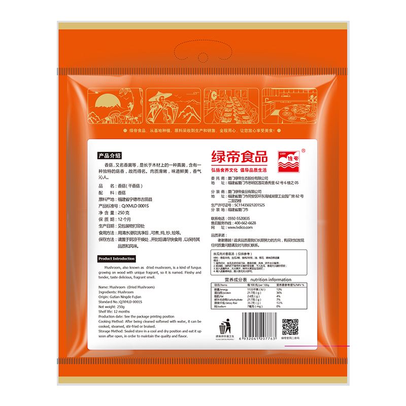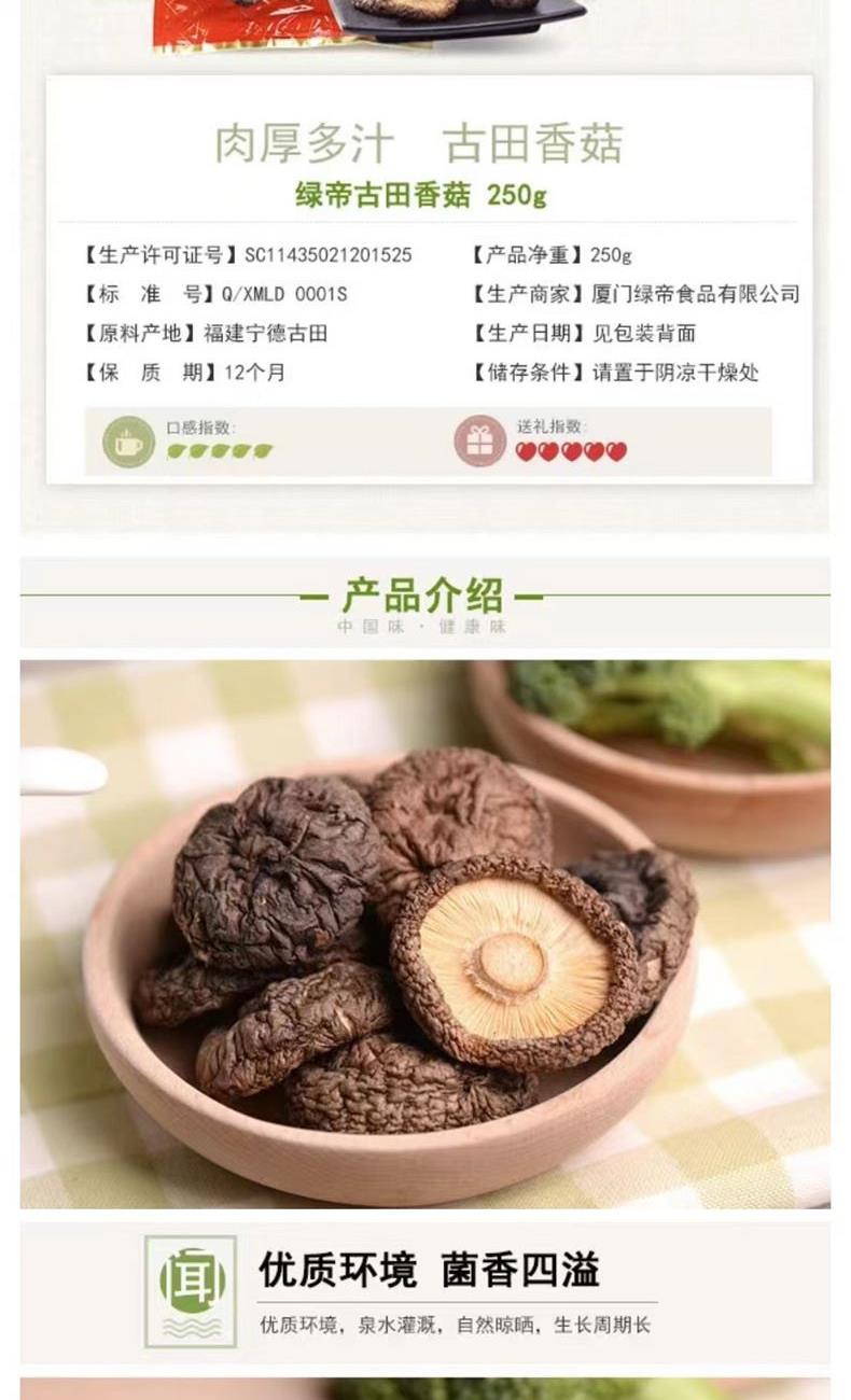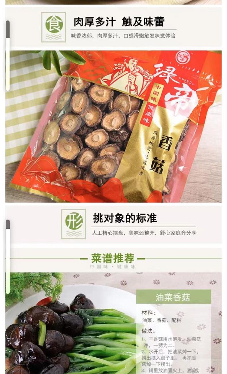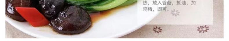 配料:香菇 原料产地:福建省宁德市古田县 净含量:250克 保质期:12个月 生日日期:见包装物打印处 食用方法:用清水浸软洗净后,可煮、炖、炒、烩等 香菇,又名香菌等,是长于木材上的一种真菌,含有一种独特的菇香,故而得名。肉质滑嫩,味道鲜美,香气沁人。