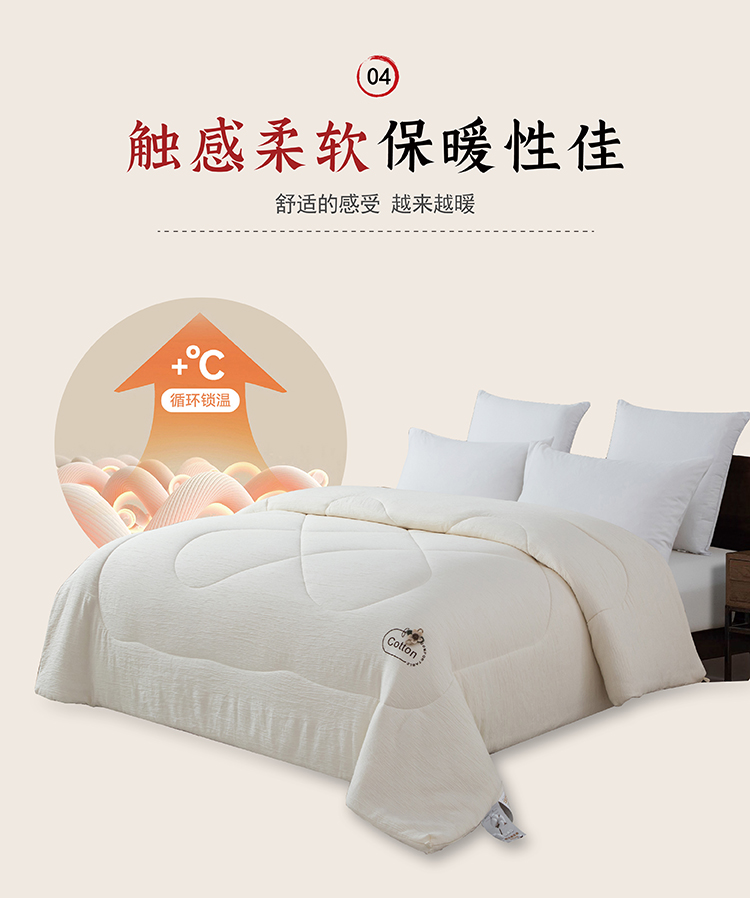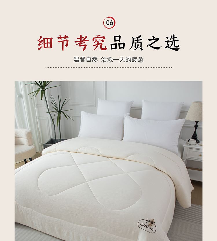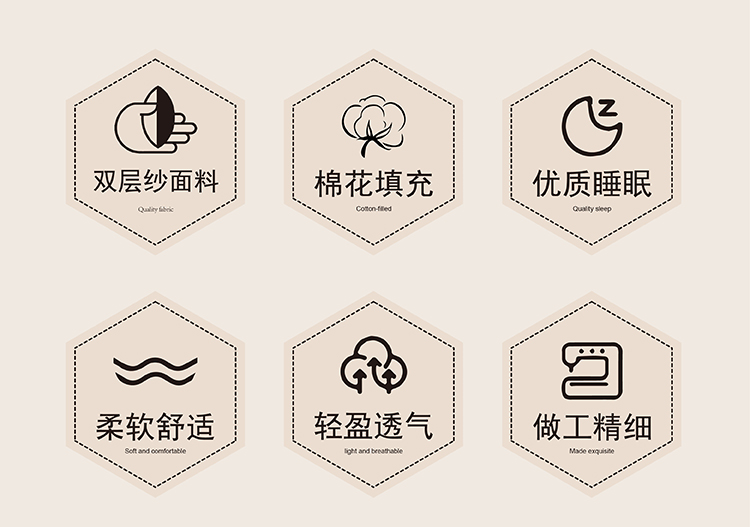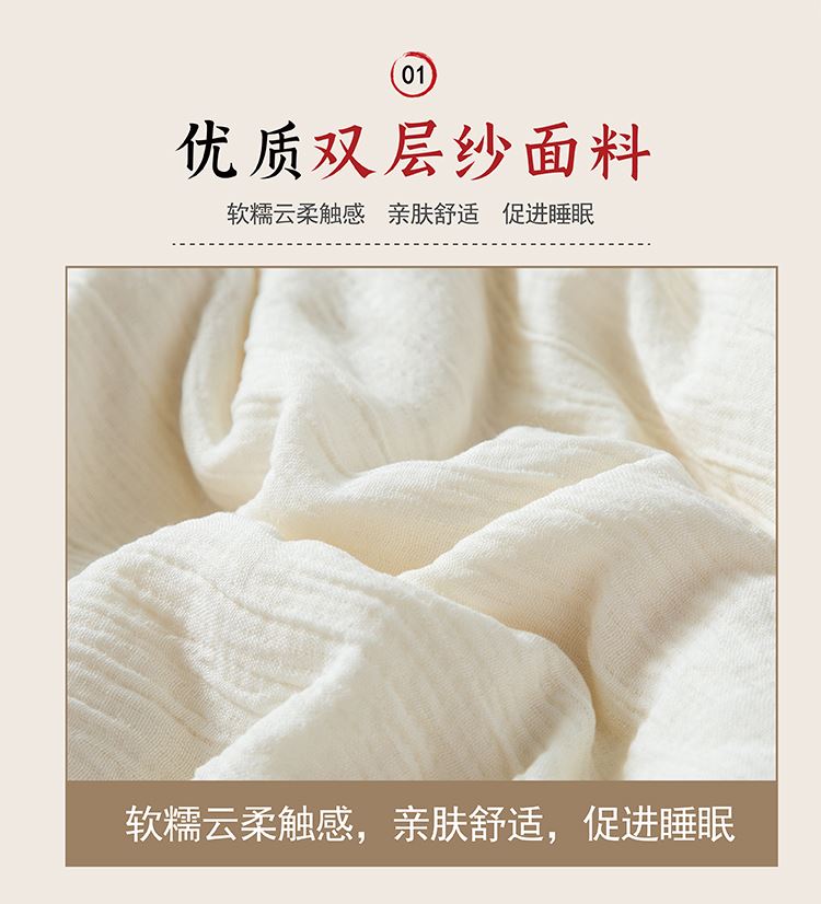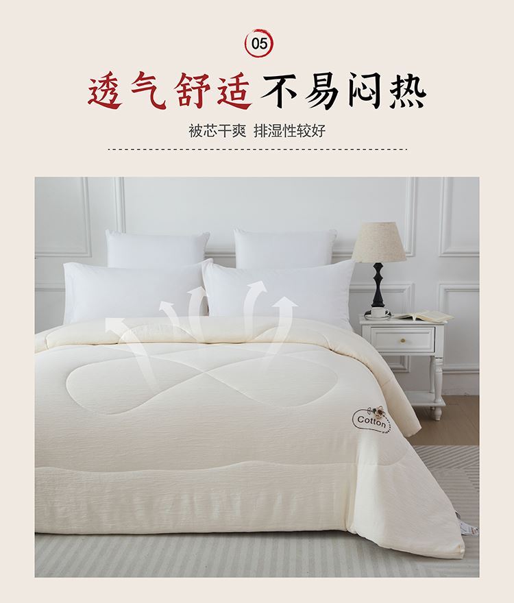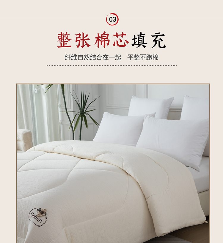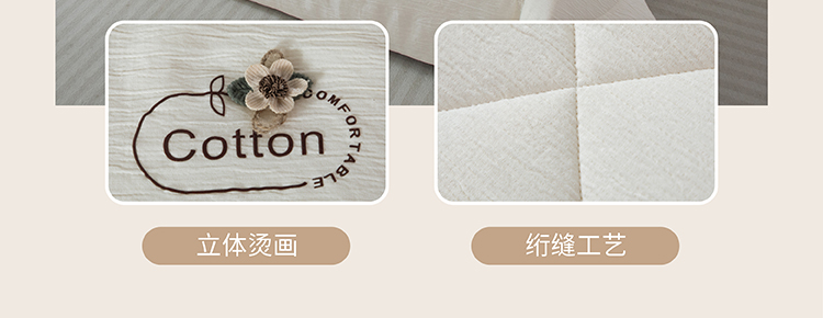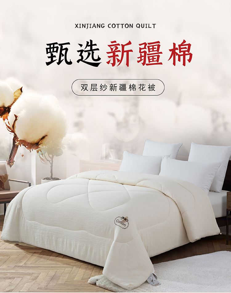 尺寸:200x230cm 填充物:1500g 被重:2900g 【面 料】双层纱(聚酯纤维) 【填充物】棉花 产品特点: 1.双层纱面料,软糯云柔触感,亲肤舒适,促进睡眠; 2.被芯采用优质新疆棉花填充,透气舒适,保暖性能佳; 3.整张棉芯填充,平整不跑棉; 4.被角立体烫画工艺点缀,温馨。