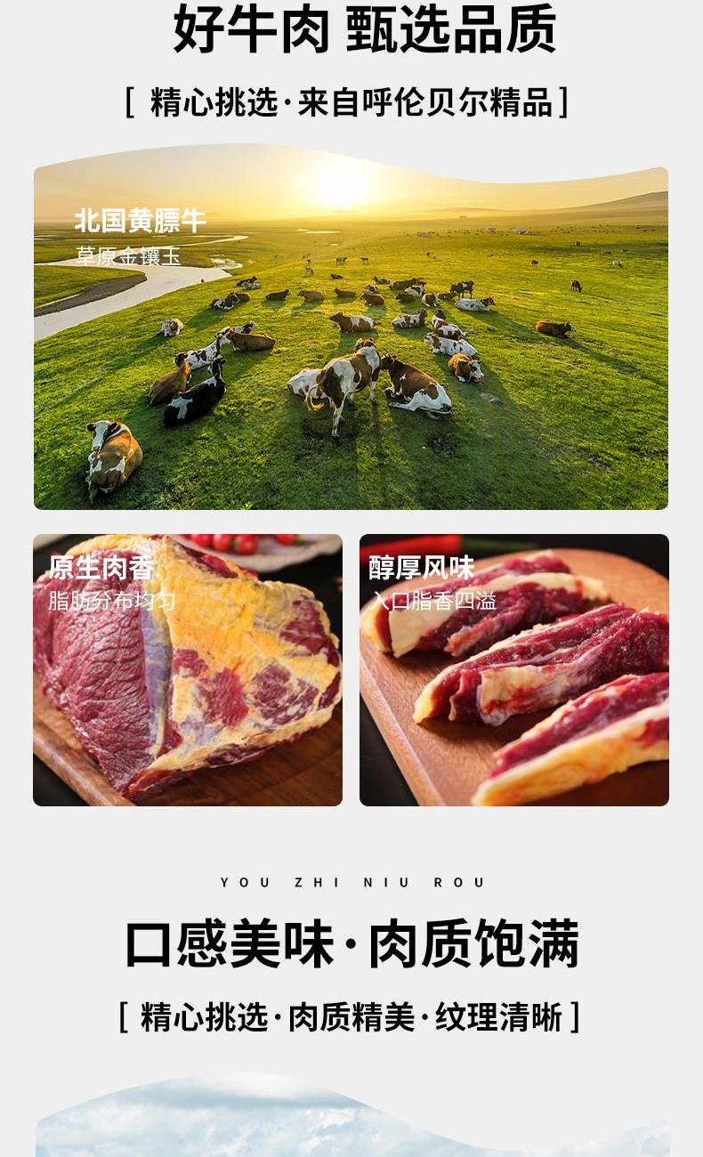 配置: 呼伦贝尔南屯黄膘牛霖 500g 呼伦贝尔南屯黄膘牛排 500g 呼伦贝尔南屯黄膘牛西冷 500g 呼伦贝尔南屯黄膘牛脖骨 500g*2 赠品:呼伦贝尔韭菜花酱1袋 南屯,即呼伦贝尔市鄂温克旗巴彦托海镇,地处我国温带草原核心区,这里水草丰美,生长着数百种优质牧草,被誉为 “牧草王国”。 独特的气候与生态环境,让这里成为畜牧黄金带,南屯黄膘牛肉的 “黄膘” 堪称天然印记:牛群在草原上自由采食富含胡萝卜素和叶黄素的牧草,而牛体内缺乏分解这些色素的酶,色素便在脂肪中累积,形成鲜明的黄色或橙色脂肪层。