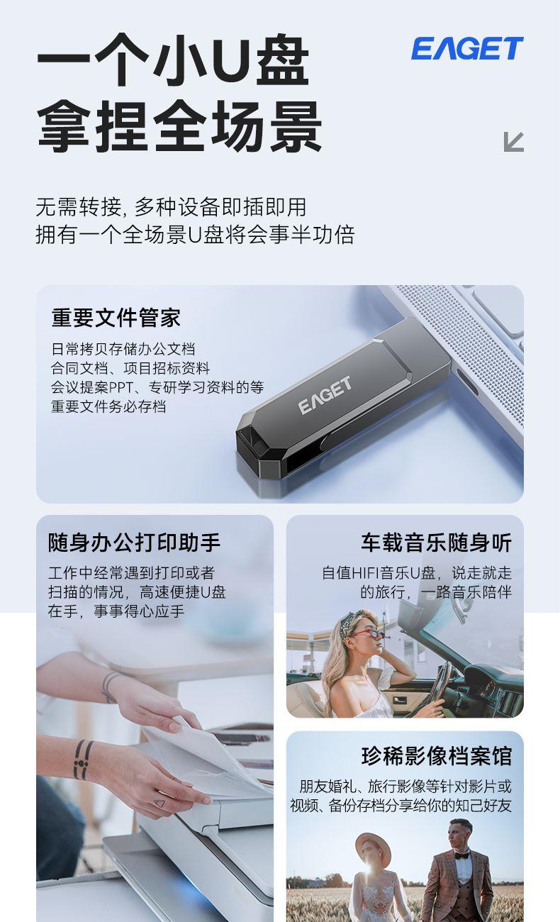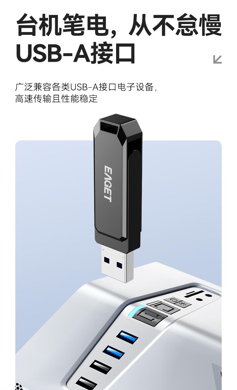 接口采用USB3.2, 高速接口协议传输文件高效稳定 Flash 芯片高速版 360°旋转保护安全堡垒 锖色电镀金属效果,坚固耐用 产品尺寸:63.8x15x9.35 mm 单品重量:22g
