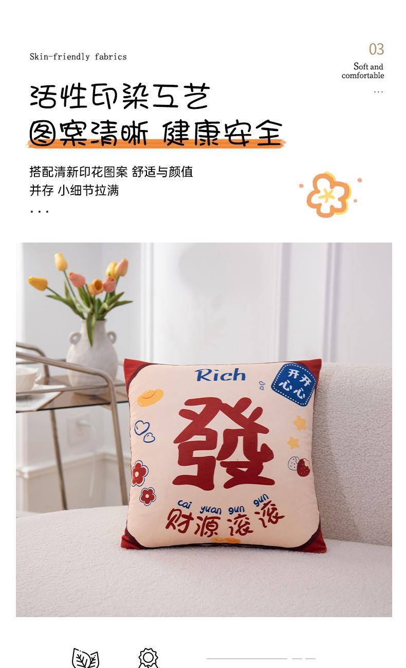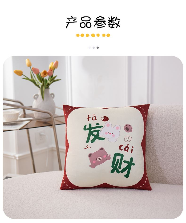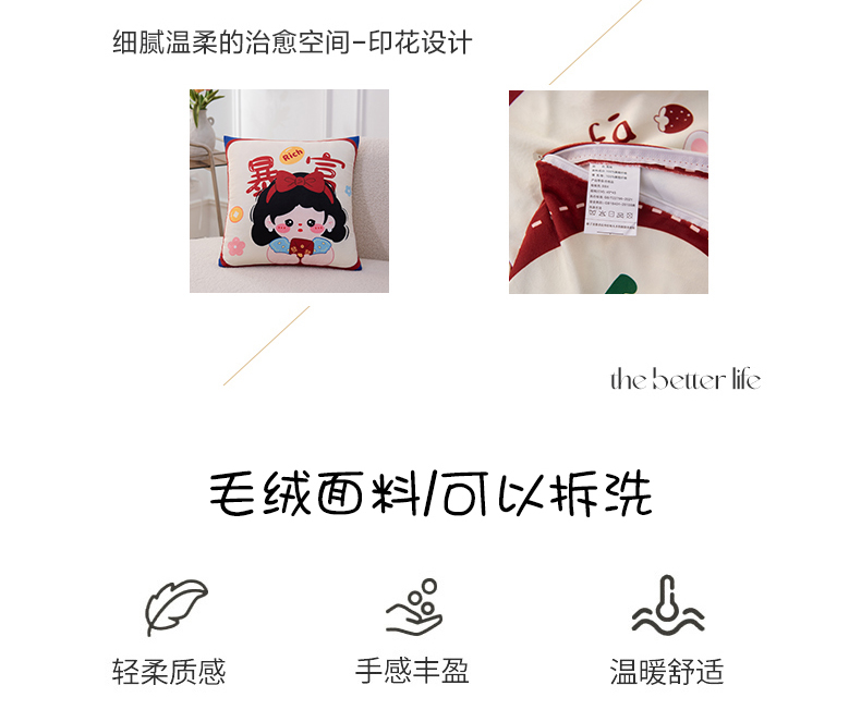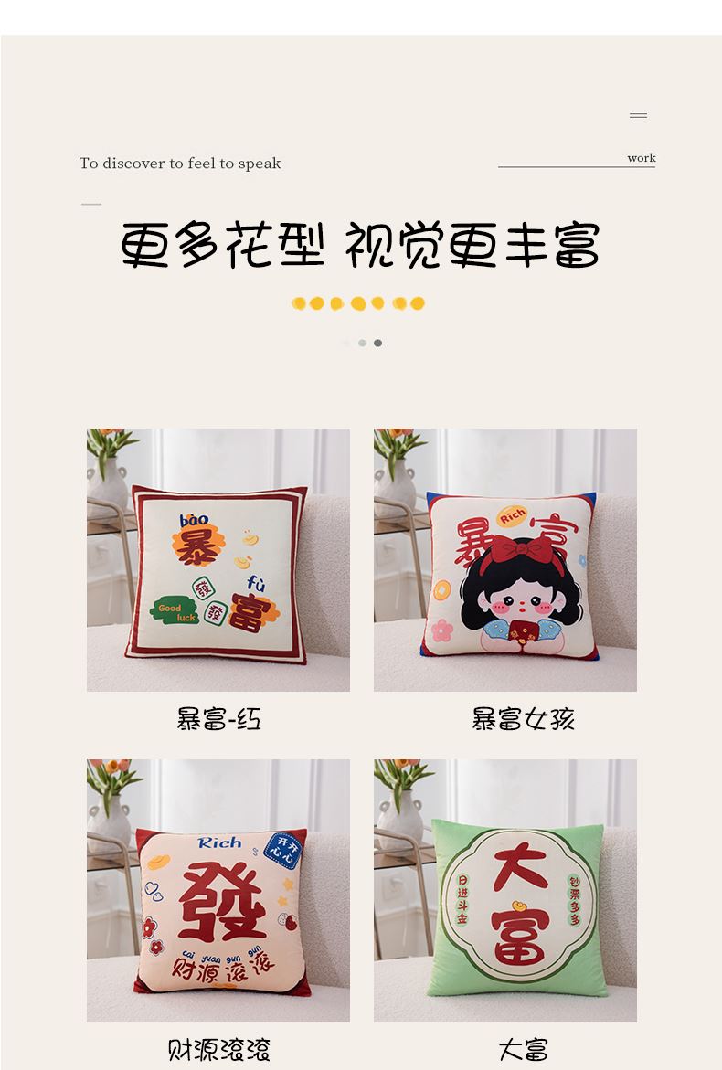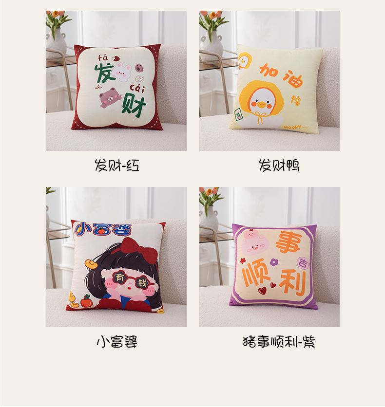 花色:暴富-红/暴富女孩/财源滚滚/大富/发财-红/发财鸭/小富婆/猪事顺利-紫 规格:40*40cm 面料:短毛绒(聚酯纤维) 填充:聚酯纤维 短毛绒面料,绒毛细腻,柔软亲肤,触感舒适;填充饱满,回弹迅速;活性印染工艺,图案清晰,色牢度高,不易脱色,外套可拆洗。午休枕,沙发靠枕,飘窗坐垫,汽车靠垫,一枕多用。