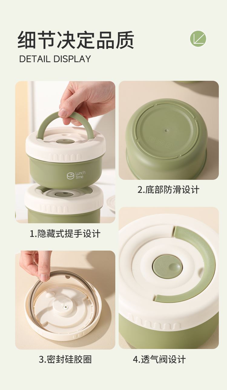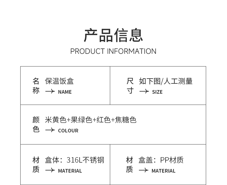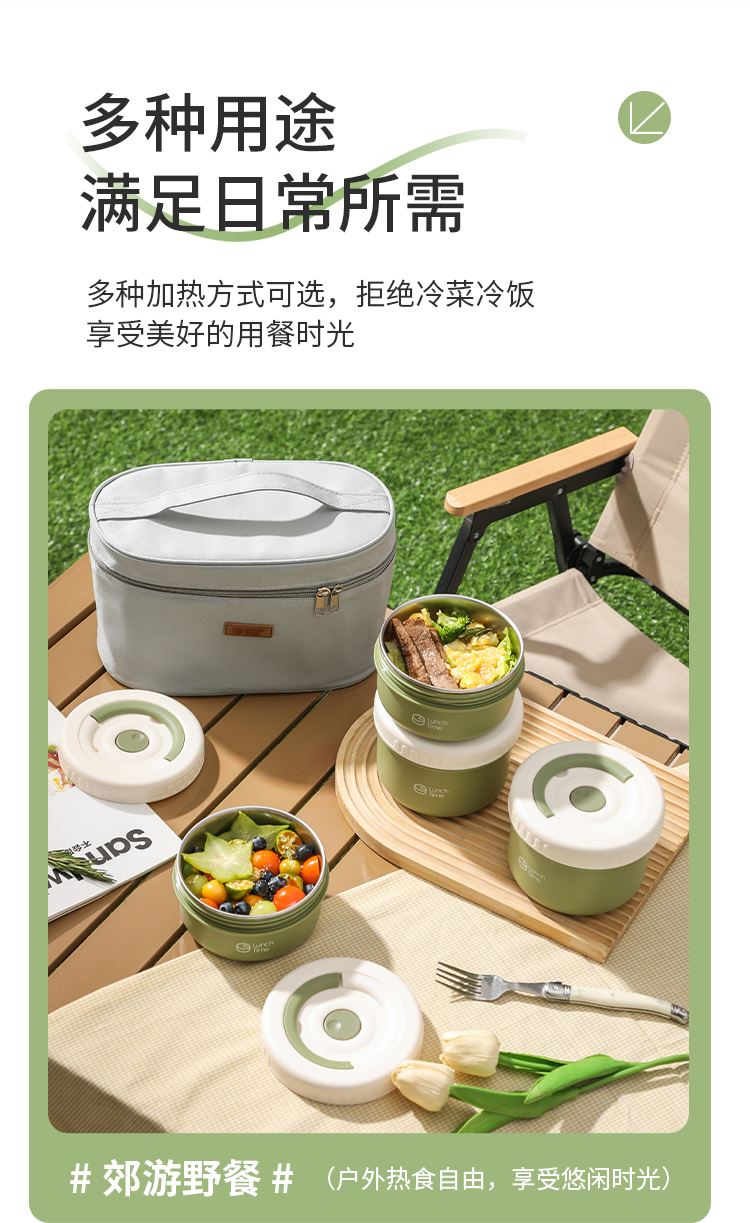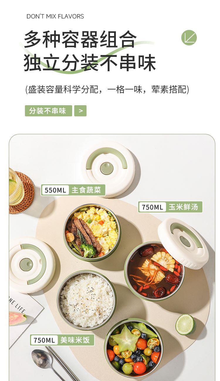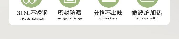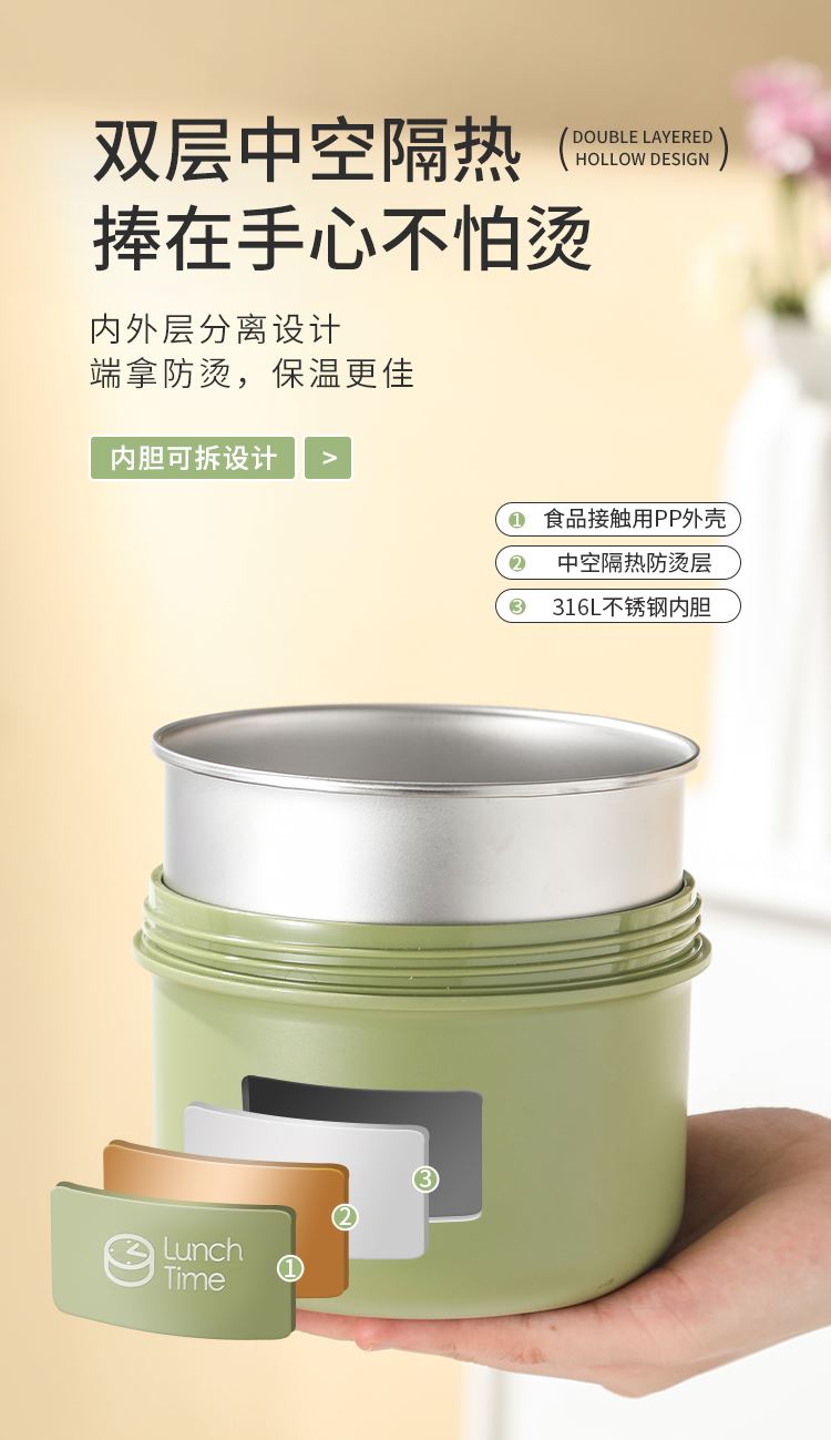 产品容量:四层2600ML 产品材质:316L不锈钢 装 箱 数:四层12套 医用316L不锈钢内碗,健康安心每一餐; 一格一味,自由搭配,营养分隔不串味; 内外层分离设计,端拿防烫,保温效果更佳; 硅胶密封圈双重保护,有效防止汤水撒漏,搭配保温袋,户外露营/学生/上班族外出带餐更方便;