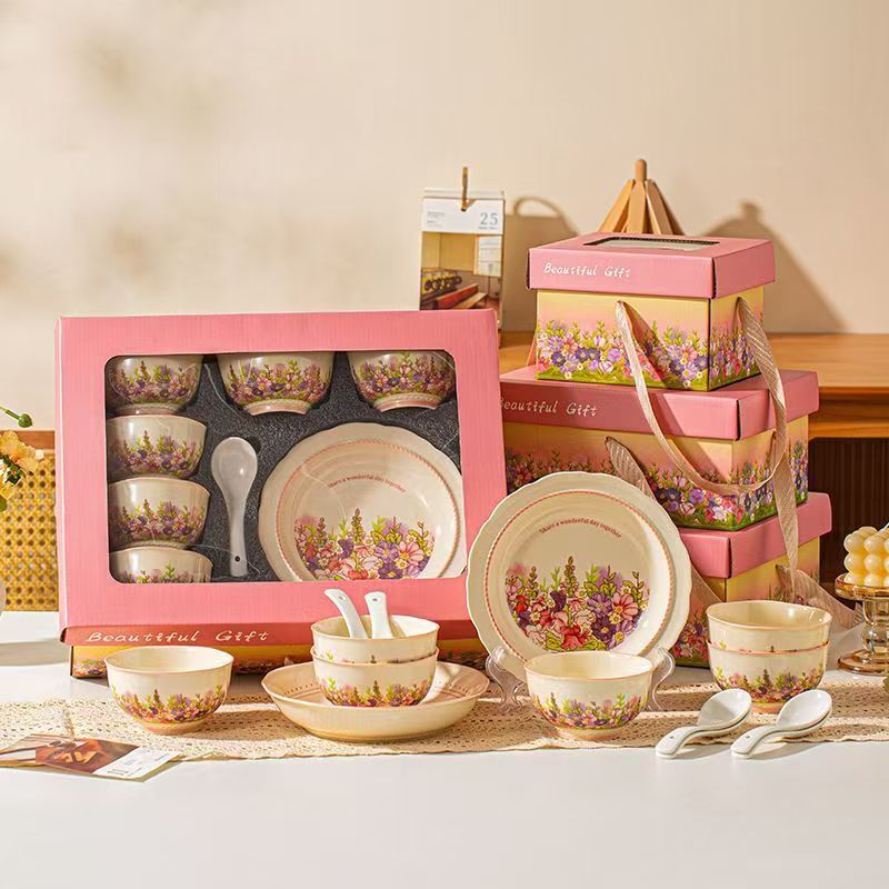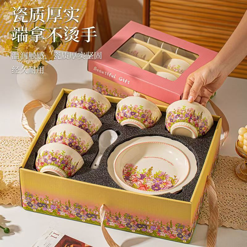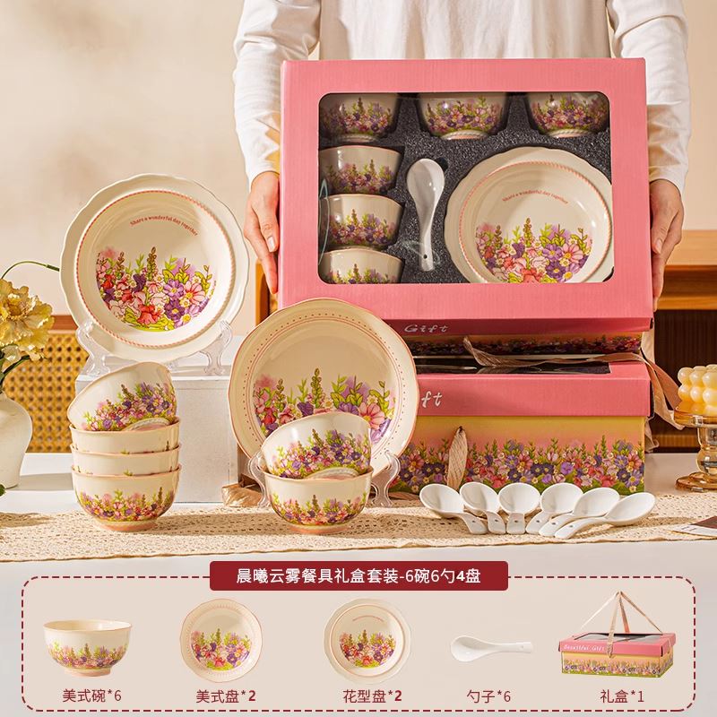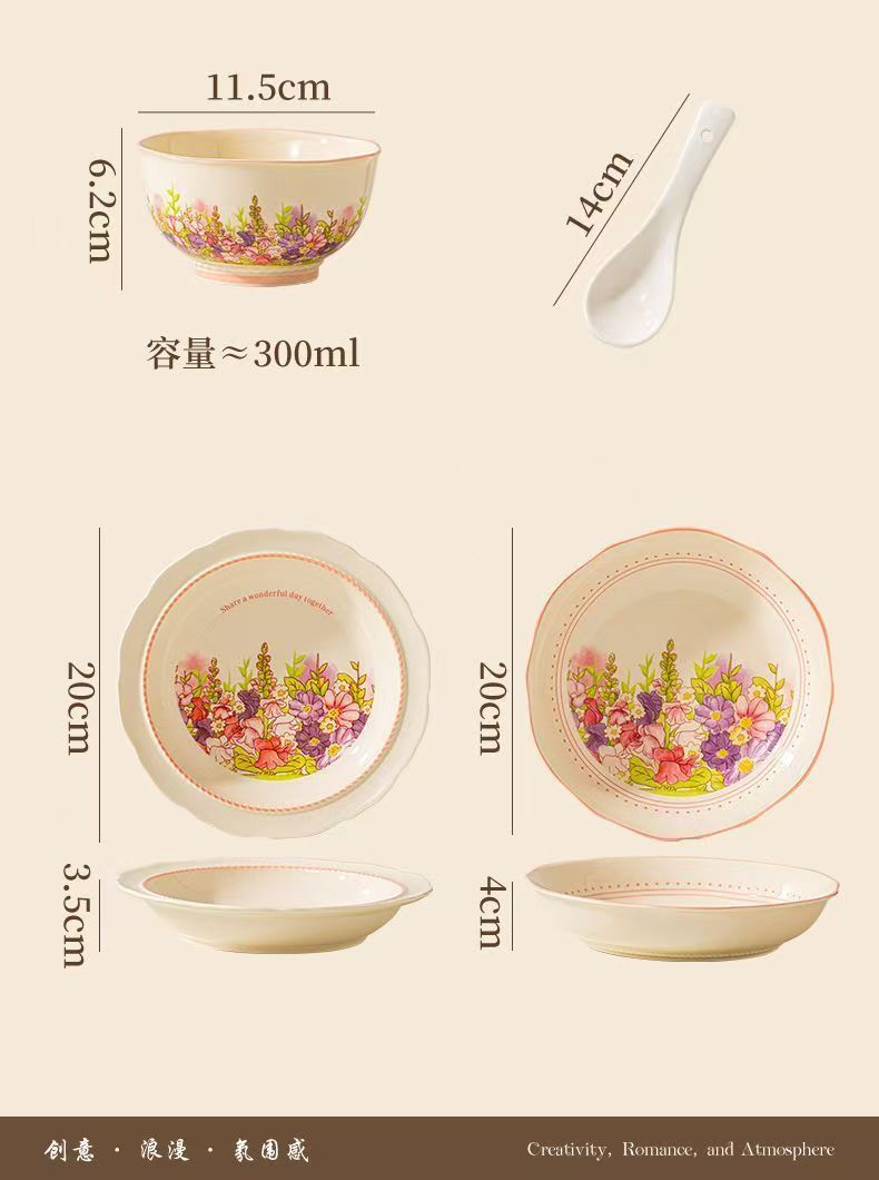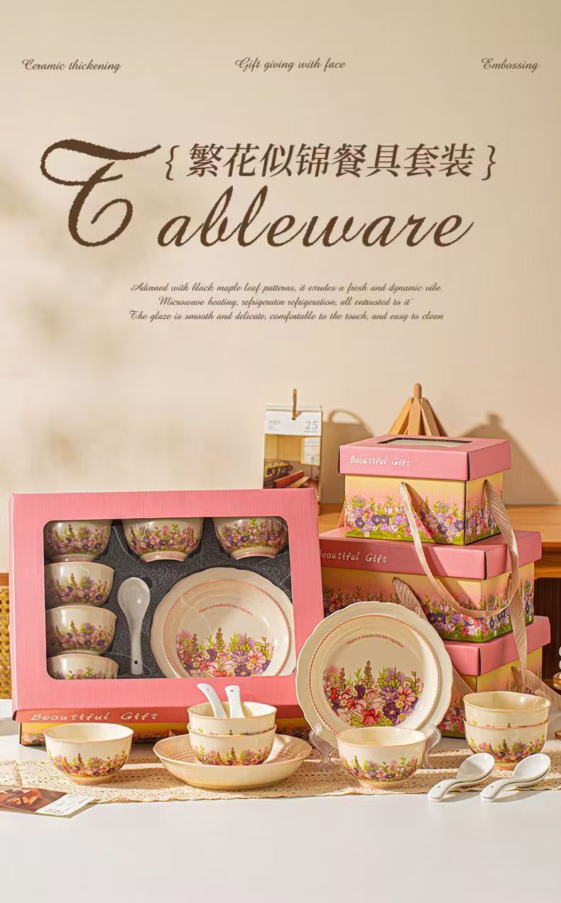产品尺寸:4.5英寸碗 8英寸盘 勺子14cm 材 质:新骨瓷 配 件: 6碗勺4盘 外箱尺寸:68*42*64cm 34kg 包装尺寸:40.3*30.3*12.3cm 产品特点: 繁花手绘设计:杯盘周身绘满缤纷花海,粉紫与暖橙交织,清新又吸睛,瞬间点亮餐桌氛围。 优质陶瓷材质:高温烧制,瓷质厚实防烫,釉面光滑易清洗,四机可进,日常使用更便捷。 精美礼盒包装:开窗透明设计 + 手提绳,送礼体面又便捷,企业采购、节日送礼批量选更划算。 完整餐具组合:碗、盘、勺齐全,满足一家人用餐需求,也适合作为乔迁、节日、婚庆,商务,生日伴手礼。