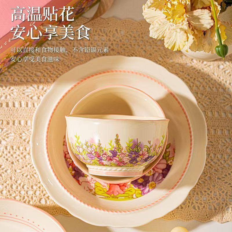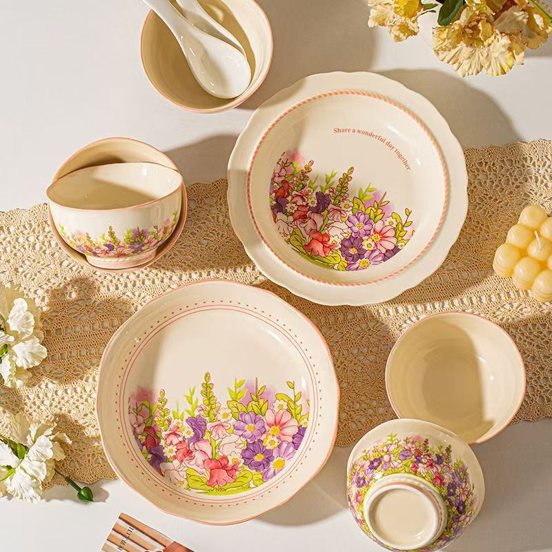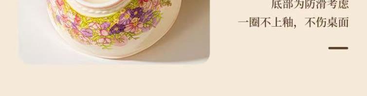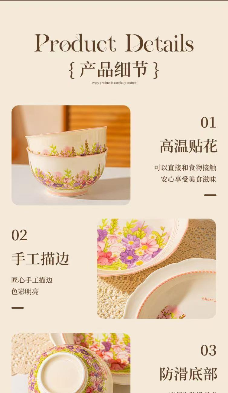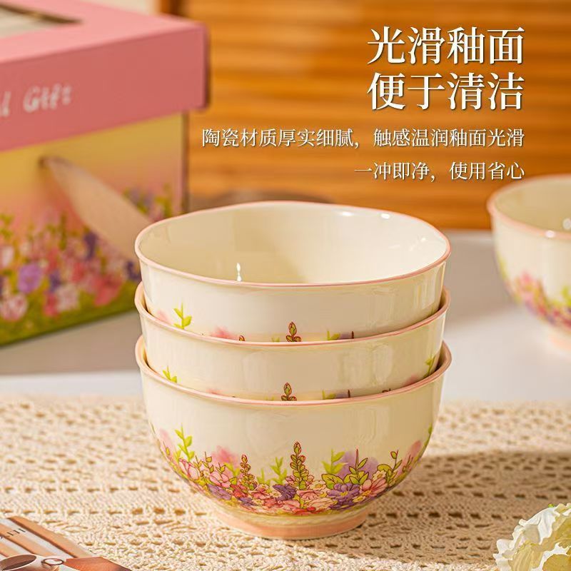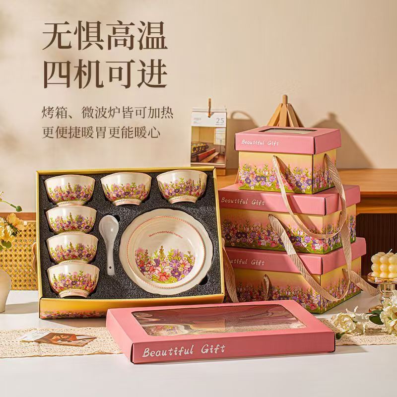 产品尺寸:4.5英寸碗 8英寸盘 勺子14cm 材 质:新骨瓷 配 件: 6碗勺4盘 外箱尺寸:68*42*64cm 34kg 包装尺寸:40.3*30.3*12.3cm 产品特点: 繁花手绘设计:杯盘周身绘满缤纷花海,粉紫与暖橙交织,清新又吸睛,瞬间点亮餐桌氛围。 优质陶瓷材质:高温烧制,瓷质厚实防烫,釉面光滑易清洗,四机可进,日常使用更便捷。 精美礼盒包装:开窗透明设计 + 手提绳,送礼体面又便捷,企业采购、节日送礼批量选更划算。 完整餐具组合:碗、盘、勺齐全,满足一家人用餐需求,也适合作为乔迁、节日、婚庆,商务,生日伴手礼。