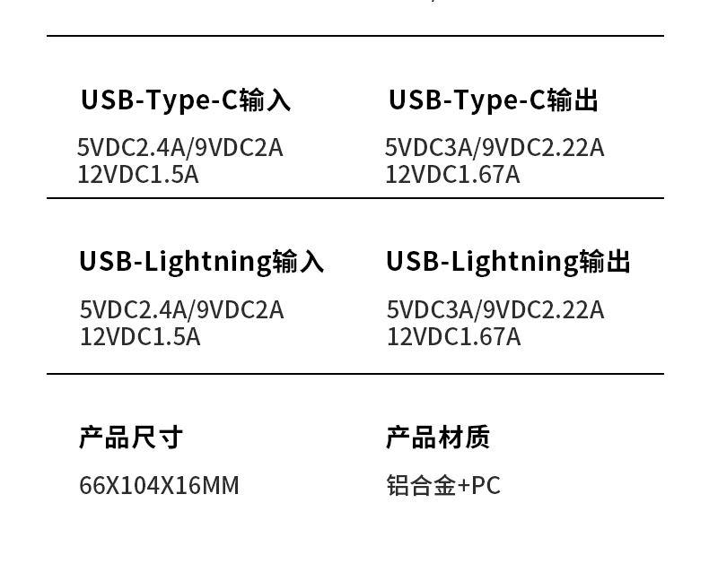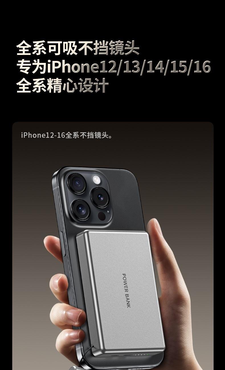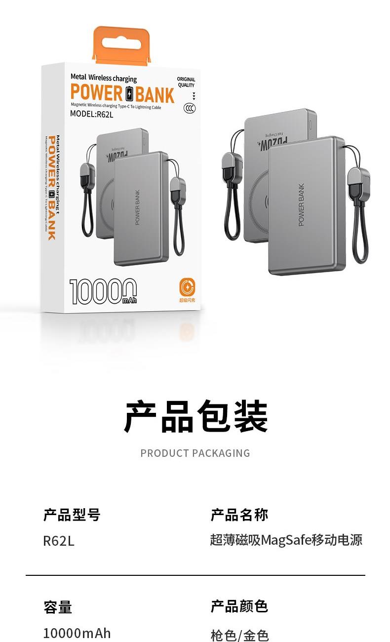 奥苏米3C认证超薄商务铝合金磁吸带线充电宝 型 号: R62L 电池 :聚合物*2pcs 电池类型 :动力电芯 容量:5000mAh/10000mAh 材质 :ABS+铝合金 尺寸 :103*65*8mm(5000毫安) 尺寸:103*65*15mm(10000毫安) 颜色 :米色 /灰色 功能特点 简约设计风格,时尚大气; 磁吸15WK快充 22.5W超级快充, 迅速充电;10000mAh锂电池,澎湃动力; 自带苹果和Type-C充电线; 一输入2输出,支持苹果15手机 智能数显查看电量