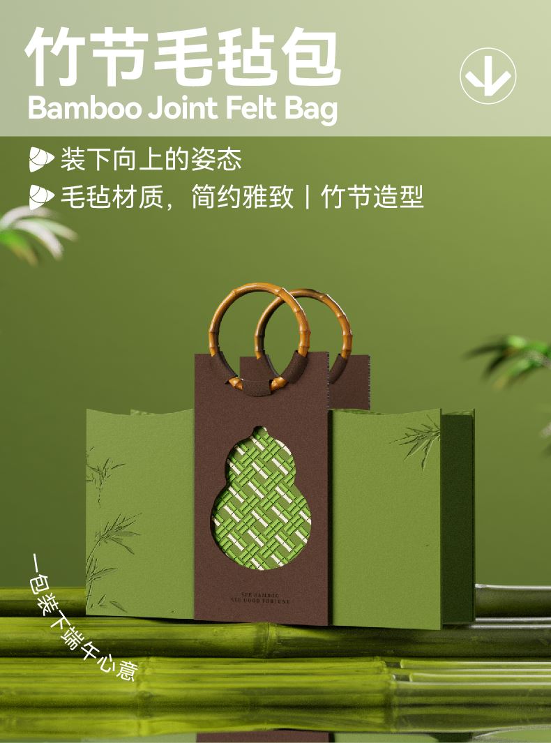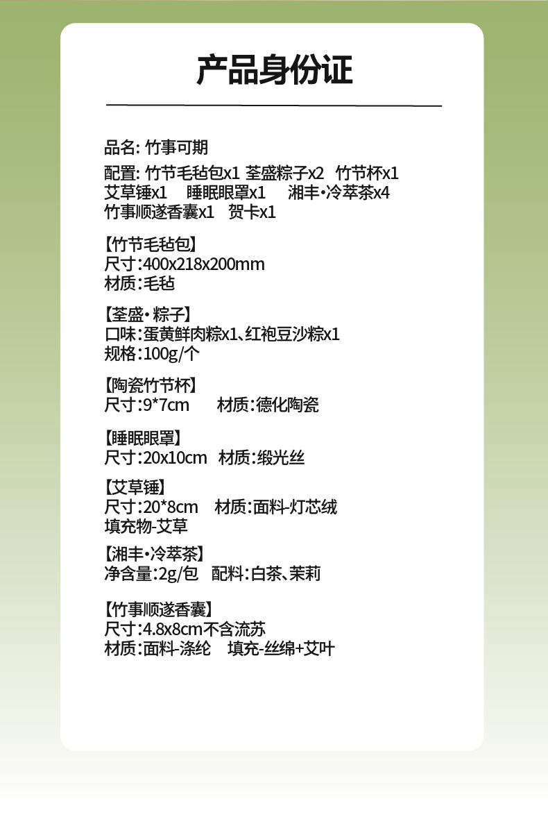 端午的绿,一半在箬叶,一半在竹骨。 我们把向上的姿态装进方寸之间 愿你的每一程,都有拔节而生的底气 与风过不折的轻盈 竹事可期,敬生长,敬安康 配: 配置一:竹节毛毡包x1 配置二:荃盛粽子x2 配置三:竹节杯x1 配置四:艾草锤x1 配置五:睡眠眼罩x1 配置六:湘丰·冷萃茶x4 配置七:竹事顺遂香囊配置八:贺卡x1