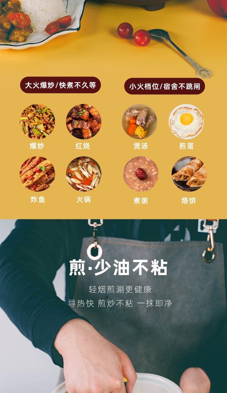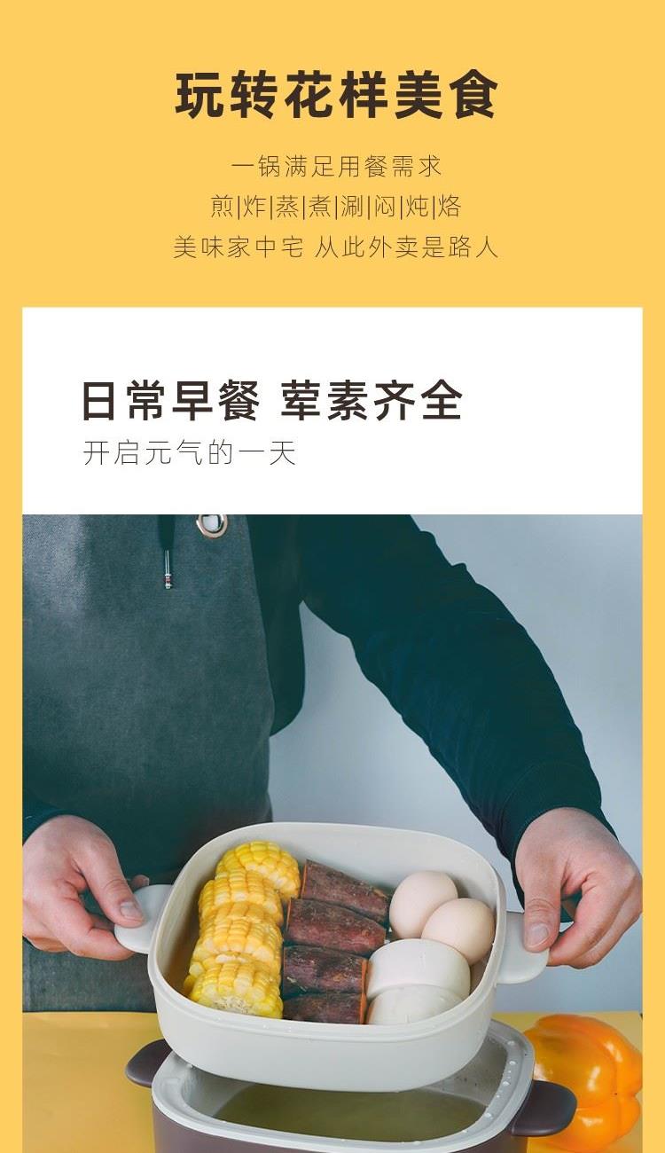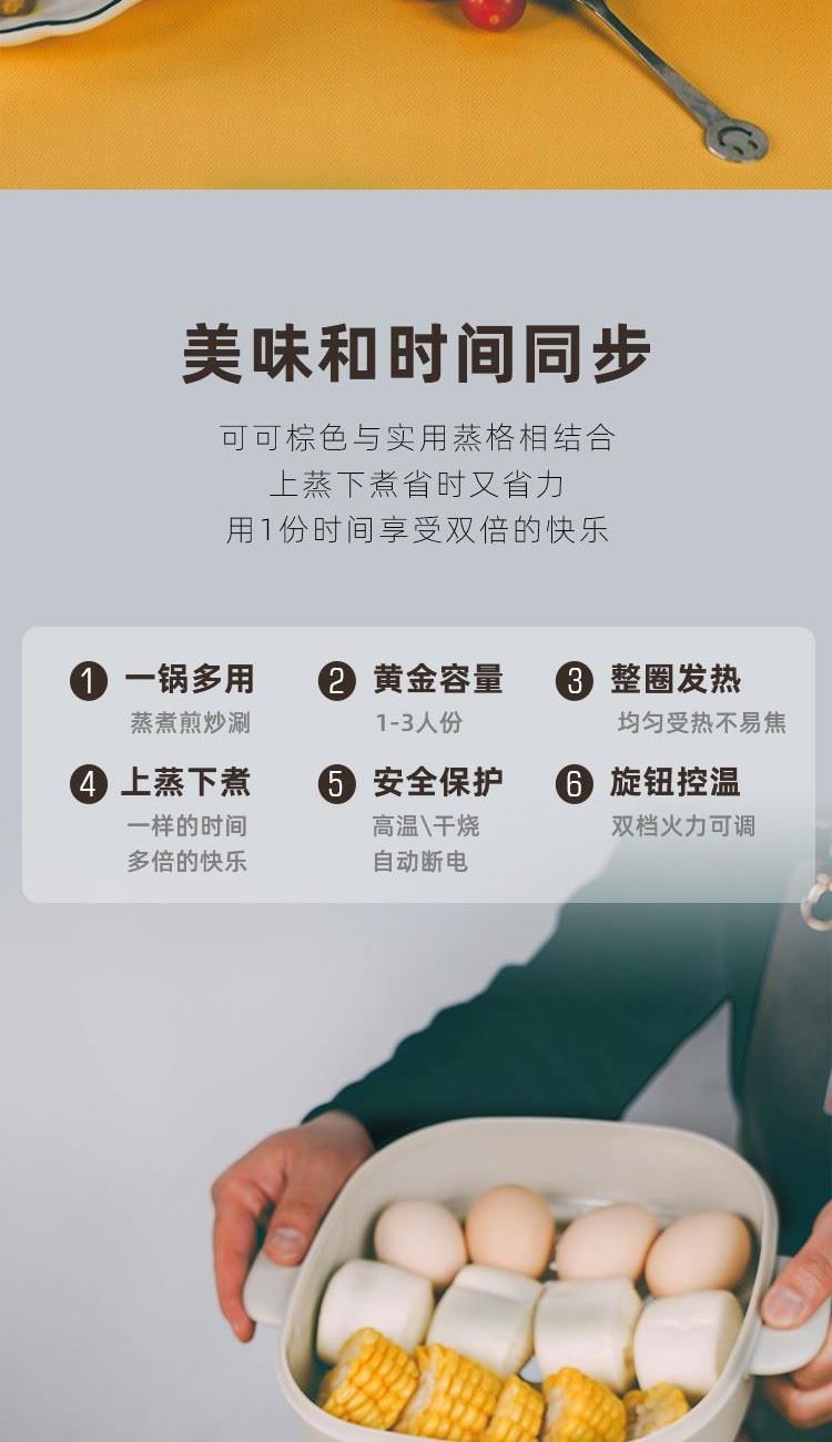 型号: EHA-4333A 额定功率:1000 W 额定电压:220V ~ 额定频率:50 Hz 额定容量:2.5L 箱 规:4个/箱 产品尺寸:280x260x230mm 1.蒸、炒、炸、煎、煮、炖、焖,一锅搞定不费心; 2.大火力加热,快速升温不等待; 3.轻烟不粘糊,易清洗; 4.大功率涮煮翻炒更便捷; 5.2.5L 黄金容量,满足小家庭需求; 6.可视锅盖,烹煮过程随心掌握; 7.简洁机身,配有分离蒸笼,美观大方。