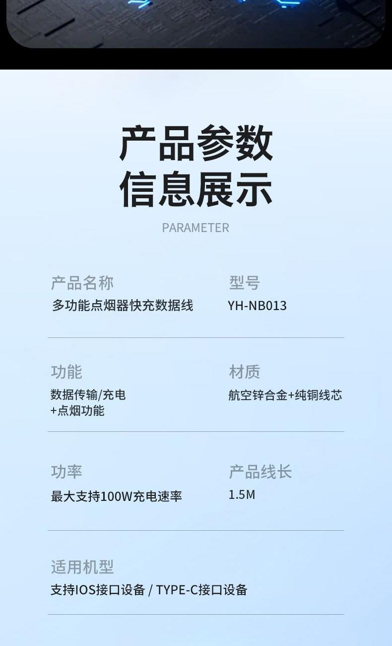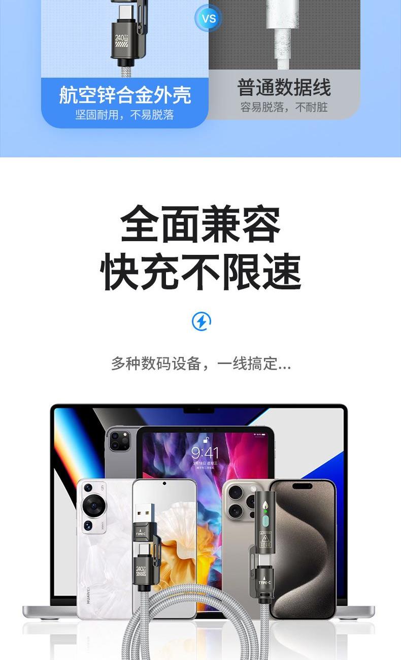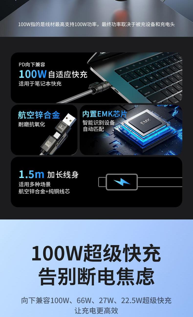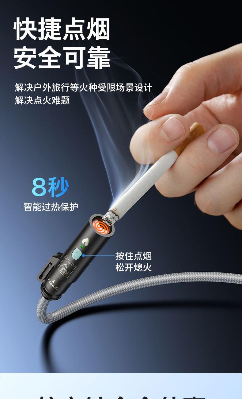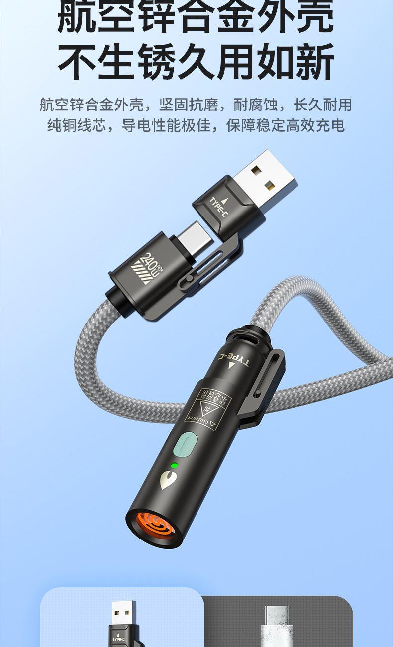 ● 锌合金+纯铜+编织,让数据线使用寿命更长,不易损坏 ● 100W快充,让您的手机可以短时间内充满电 ● 四合一的接口,配合多种机型使用 ● 挂脖,斜背,解放双手,让你转松出行,携带方便 ● 点烟器功能 ,接充电宝 ,可点燃纸巾 ,可户外野餐点火