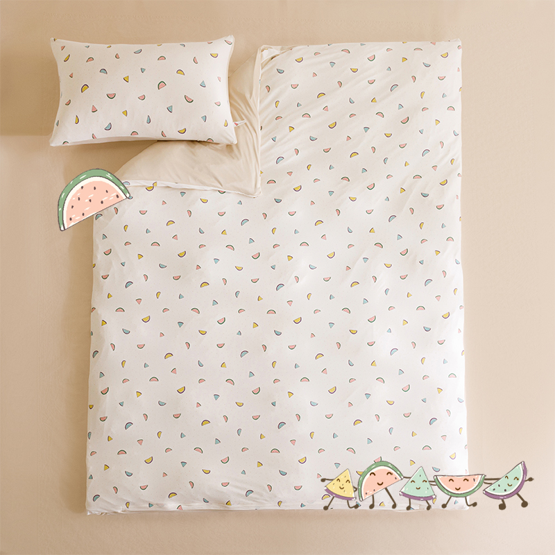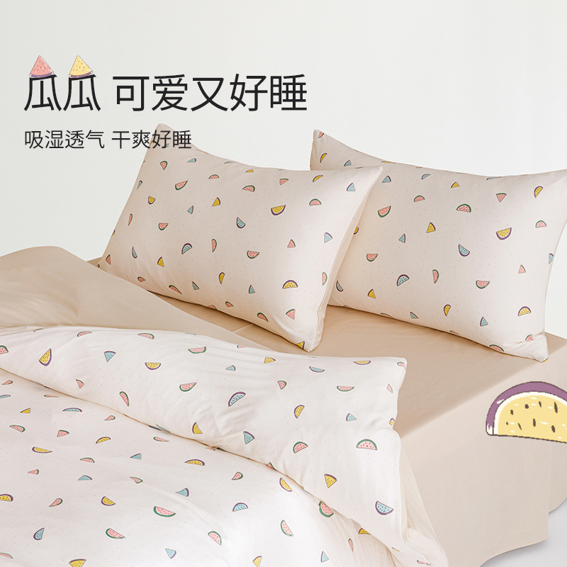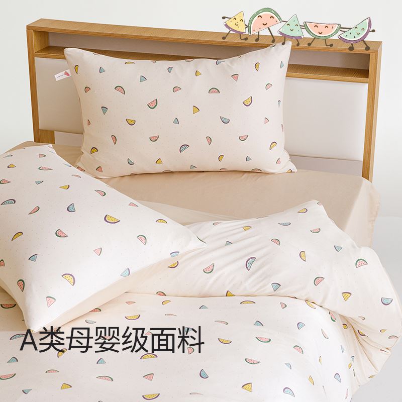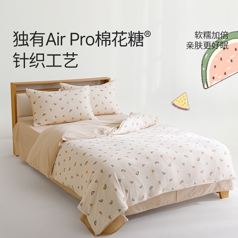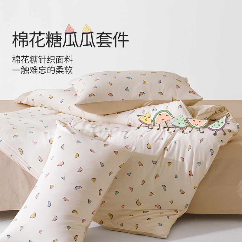面料:枕套/被套95%聚酯纤维(云倍尔科技纤维)+5%氨纶 床单全棉 规格:三件套 被套:150*200cm±5cm 枕套: 48*74cm*1 床单:200*230cm±5cm ·软,特别软,就是软FUFU~开启云感睡眠新享受,给足睡 眠安全感。面料采用艾美家云感纺纱科技针织织造; ·A类婴儿级,0甲醛,0致癌芳香胺,0荧光剂,适合全家人 睡眠使用。宝宝用好,你用也好; ·简约艺术设计,适应人群及家居氛围广。