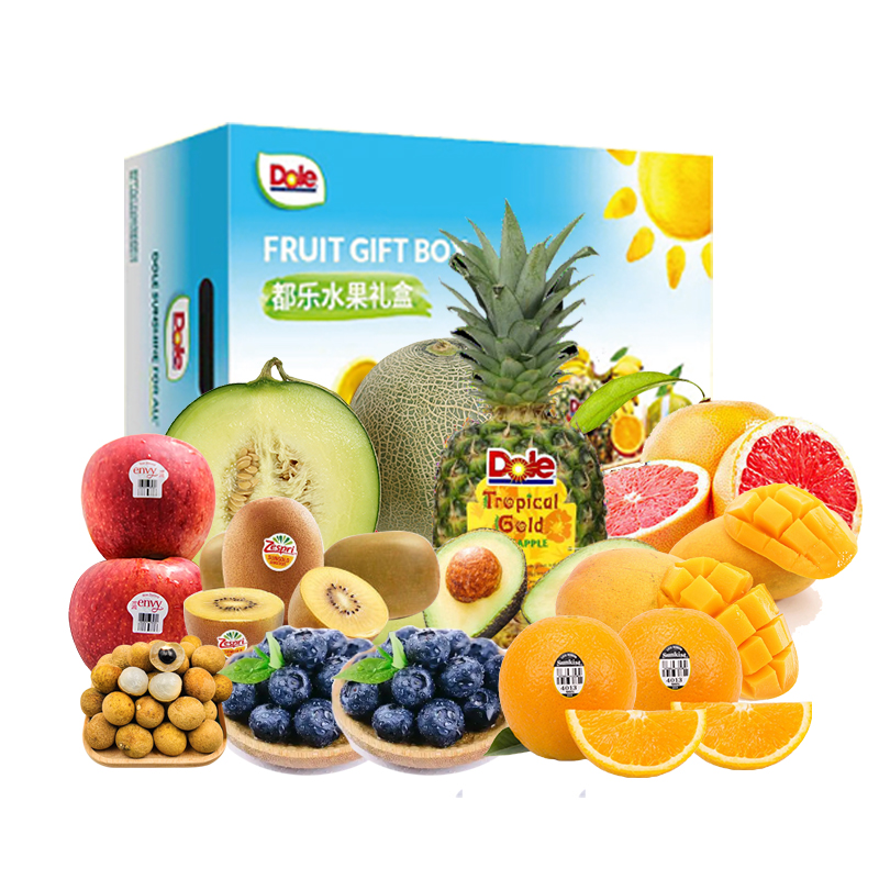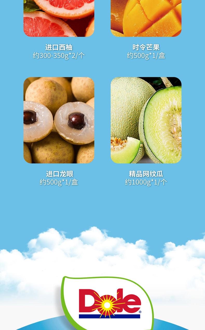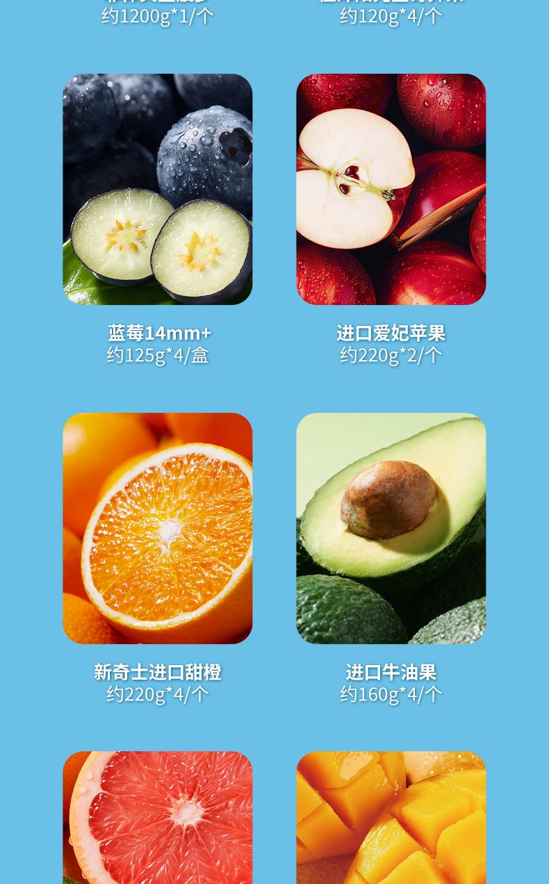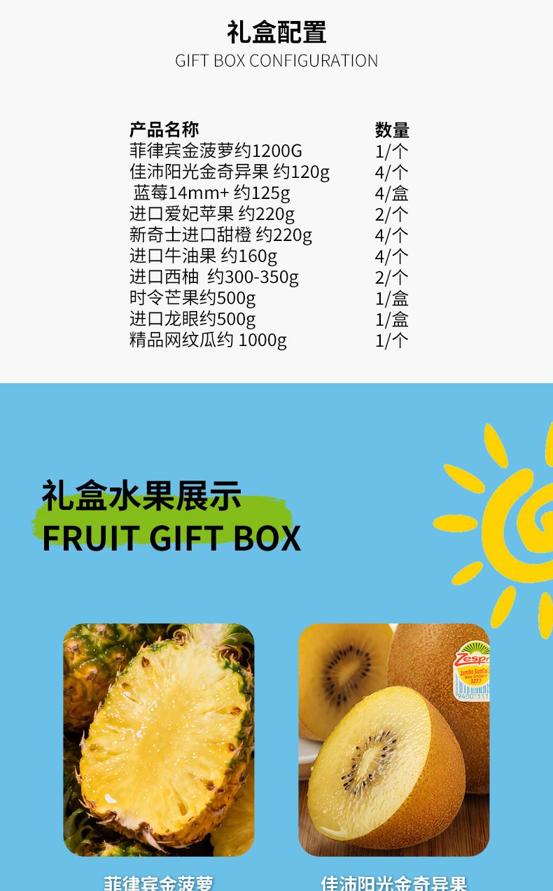 菲律宾金菠萝约1200G*1/个 佳沛阳光金奇异果 约120g*4/个 蓝莓14mm+ 约125g*4/盒 进口爱妃苹果 约220g*2/个 新奇士进口甜橙 约220g*4/个 进口牛油果 约160g*4/个 进口西柚 约300-350g*2/个 时令芒果约500g*1/盒 进口龙眼约500g*1/盒 精品网纹瓜约 1000g*1/个