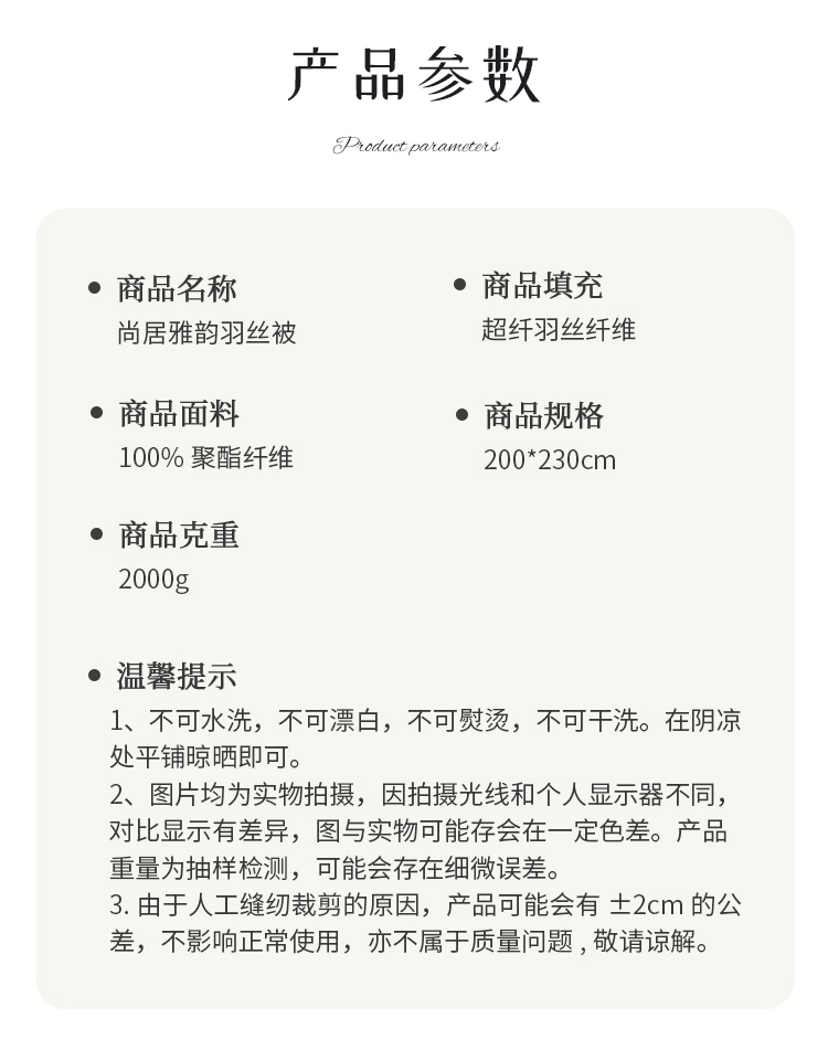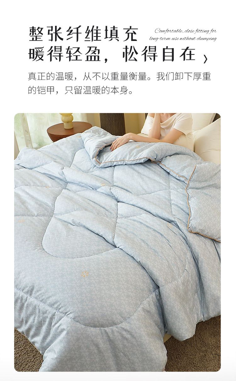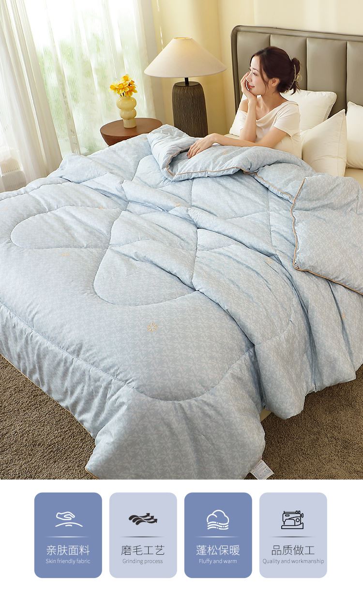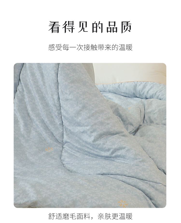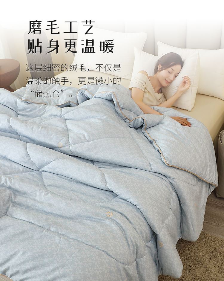 型 号:HS-B-YS11101 面 料:磨毛印花(聚酯纤维) 填 充:超纤羽丝纤维 规 格:200*230cm 克 重:2000g 产品说明: 磨毛织物是一种功能性织造方式,在保留面料原有性能的同时,通过再加工,使织物表面形成一层层细腻的短绒毛层的感觉,增加了贴身接触的柔软性和亲肤性。填充能与羽绒相媲美的超纤羽丝棉,柔软蓬松,亲肤性佳,回弹性优,贴身覆盖,轻盈且保暖。被周采用色布滚边条拼接工艺,被芯织造方法,被型工整立体,更显工整立体简约典雅,是一款居家实用型四季产品